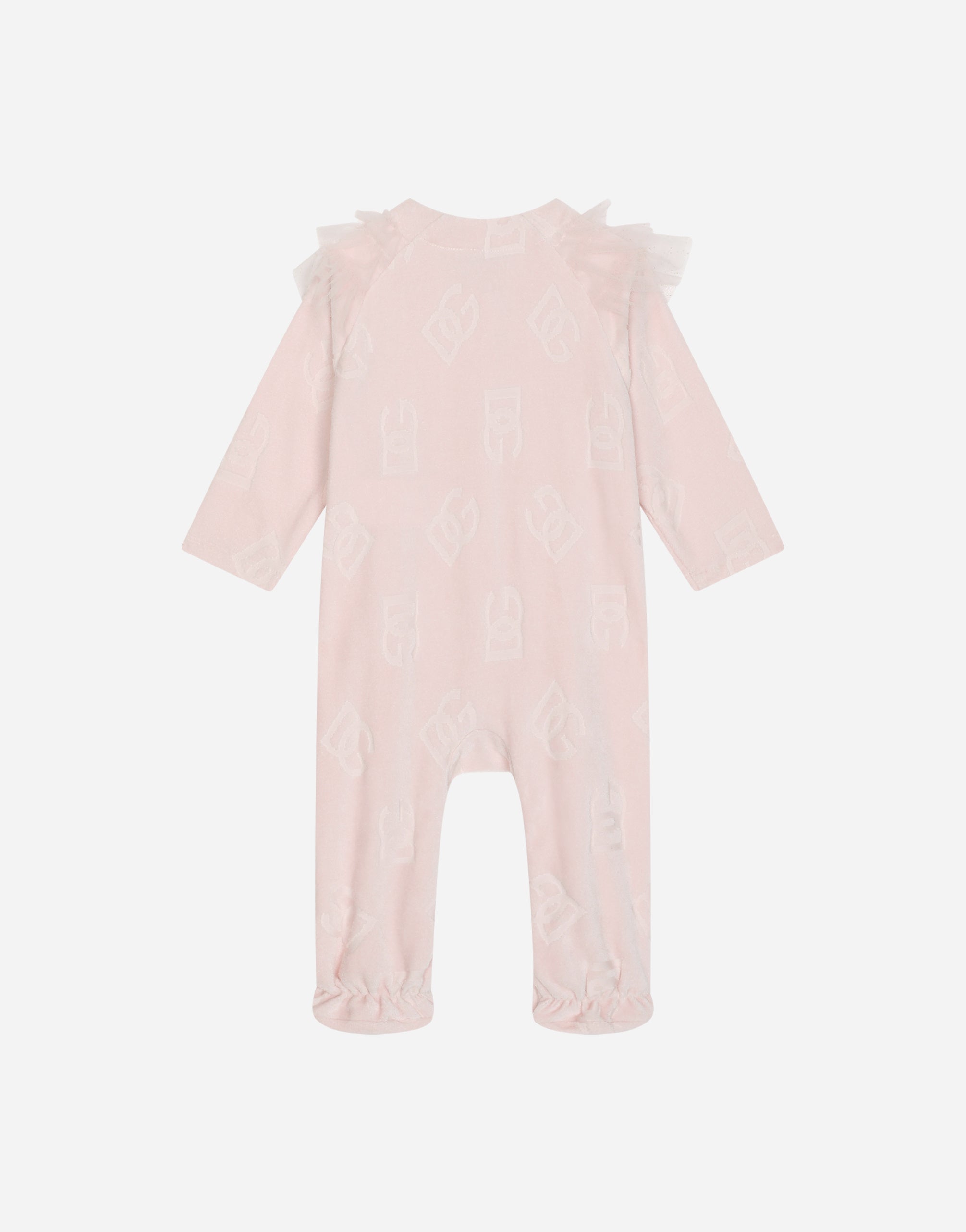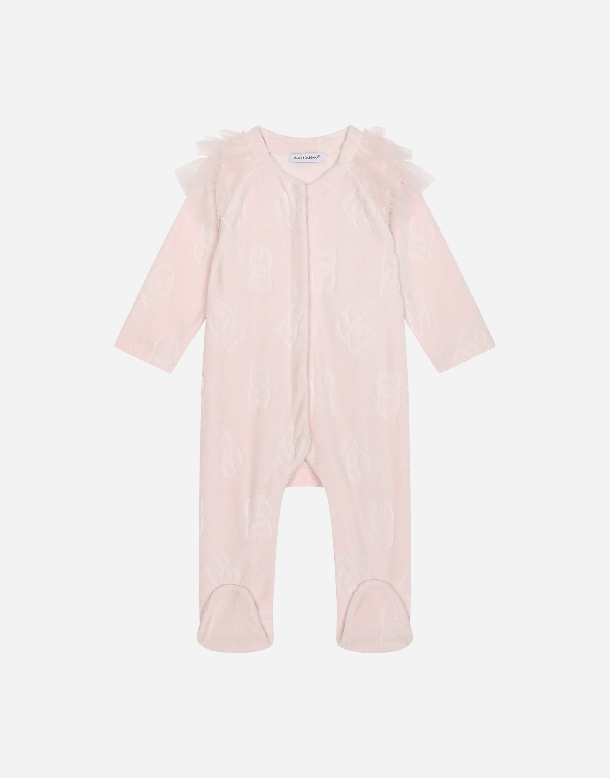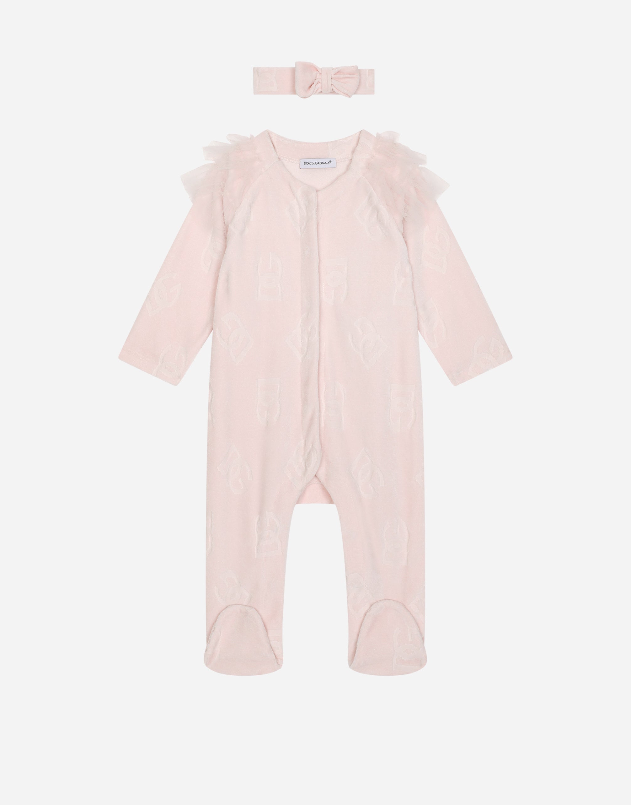 Dolce&Gabbana is presenting a new total look for kids that enhances harmony with family and nature. The Newborn collection plays around with the colors of the sky blue skies of Sicily and romantic notes of pink, where little leopards play ironically. 2-piece chenille gift set with jacquard logo: • Round neck • Long sleeves • Tulle inserts on shoulders • Unlined • Small concealed press-stud fastenings on the front and crotch Matching band with bow • The item in the size 6/9 months measures 58.5 cm in length • Item comes with a customized box • Made in Italy