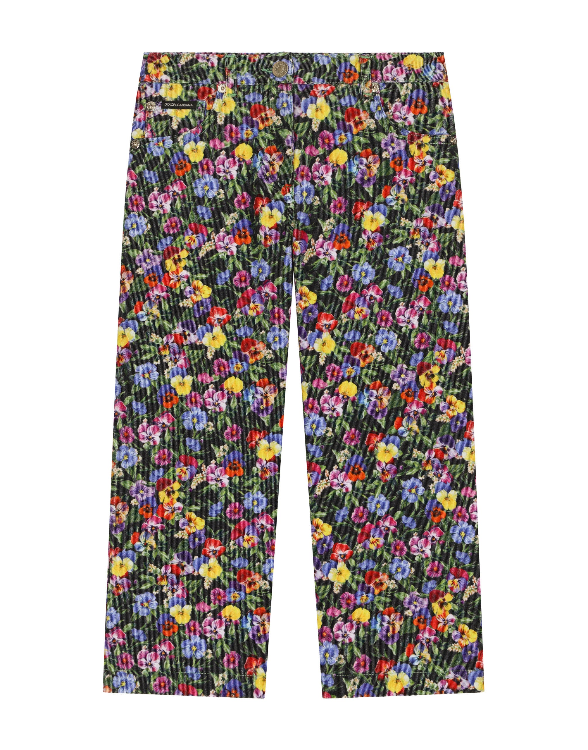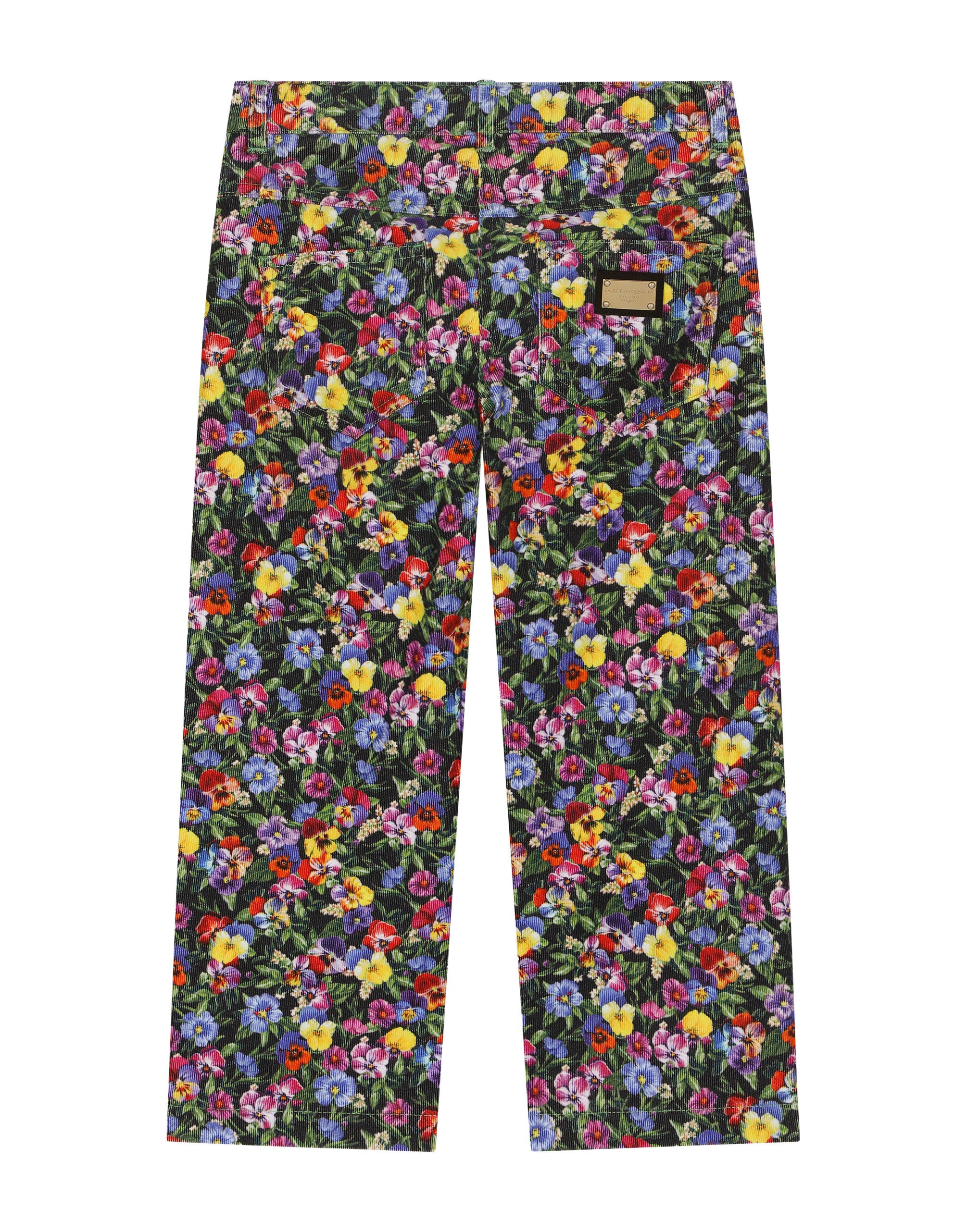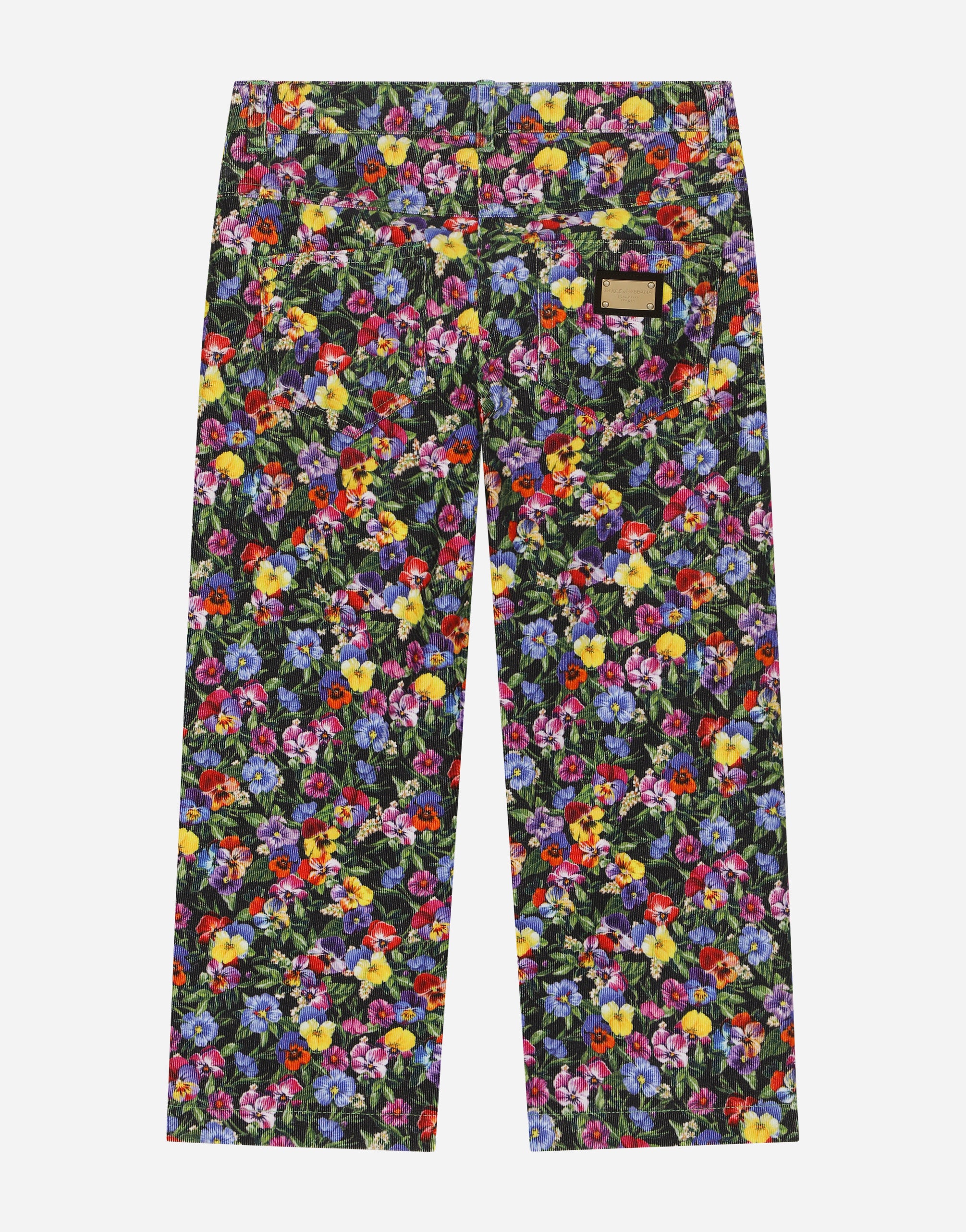 The girl’s Prateria Collection is inspired by the women’s 2001 New Hippy Collection, where the desert and meadows become bohemian and glamorous. Vaguely vintage/grunge looks come made up of volume and special pieces flaunt light printed and solid-color fabric details, smock stitching, corduroy, faux fur and a print distinguished by delicate and joyful multi-colored wildflowers for fun and ironic little girls. 5-pocket printed needlecord pants: • Multi-colored • Regular fit • Inner waistband with adjustable elastic • Logo tag on the back pocket • Unlined • Front zipper and branded button fastening • The item in the size 6 years measures 65.6 cm in length • Made in Italy The difference in the print placement that you may find on this product is a feature of Dolce&Gabbana’s “Handmade” pieces. A detail that makes every garment or accessory unique and exclusive.