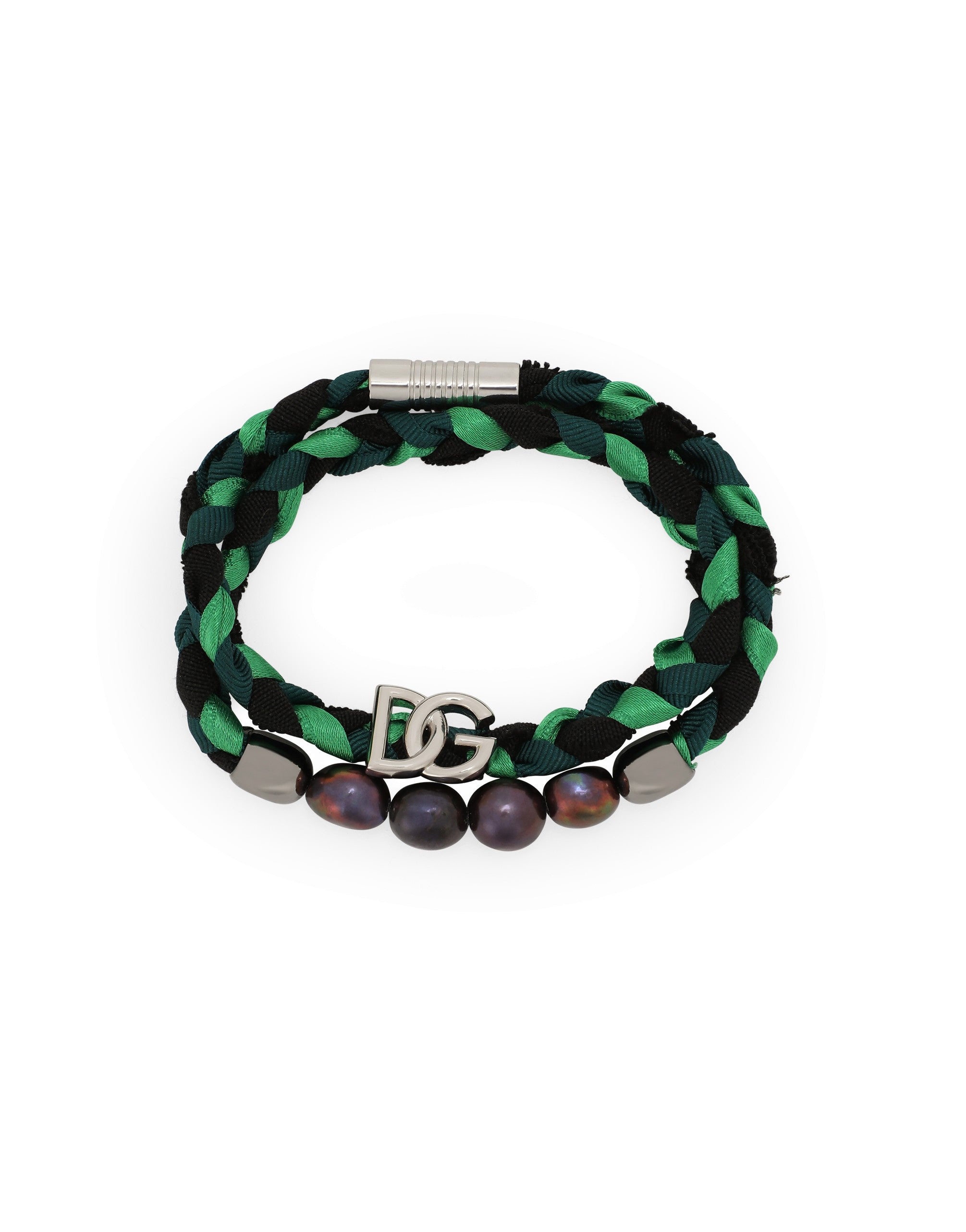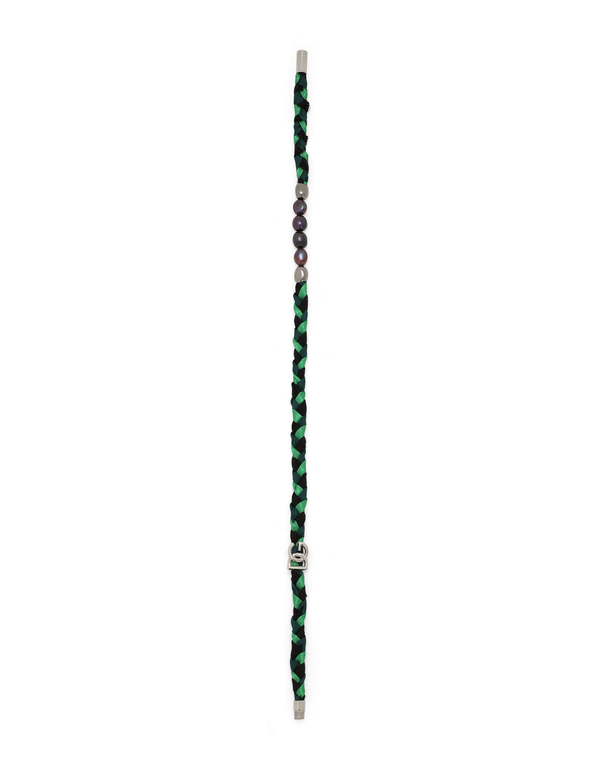 The Banano collection immerses us in the beauty of nature and, thanks to its vibrant colors, it transports us in the tropical cities, distinguished by Art Deco villas and lush gardens. Vintage 1940s graphics, fabrics and special volumes for the stylish man who loves to tell his story through the craftsmanship, beauty and originality of his chosen garments. This is how the designers recount a fantastic place, the tropics, a magical locale where you can dream, where nature spoils us with its unique colors. Double-strand interwoven fabric bracelet: • Silver and green • Metal magnetic fastening • Gray baroque freshwater pearls • Metal DG logo and beads • Engraved logo • Nickel-free and hypoallergenic materials • Made in Italy