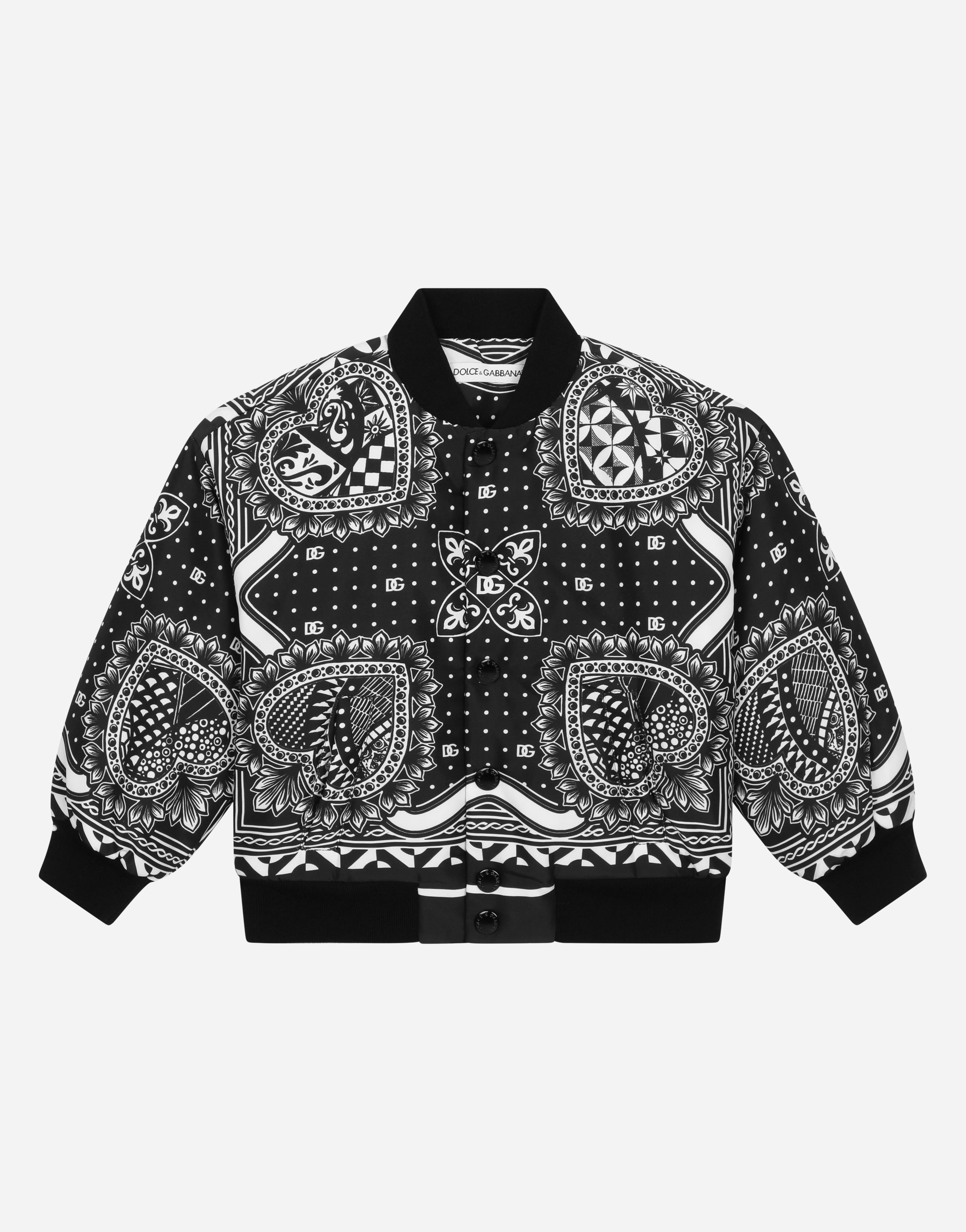 Dolce&Gabbana is rewriting the contemporary rules by dismantling the old and inventing the new. The punk rock aesthetic merges with the brand’s signature style and updates it with ultra-graphic logos and exclusive prints, creating a new vision that celebrates uniqueness and the freedom to express yourself. The iconic bandanna print embellishes this nylon bomber jacket. • Maxi-fit • Stretch knit bomber-style collar • Long sleeves • Stretch knit hem and cuffs • Front welt pockets with concealed press-stud fastening • Lined • Padded • Press-stud fastenings on the front • The item in the size 3 years measures 43 cm from the shoulder seam • Made in Italy