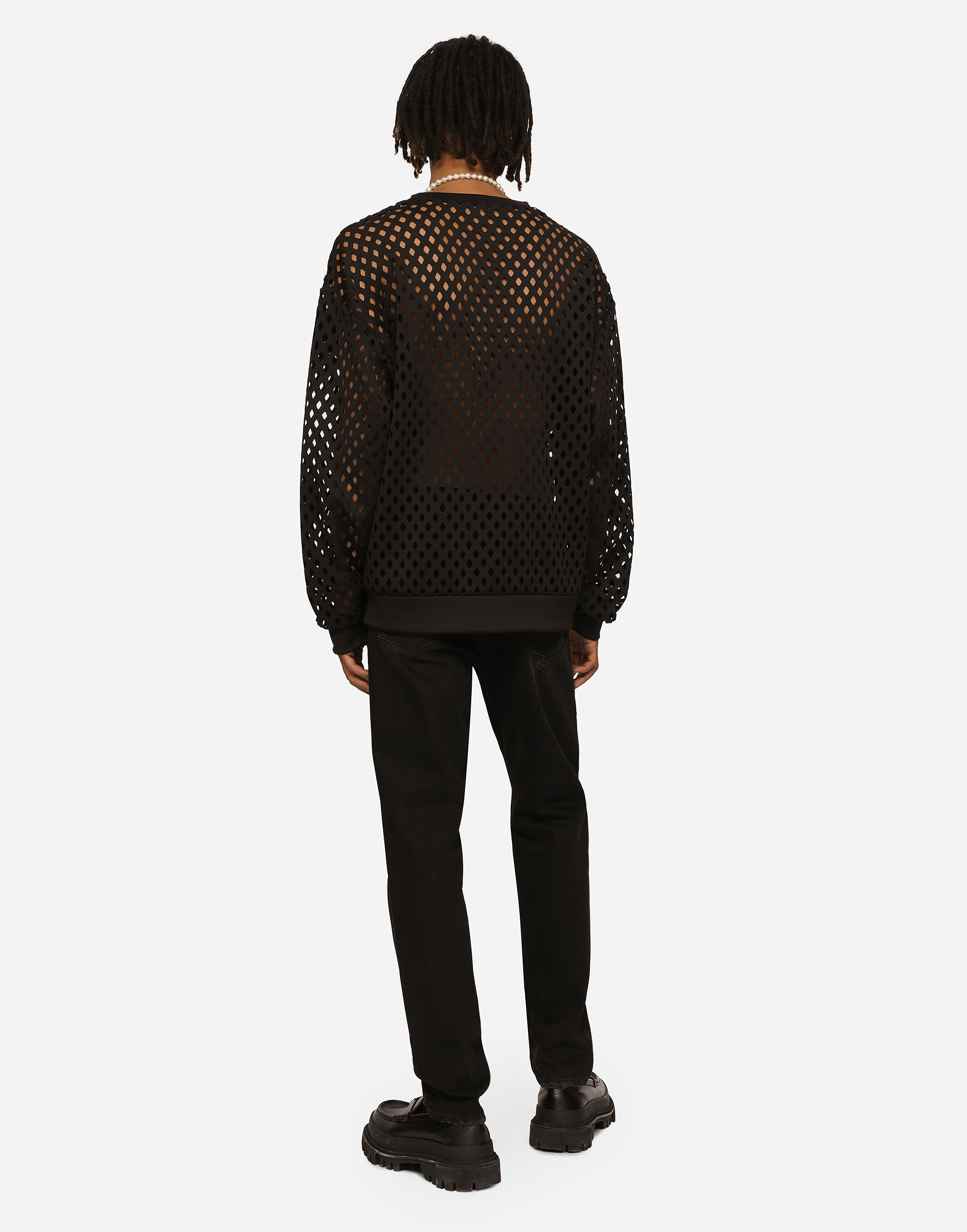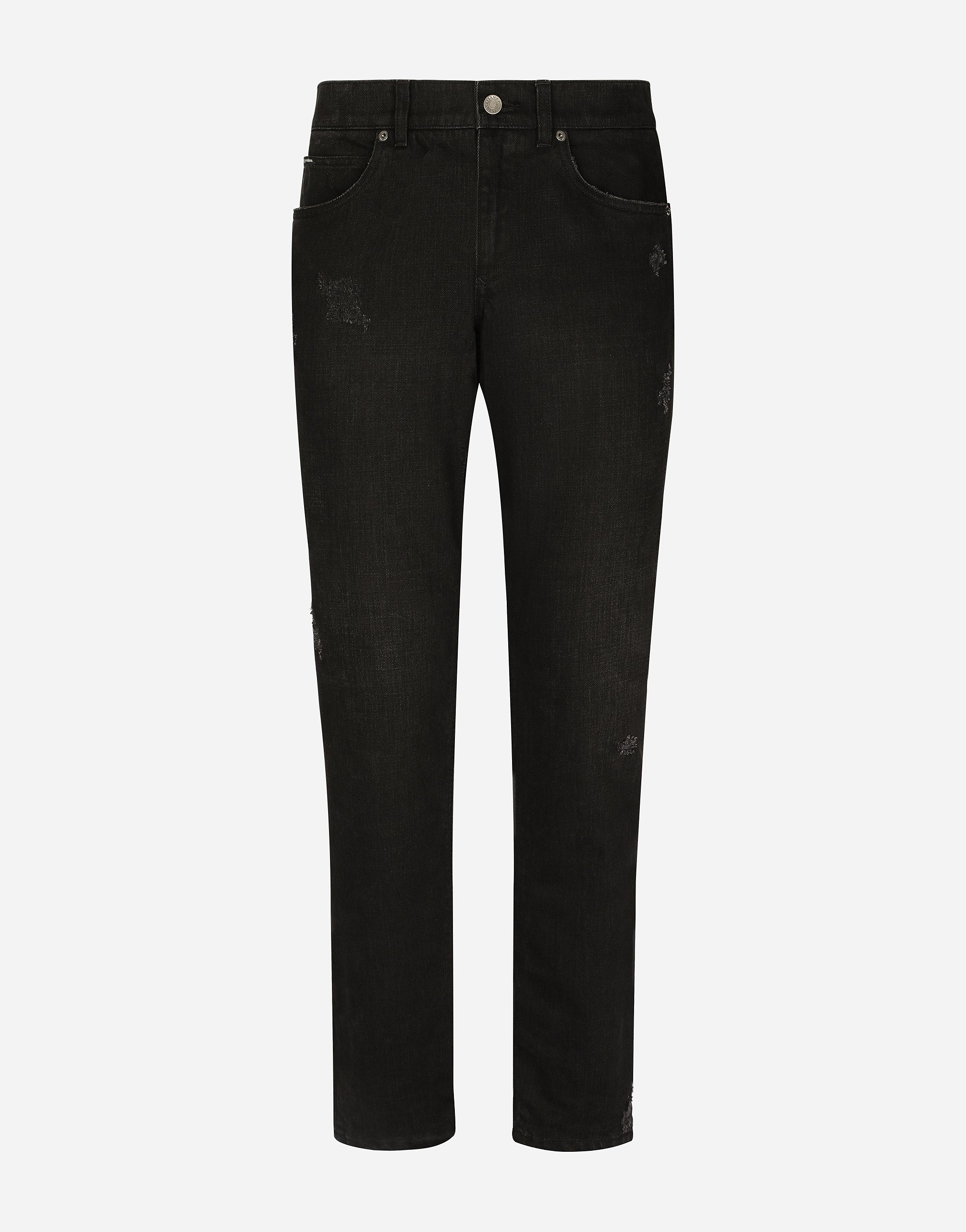 In the “Black Sicily” collection, the flawless and iconic Nero Sicilia black becomes Nero Urbano black. Paired with the Hawaiian prints and the DG Heart, all the featured looks flaunt and reveal new ways of pairing this color with a new current, innovative and utterly contemporary way. Five-pocket regular-fit jeans in black wash denim with abrasions: • Regular fit • Fly-covered zipper and button fastening • Metal Dolce&Gabbana logo tag on the back • The item measures 105 cm on the outer leg and the hem is 17.5 cm wide on a size IT 48 • The model is 185 cm tall and wears a size IT 48 • Made in Italy