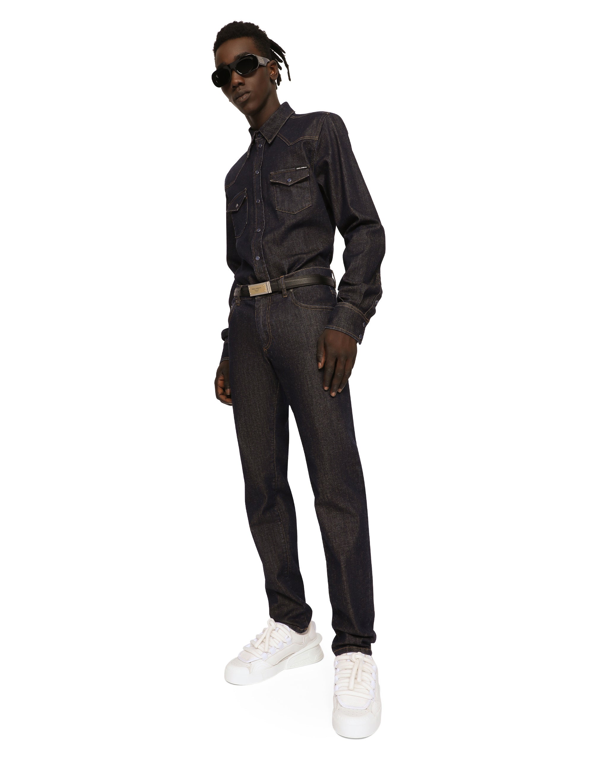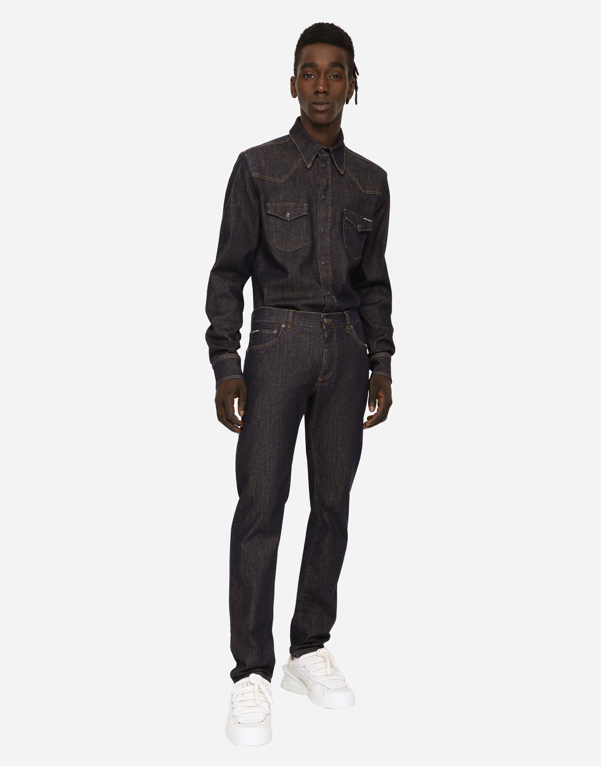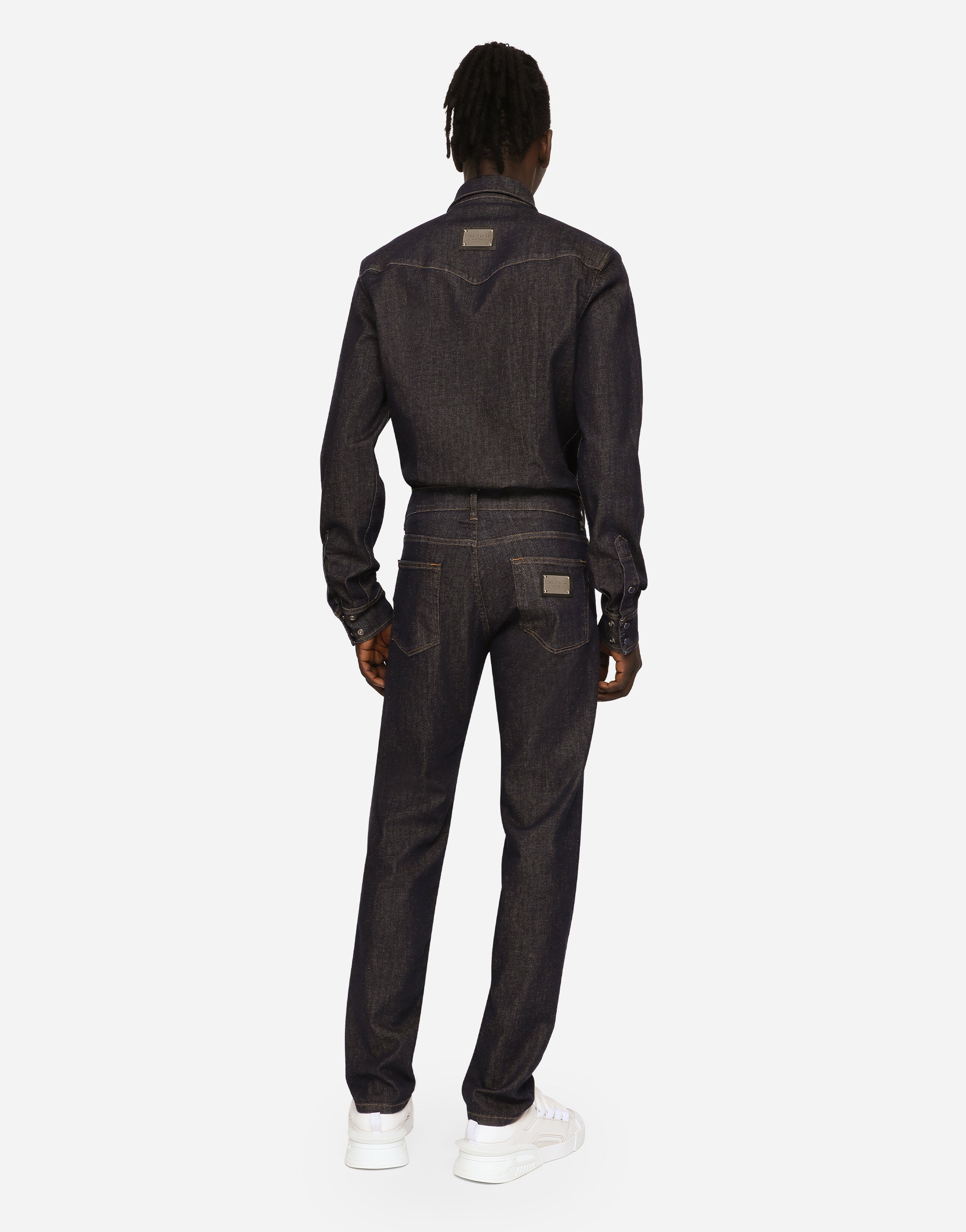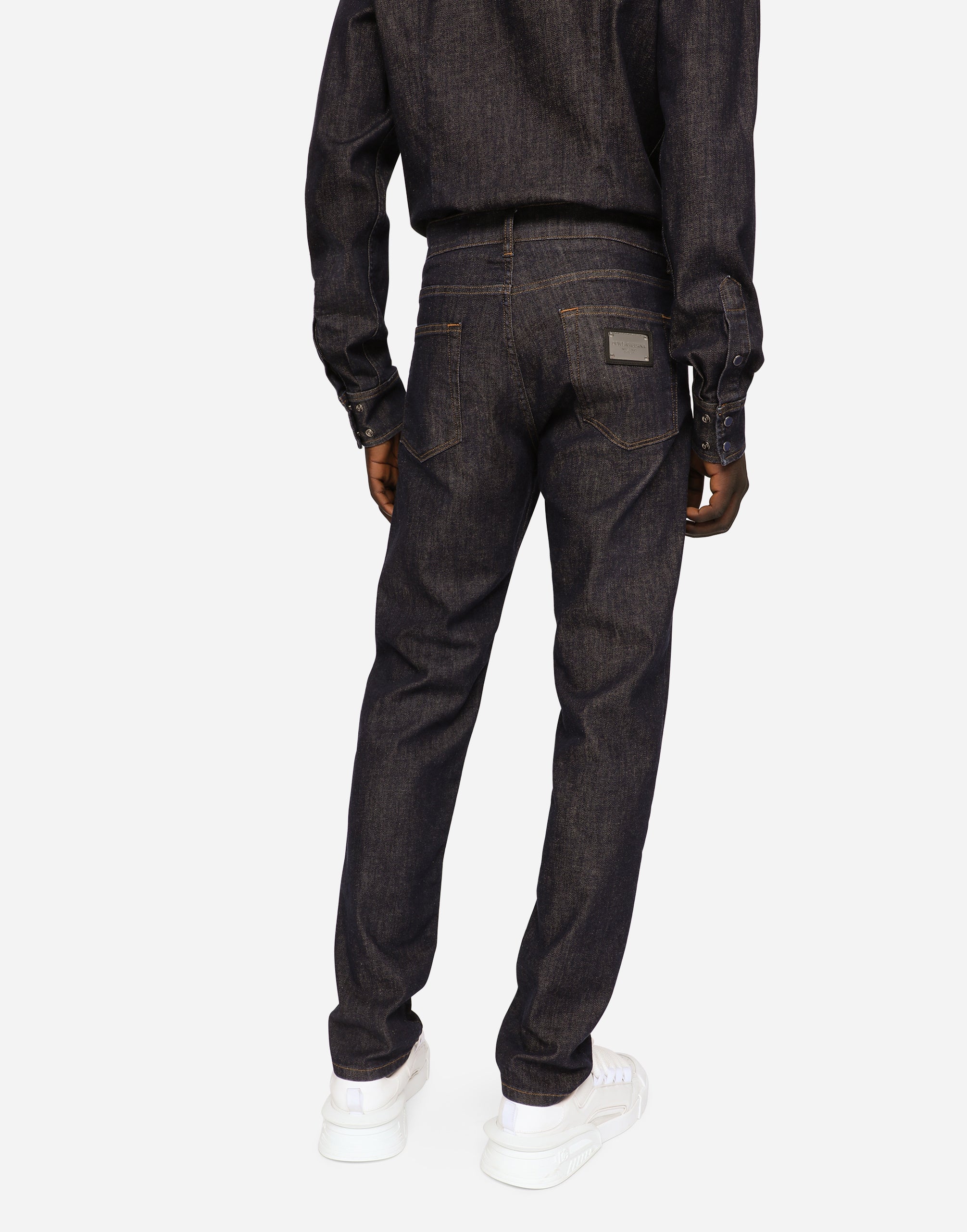 The “Denim” collection catapults us into a new reality of oversize looks, contrasting washes, raw-cut accents, patch details and layering. Denim, an ever-present staple of the everyday closet, has been broken down and reassembled in a contemporary way, complete with logo tag embellishment. Five-pocket slim-fit jeans in blue stretch denim: • Regular fit • Fly-covered zipper and button fastening • Metal Dolce&Gabbana logo tag on the back • The item measures 105 cm on the outer leg and the hem is 17 cm wide on a size IT 48 • The model is 185 cm tall and wears a size IT 48 • Made in Italy