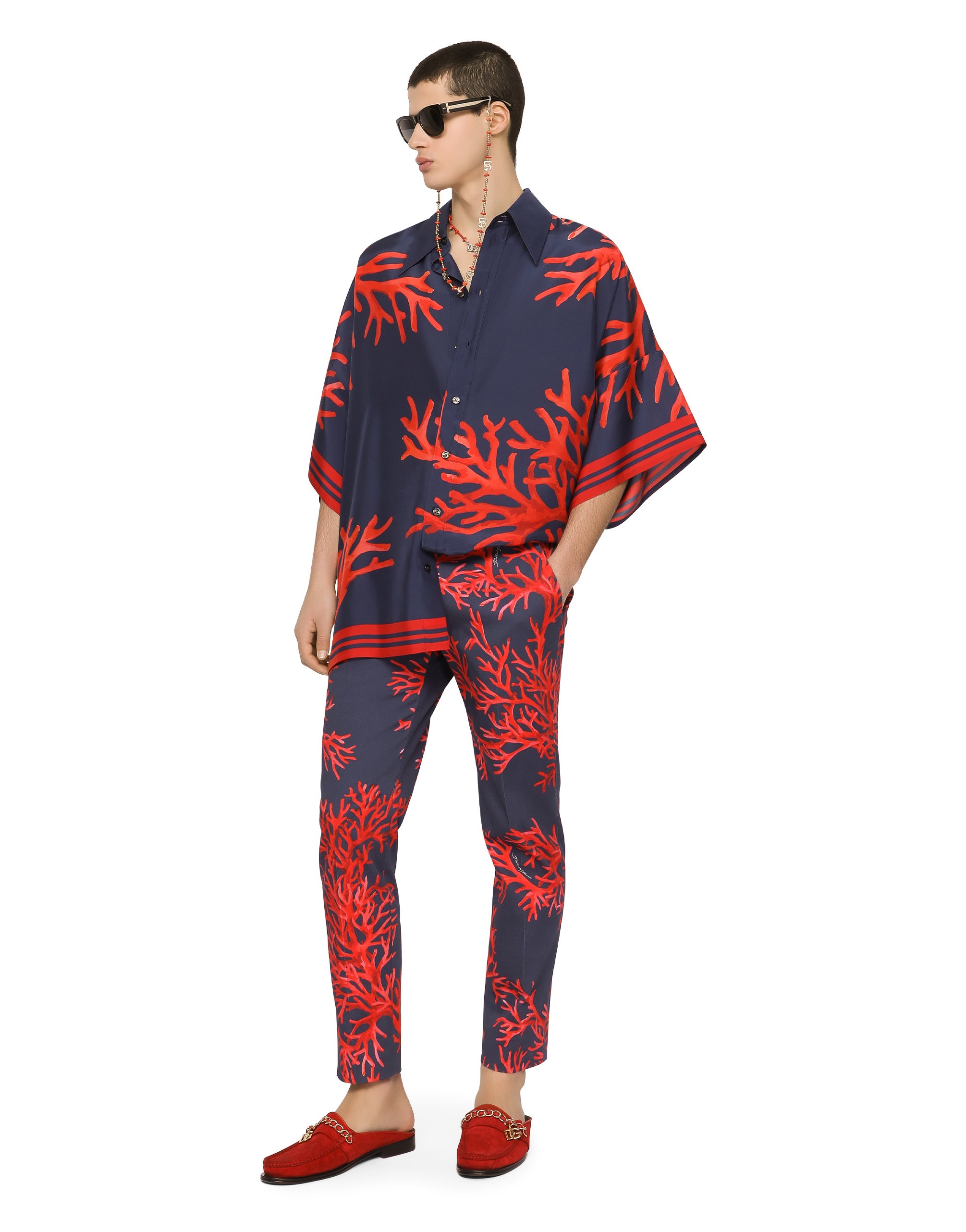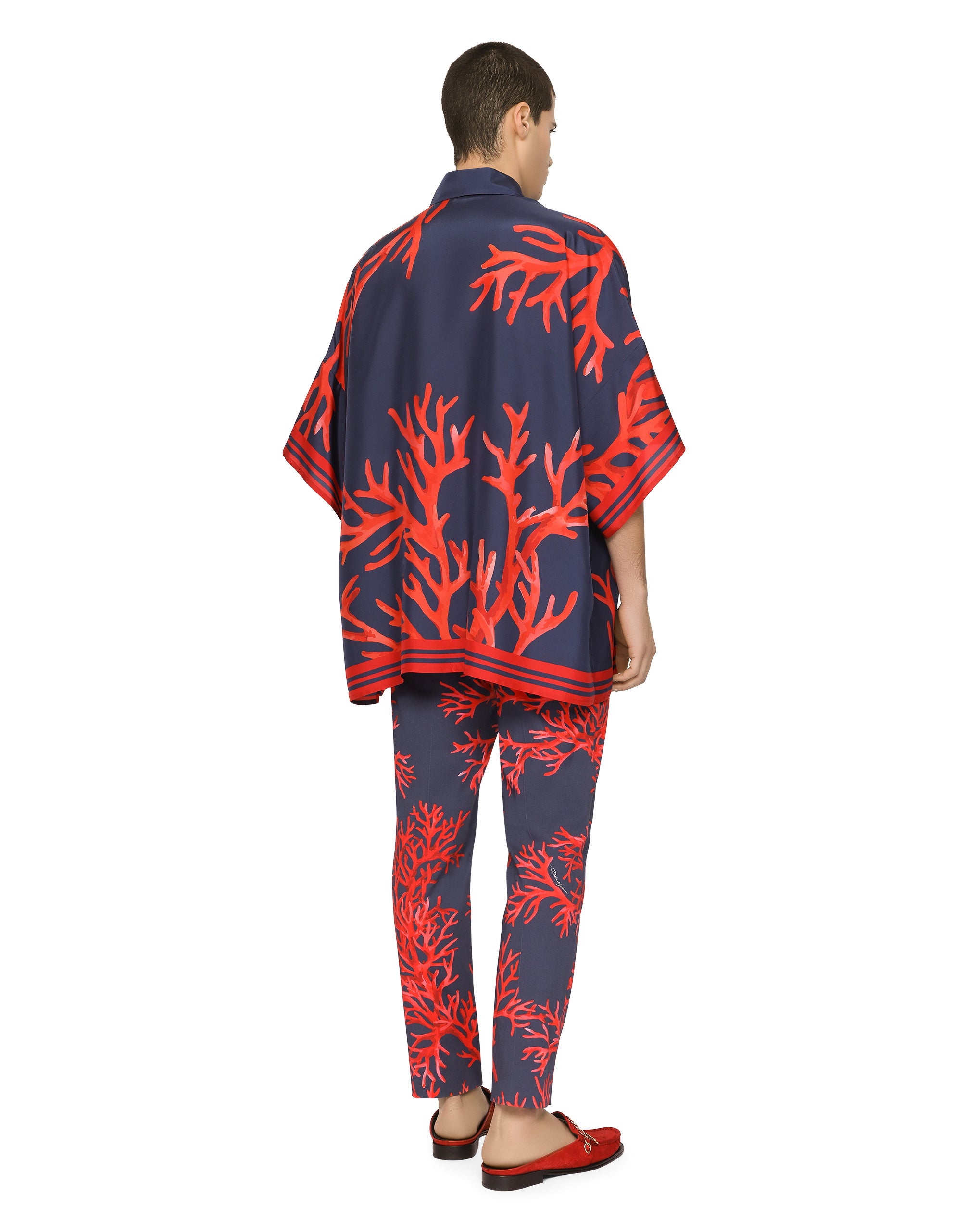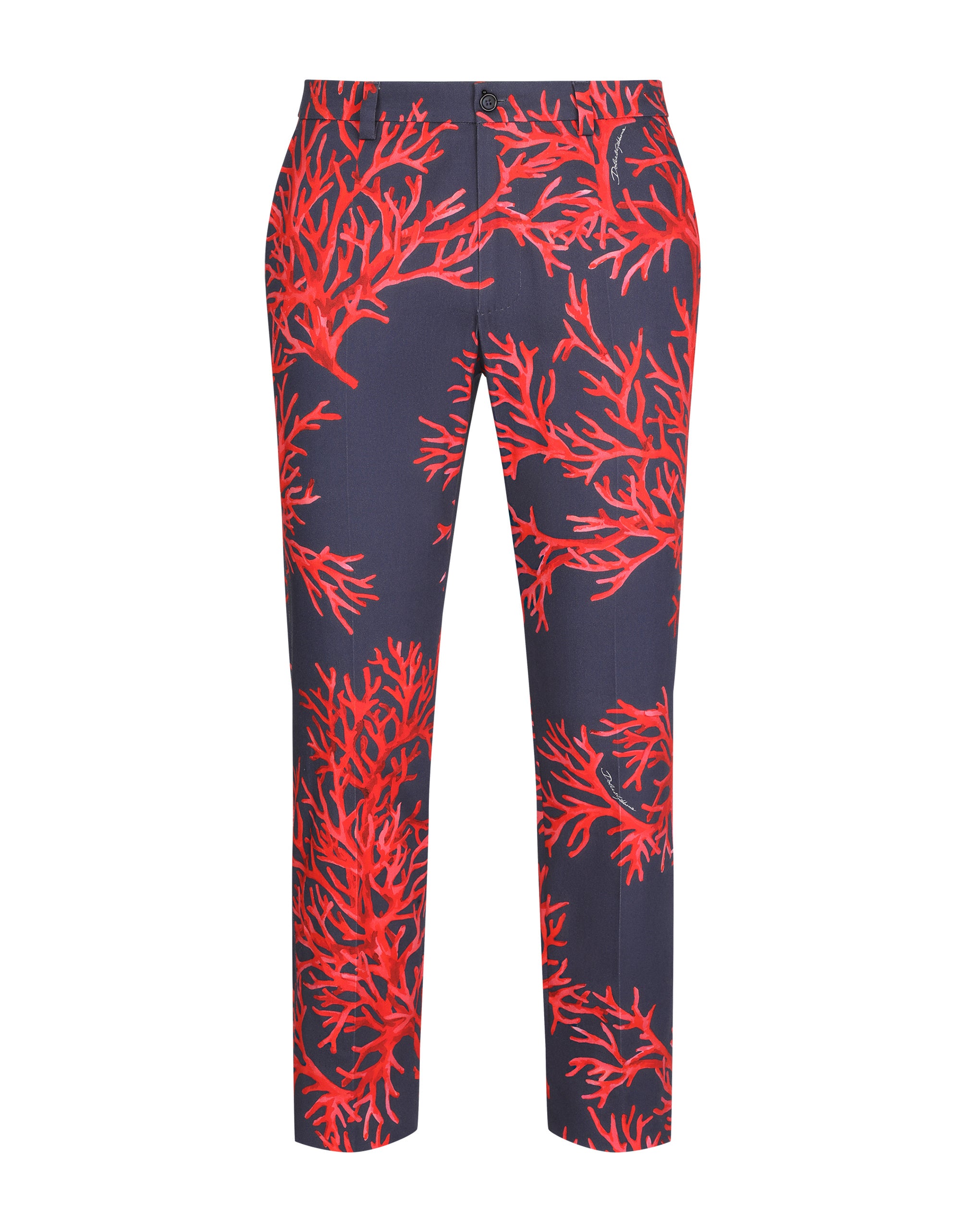 The “Corallo” Collection is a tribute to the sea, a place of freedom, and to red coral especially, which is rich in aesthetic and symbolic potential. Printed fabrics and silks come in iridescent colors with clean silhouettes that emphasize masculine sensuality. Tailored pants in coral-print stretch cotton. • Regular fit • Belt loops on the waist • Adjustable on sides with button • Fly-covered zipper and button fastening • Front slant pockets and buttoned welt pockets at the back • The hem is 17 cm wide on a size IT 48 • The item measures 96 cm on the outer leg on a size IT 48 • The model is 185 cm tall and wears a size IT 48 • Made in Italy