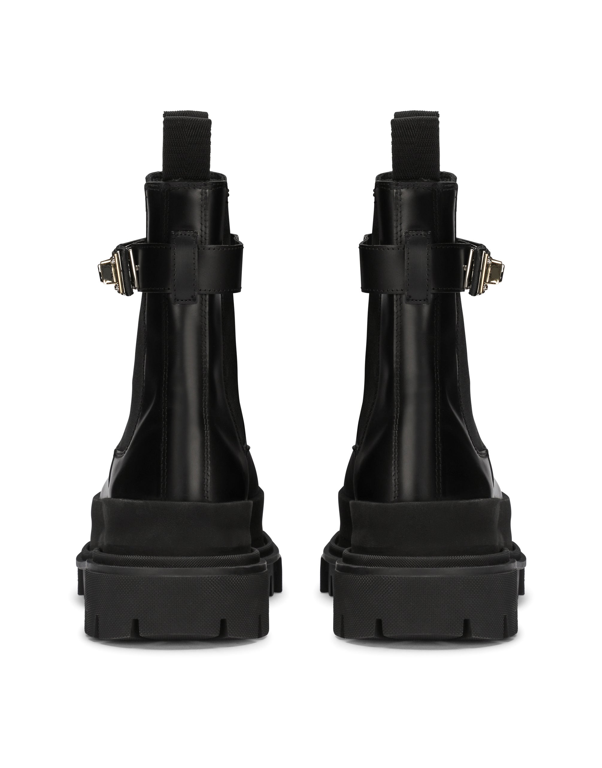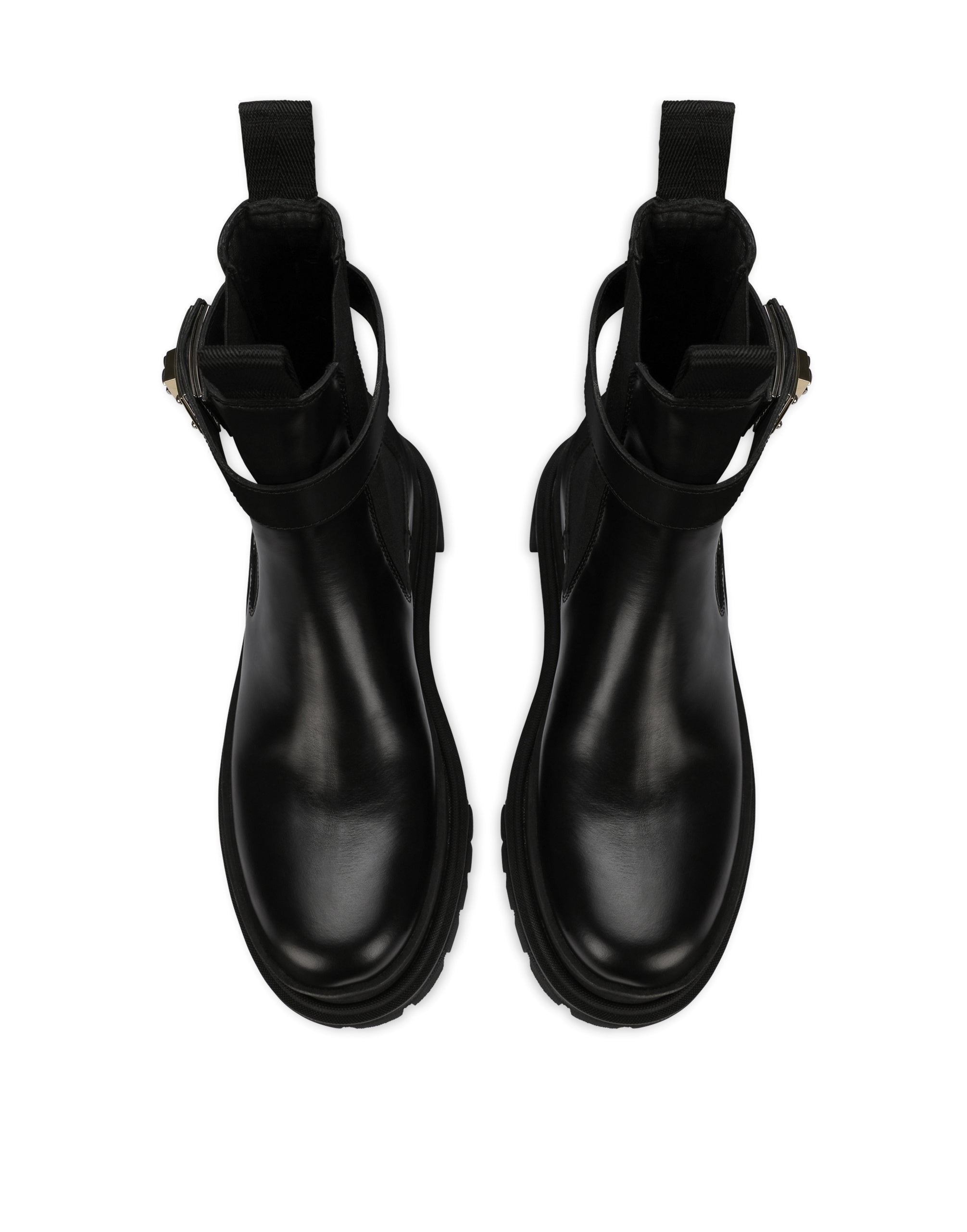 The new collection presents a new vision and interpretation of reality, where the woman pays tribute to the Dolce&Gabbana logo by putting a contemporary edge on it. Black and white hues are the stars, celebrating the uniqueness and individuality of entire generations. Versatile and contemporary, these new calfskin ankle boots feature a branded strap with light gold-plated fastening. • Elastic inserts on the sides • Calfskin footbed with branded label • Rubber bottom assembly • Rubber outsole • Item comes with themed packaging • Made in Italy