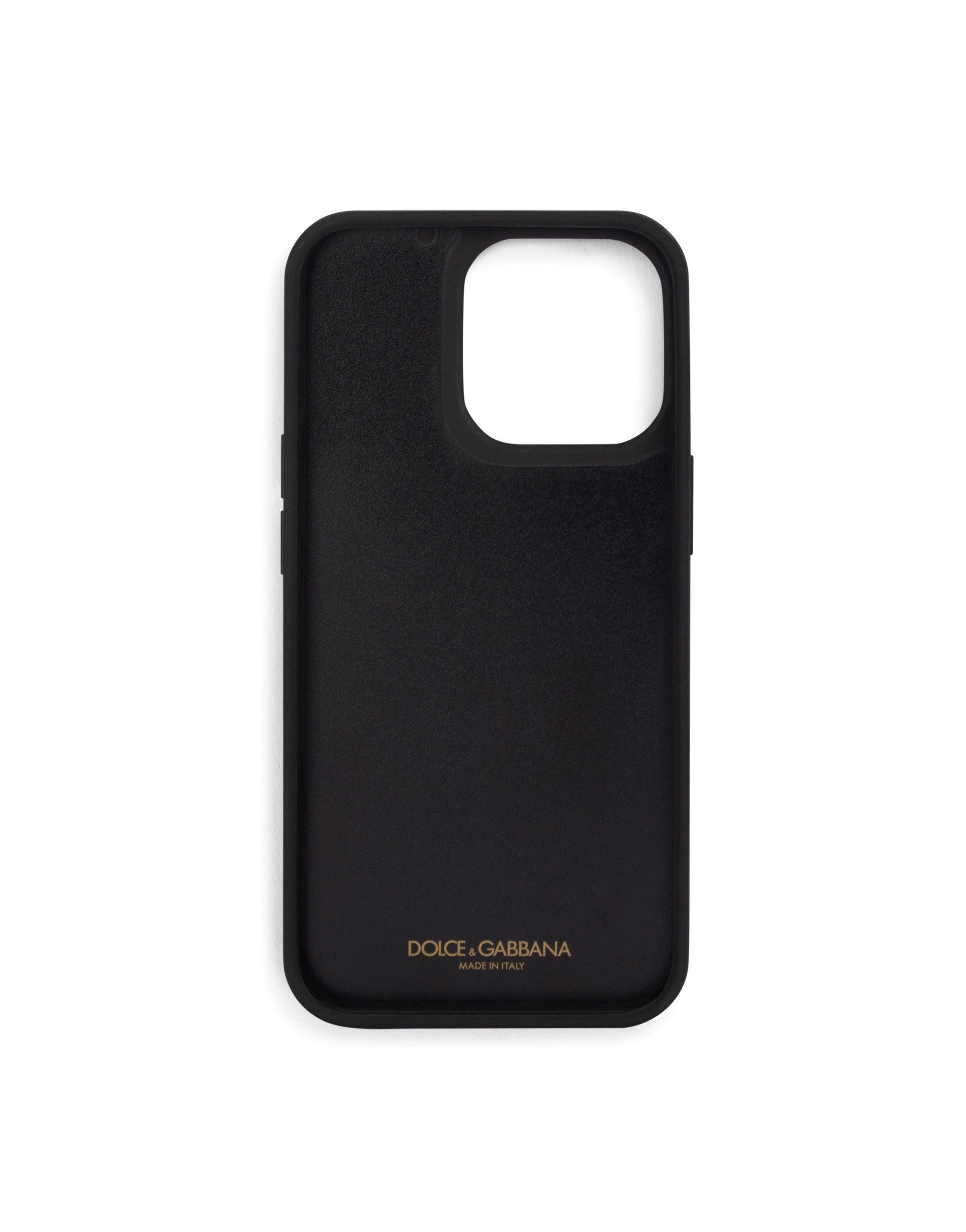 This new iPhone 13 Pro cover features a calfskin panel and the light gold-plated DG logo. • Openings for the camera and side buttons • PVC shell • Measurements. 15 x 7.6 x 1 cm • Made in Italy
