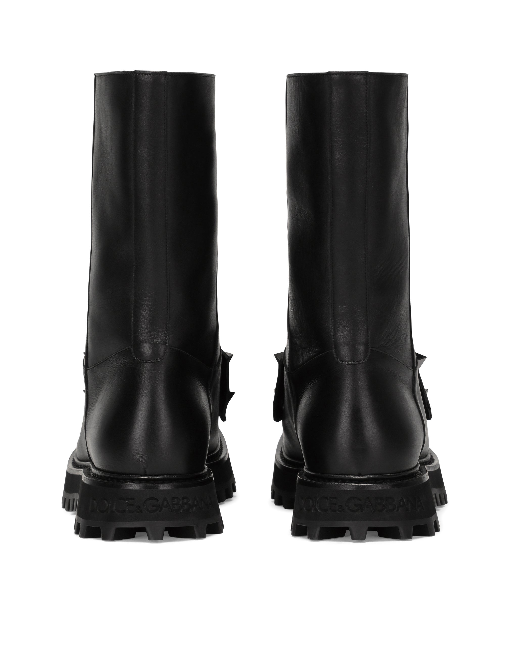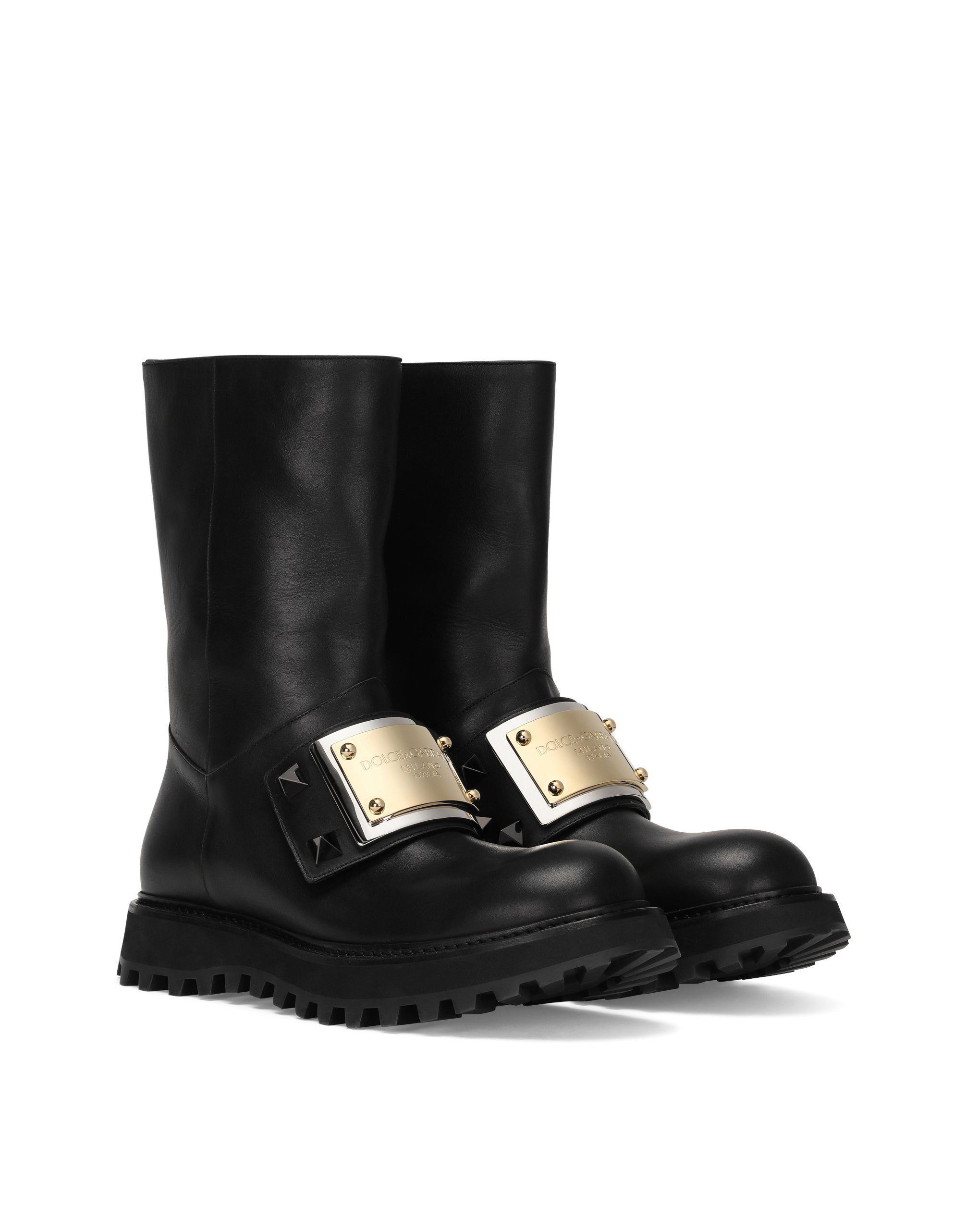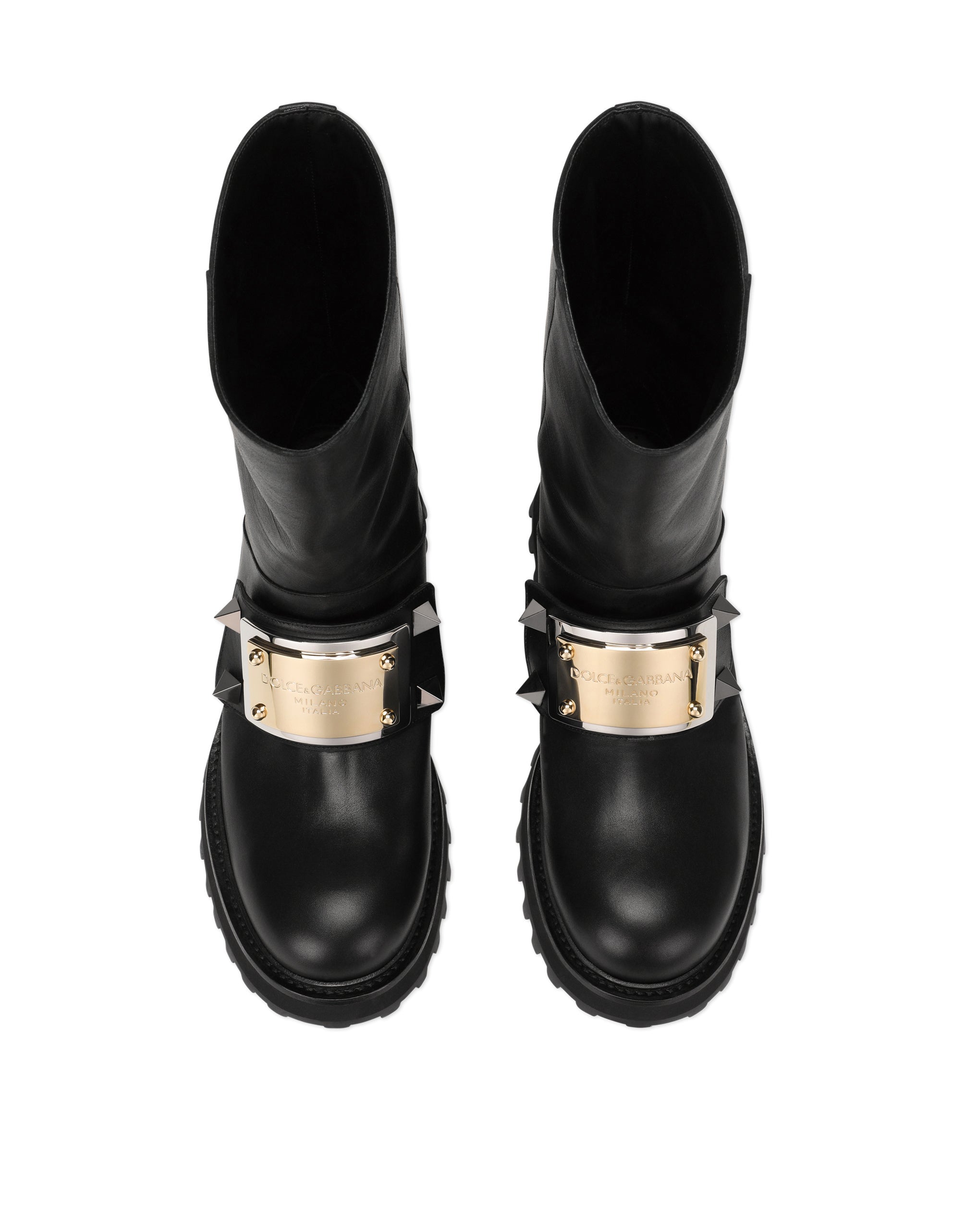 The Dark Side collection, inspired by the Punk Rock world, wants to be an ode to communication, emancipation and laying claim to our own way of being and living. In this collection, the Bernini boots come in calfskin nappa leather and feature a maxi-plate with two metal plating finishes with the Dolce&Gabbana logo, which can be detached via press-stud buttons. • Calfskin nappa upper • Calfskin insole with quilted satin insert and branded label • Dolce&Gabbana logo on the back of the sole • Item comes with themed packaging • Rubber bottom assembly • Made in Italy