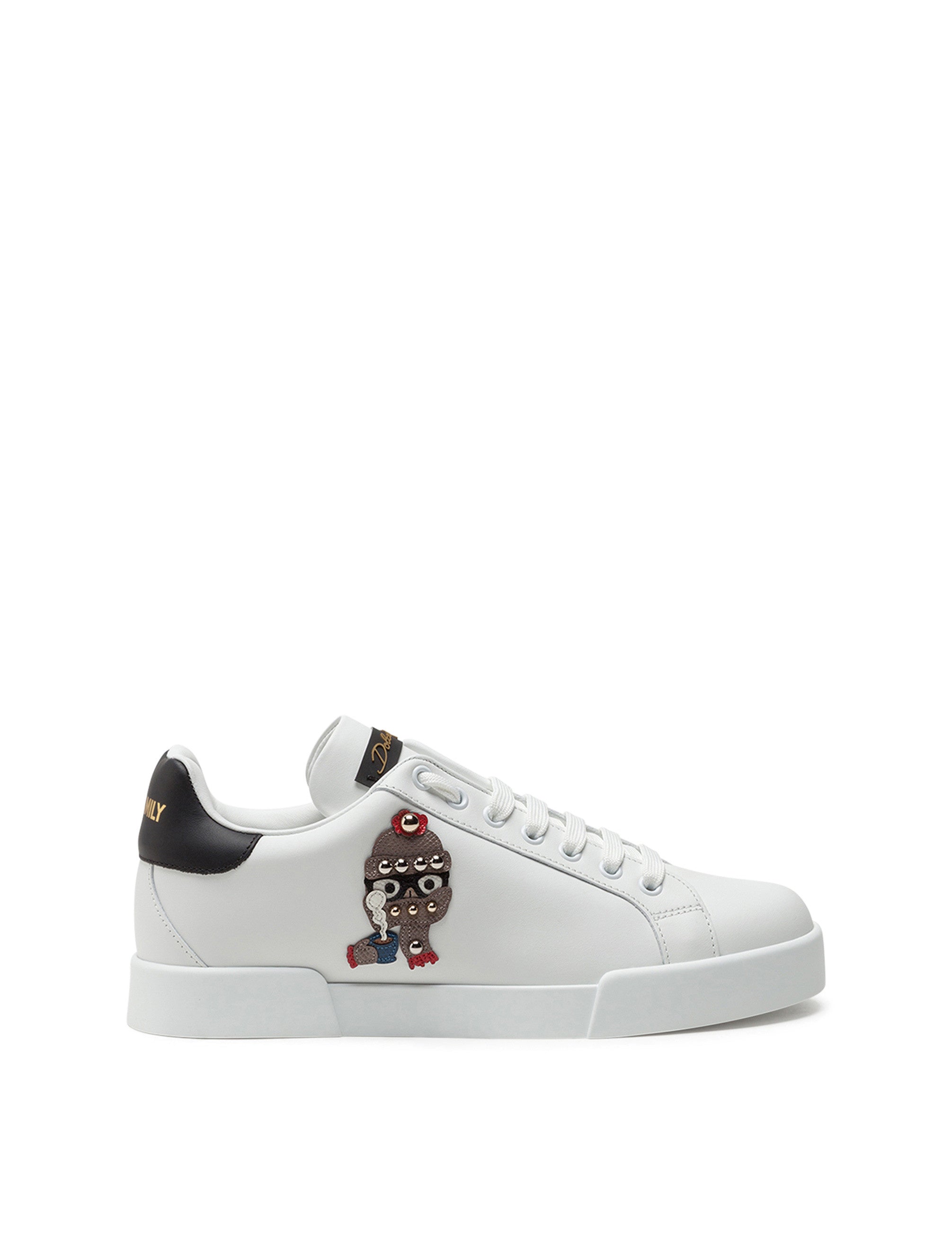 These Portofino sneakers in calfskin nappa are an integral part of Dolce & Gabbana’s DNA and come with Patches of the Designers in Dauphine calfskin and micro-studs: • Calfskin upper with contrasting heel • Rubberized branded label • Flat laces • Calfskin footbed with branded label • Branded rubber sole • Item comes with themed packaging • Made in Italy External composition: 100% Calfskin Internal composition: 80% Lambskin 10% Sheepskin 5% Natural Rubber 5% Polyester