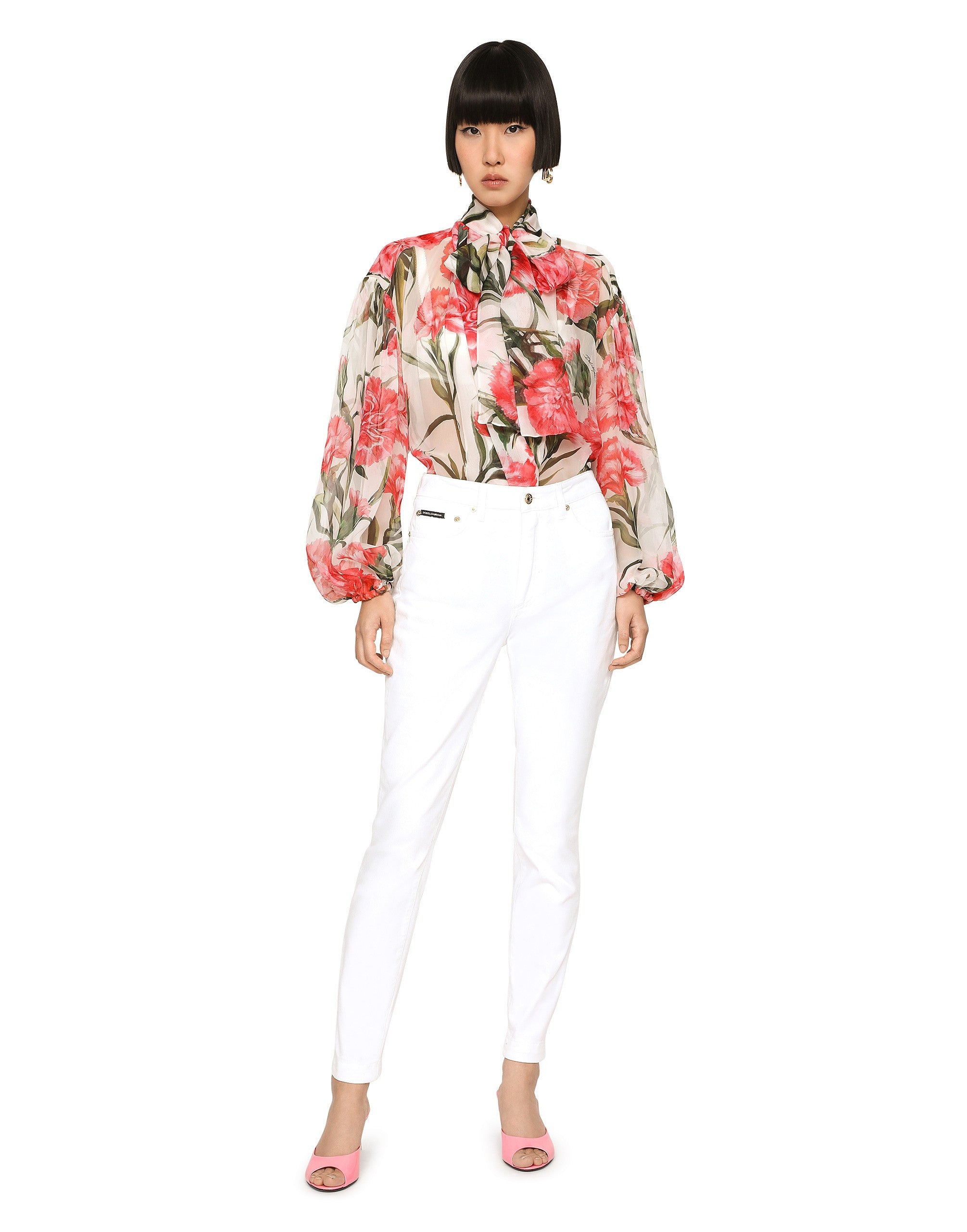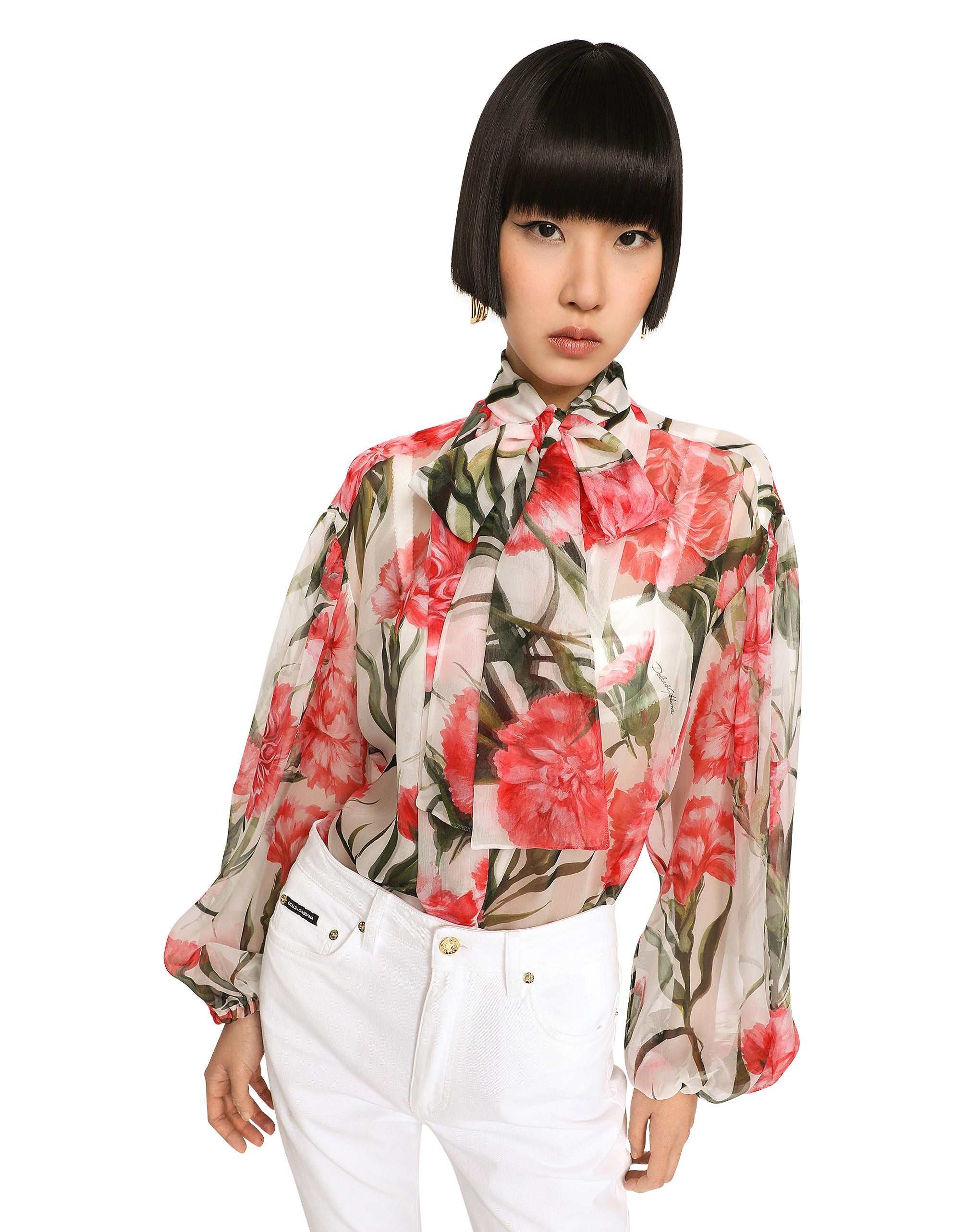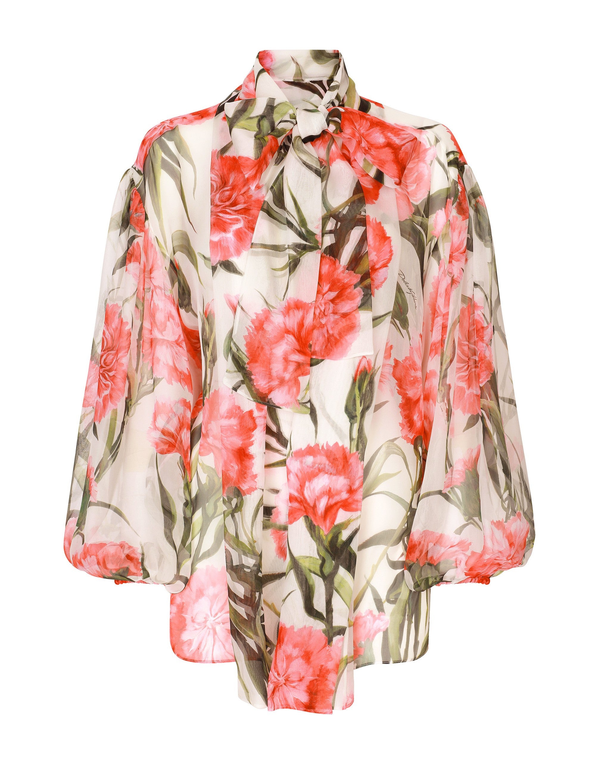 In its Happy Garden collection, Dolce&Gabbana is creating a colorful, floral universe to emphasize a wonderful and sensual portrait of a woman. Light, exquisite fabrics are used to make pieces that will give you elegant and sophisticated allure. Carnation-print chiffon shirt: • Shawl neck with pussy bow • Long sleeves • Oversize fit • Unlined • The piece measures 73 cm from the rear collar seam on a size IT 40 • The model is tall • Made in Italy The difference in the print placement that you may find on this product is a feature of Dolce&Gabbana’s “Handmade” pieces. A detail that makes every garment or accessory unique and exclusive.