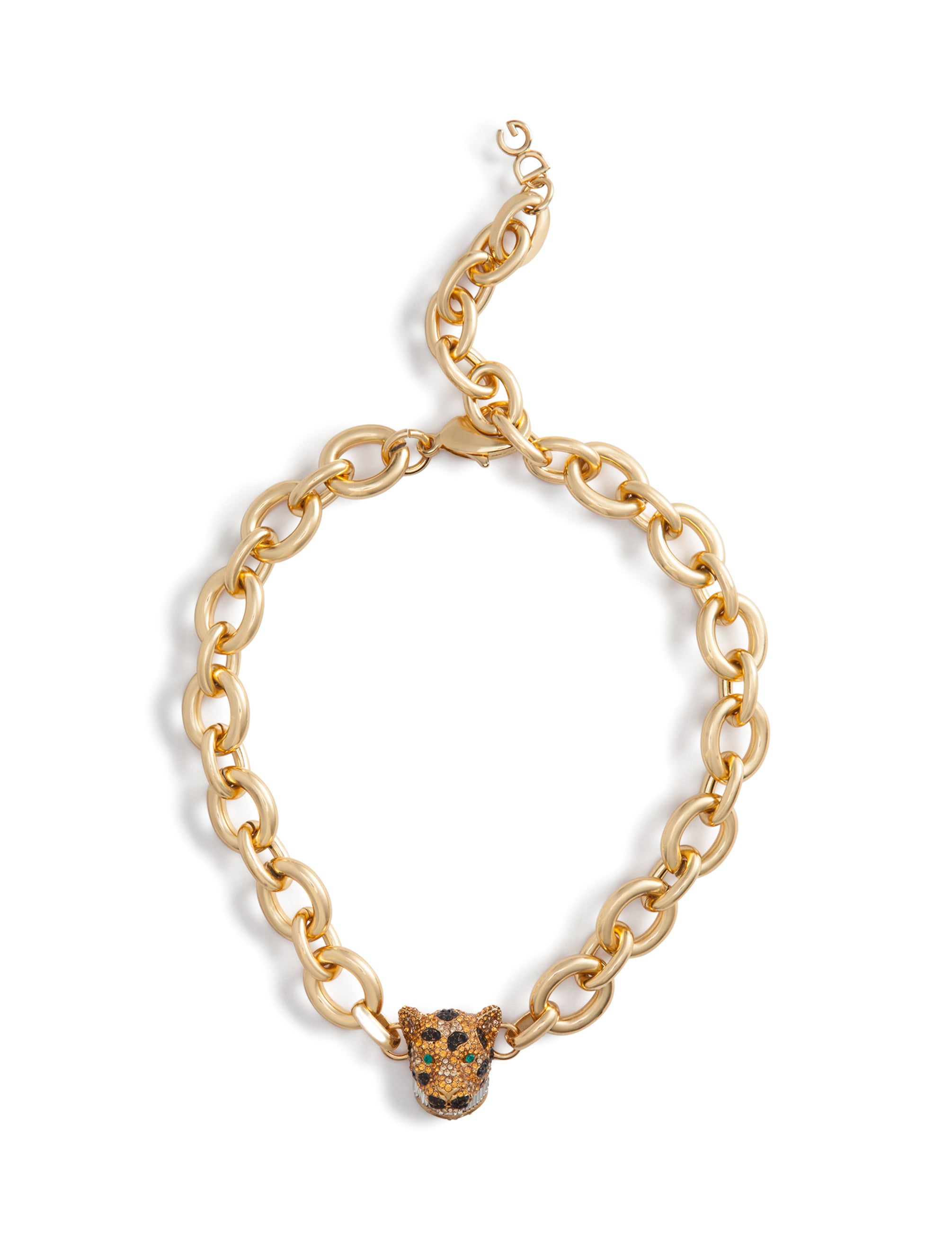 The leopard has always been an iconic animals of the Dolce&Gabbana collections. This choker necklace in gold-plated brass is covered in bright pavé crystal rhinestones. Wear it with a long black dress to give a touch of light to your looks: • Closure with snap hook • Non-allergenic and nickel-free materials • Made in Italy Composition: 80% Resin 20% Brass