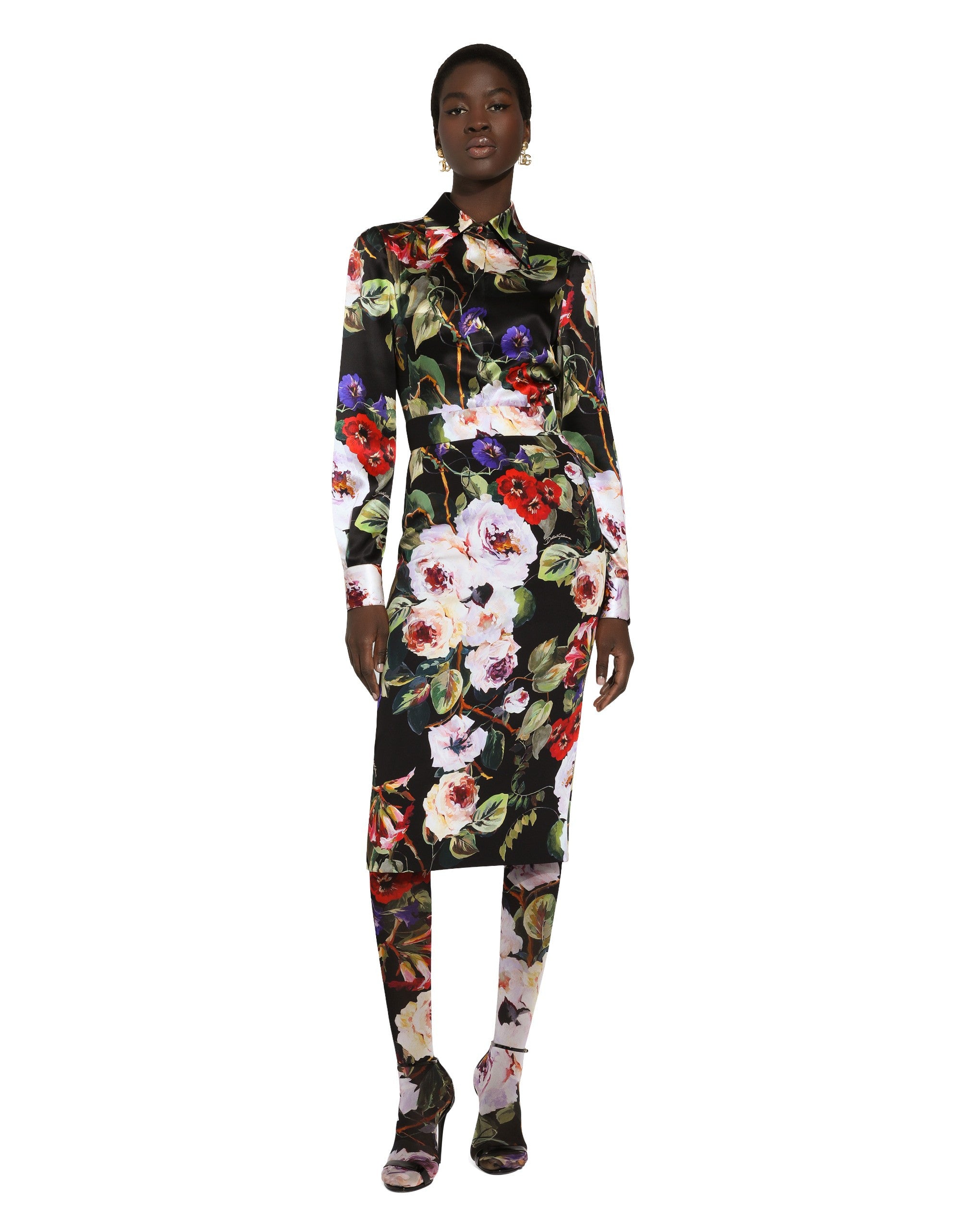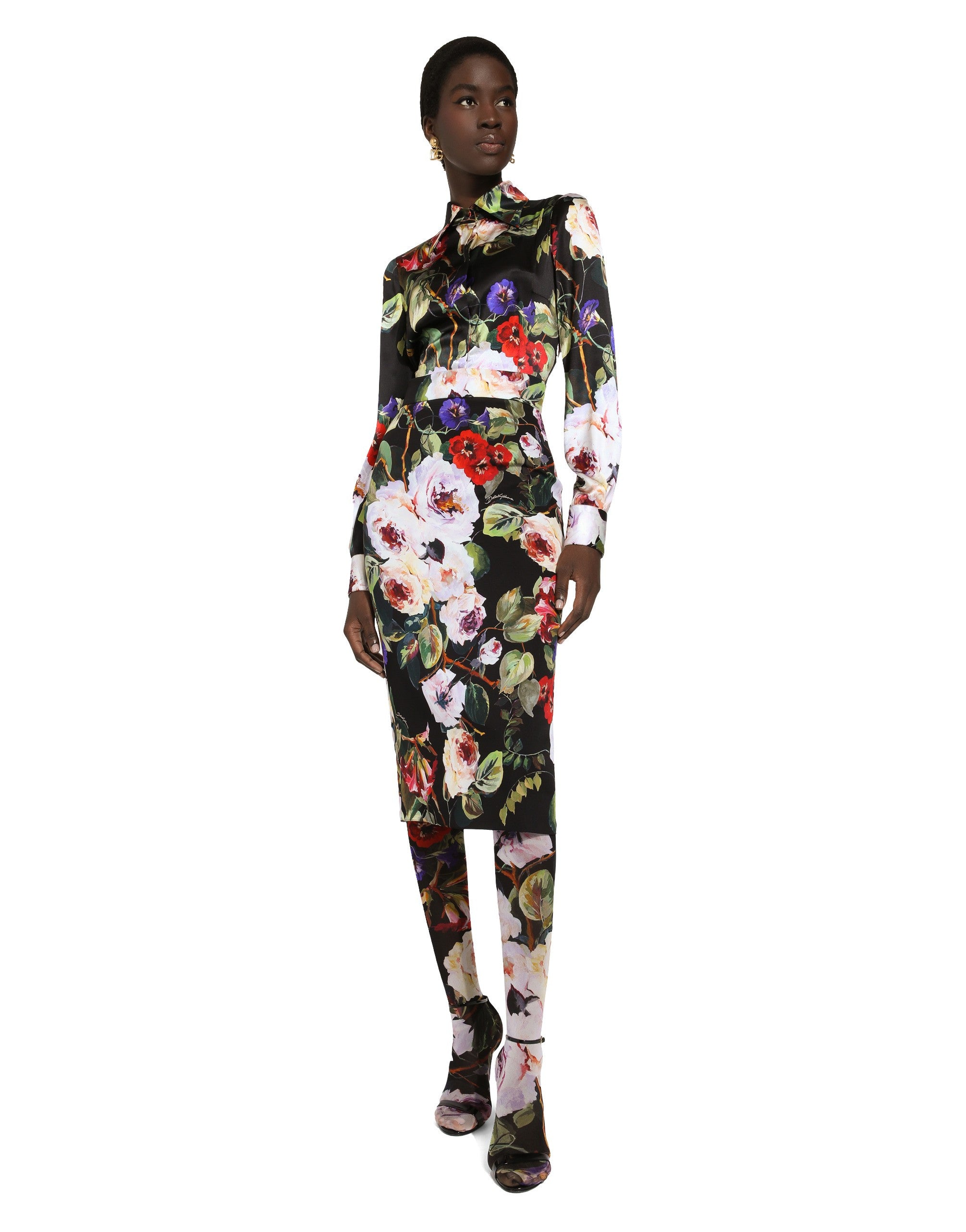 The spirit of the 1960s is taking over the new Flower Power collection. The focus is a head-to-toe floral look built around pairing and layering rose, anemone and floral bouquet maxi-prints. A cosmopolite poised between playful and sexy, this women interprets the austerity and elegance of the 1960s, harking back to boldly opulent imagery that here at Dolce&Gabbana is condensed and reinterpreted through silhouettes, ample proportions and airy shapes, bringing femininity and sensuality to the forefront. Silk charmeuse calf-length skirt with rose garden print: • Multi-colored • High-waisted • Leopard-print stretch silk satin lining • Rear zipper and hook-and-eye fastening • The piece measures 75 cm from the waist down on a size IT 40 • The model is 175 cm tall and wears a size IT 40 • Made in Italy The difference in the print placement that you may find on this product is a feature of Dolce&Gabbana’s “Handmade” pieces. A detail that makes every garment or accessory unique and exclusive.