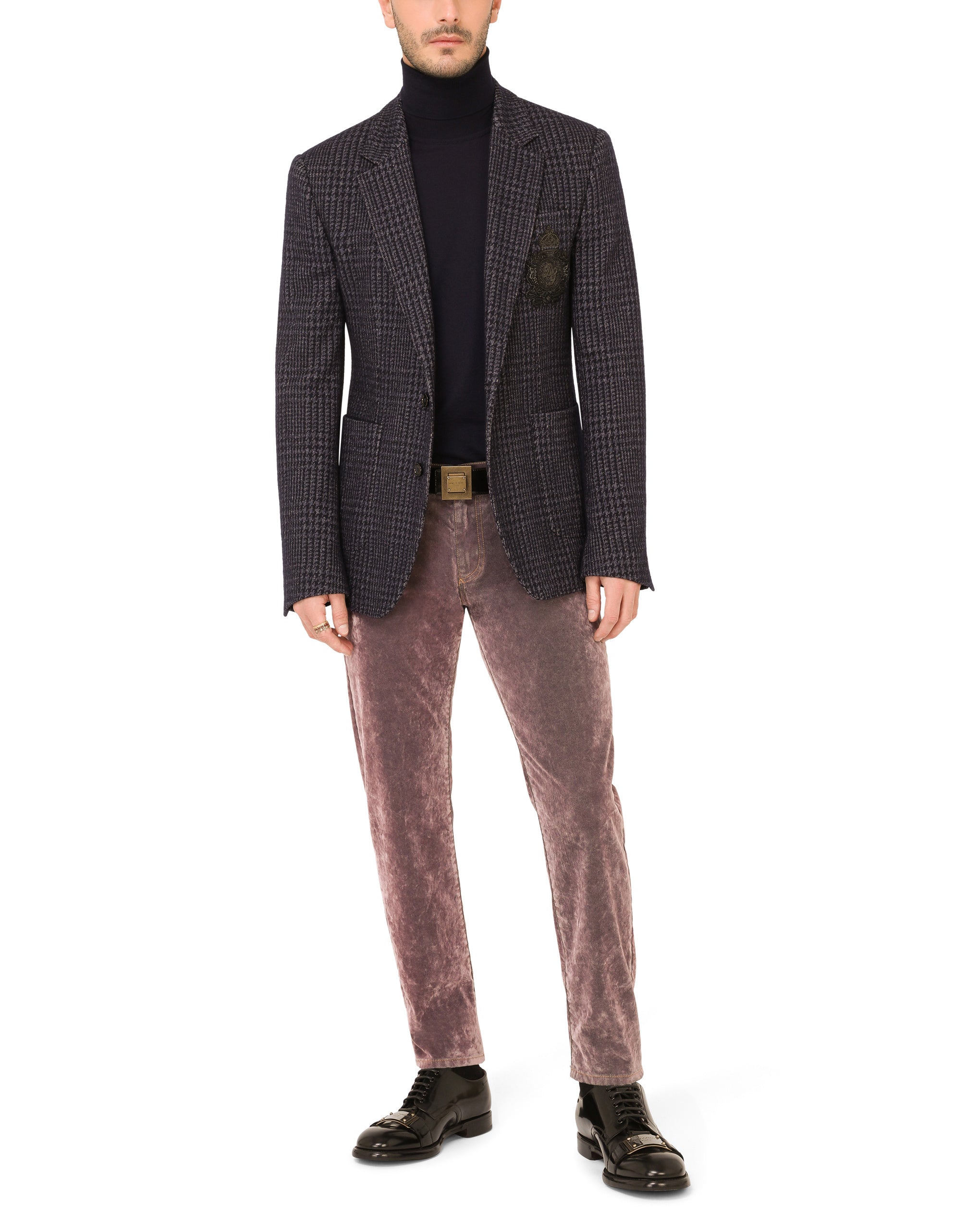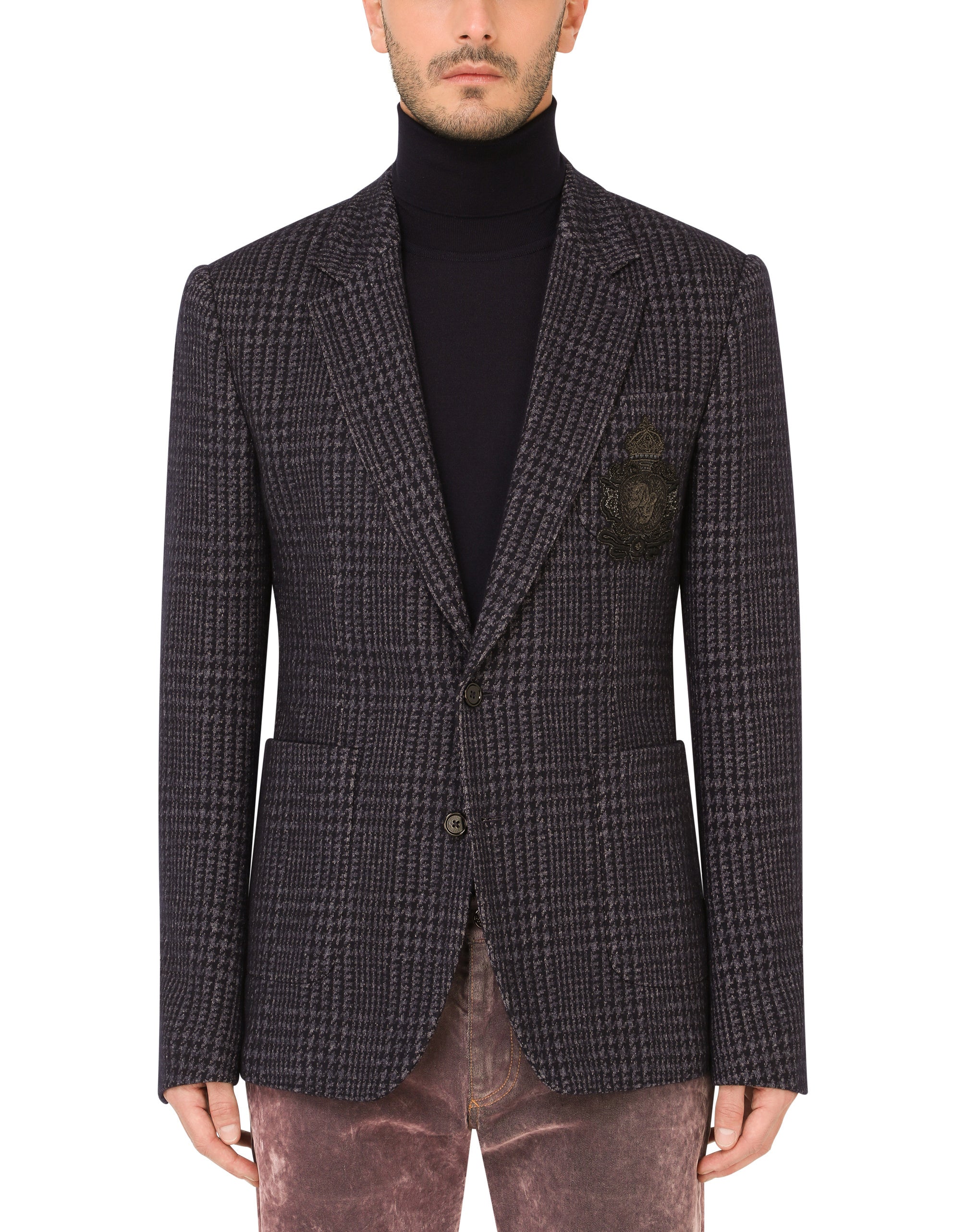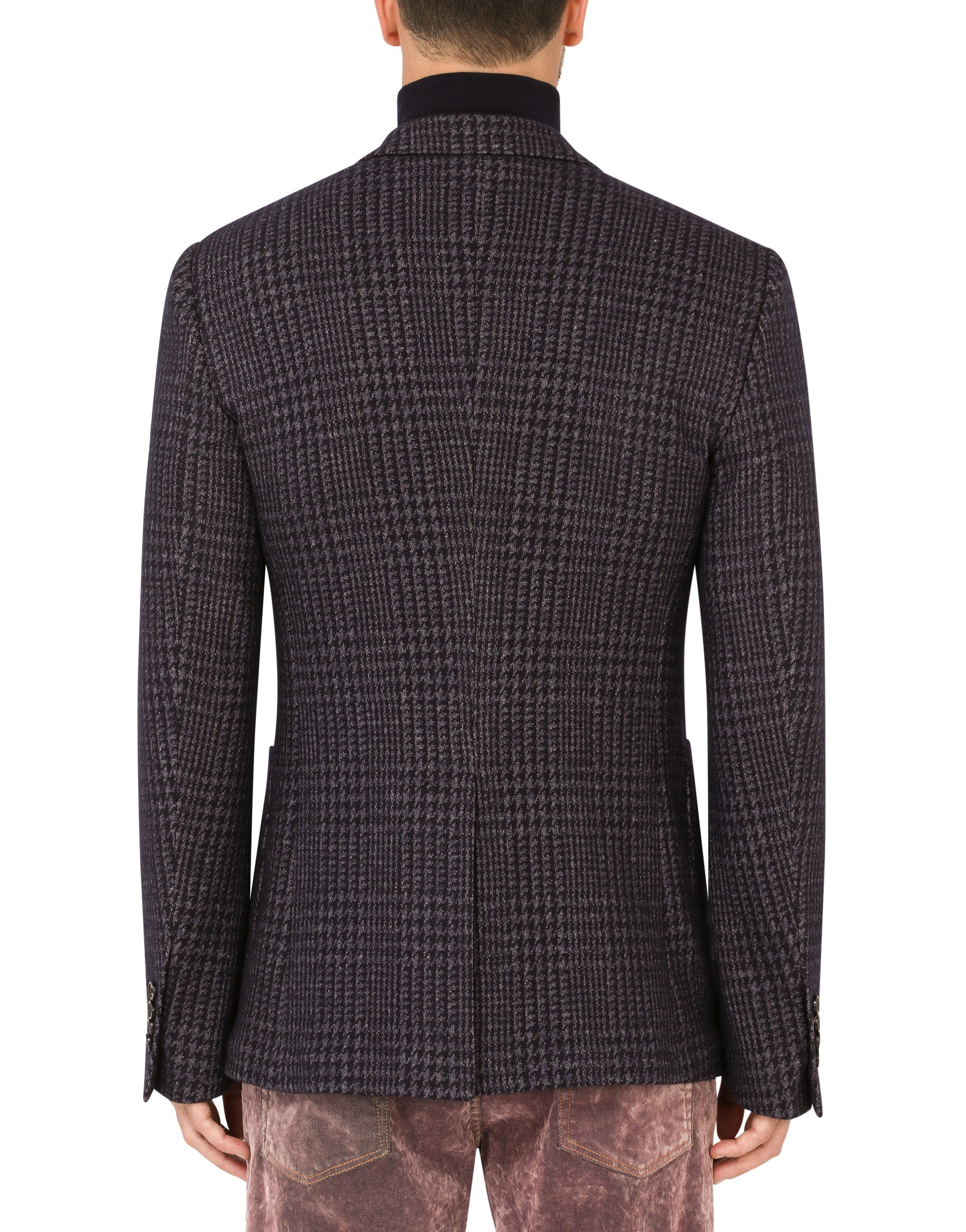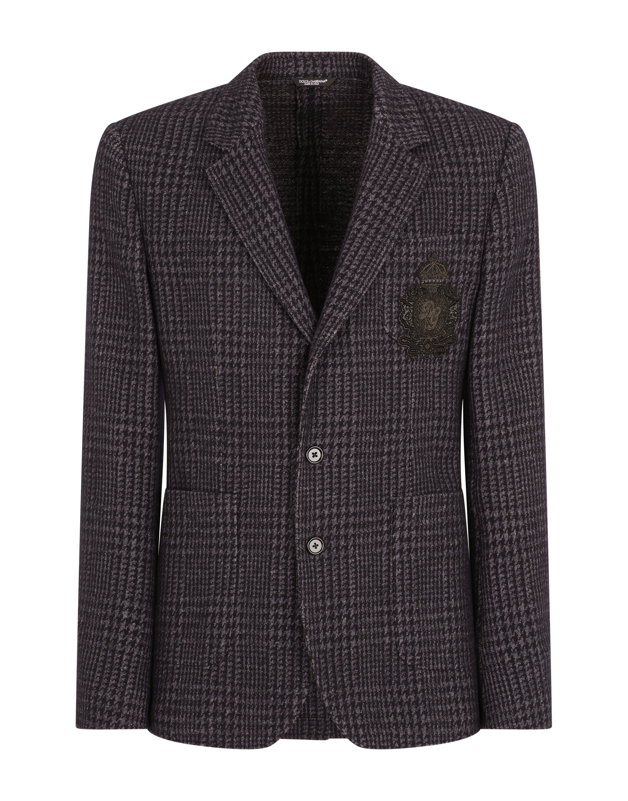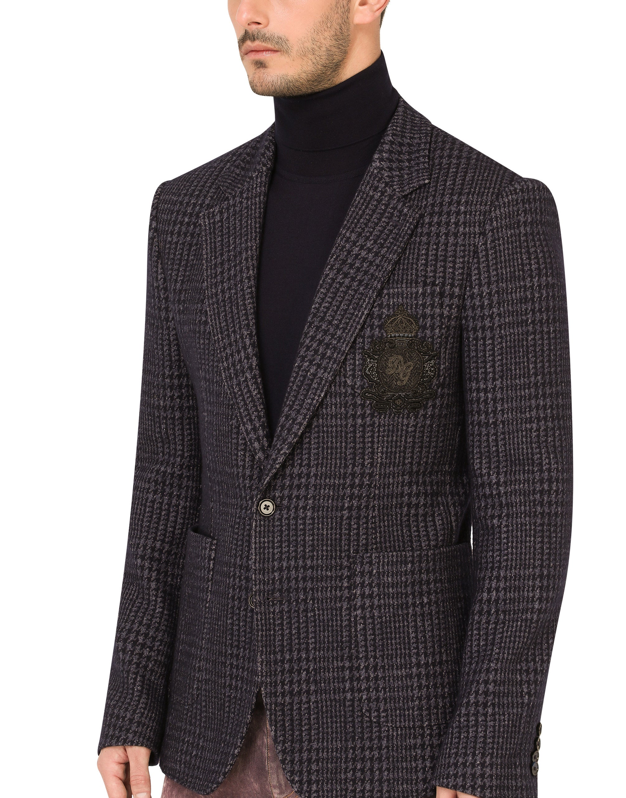 The Sartoriale Collection fuses wonderful sartorial constructions with fine fabrics. Garments embellished by embroidery, French wire patches and fine details, complemented by colorful accessories, create sophisticated and contemporary looks. Single-breasted check jersey jacket with French wire DG patch. • Regular Portofino fit • Notched lapels • Double-button fastening on the front • Outer patch pockets • Three welt pockets on the interior • Buttoned cuffs • Central vent • Unlined • The piece measures 73.5 cm - 28.9 inches from the rear collar seam on a size IT 48 • The model is 185 cm - 72.8 inches tall and wears a size IT 48 • Made in Italy