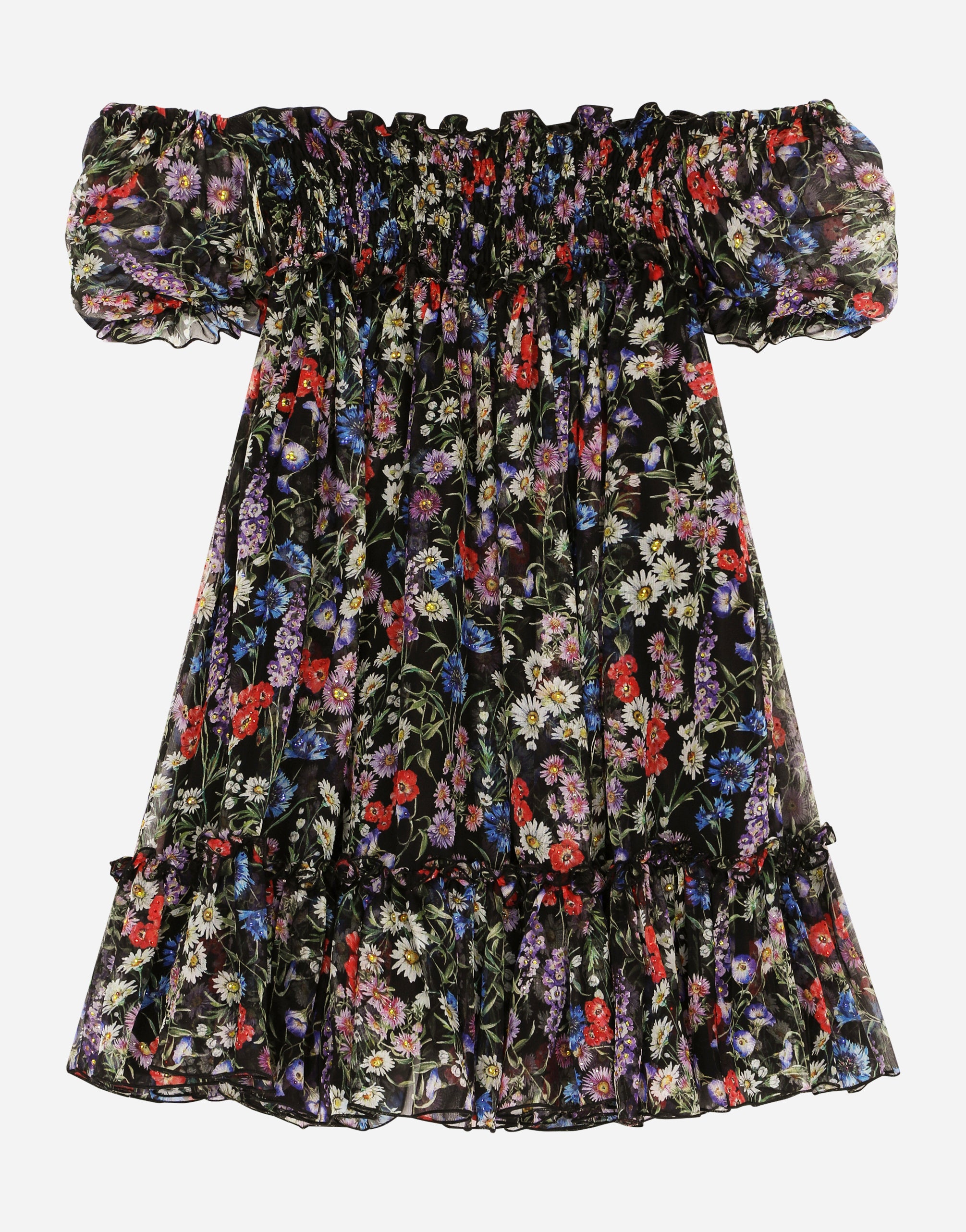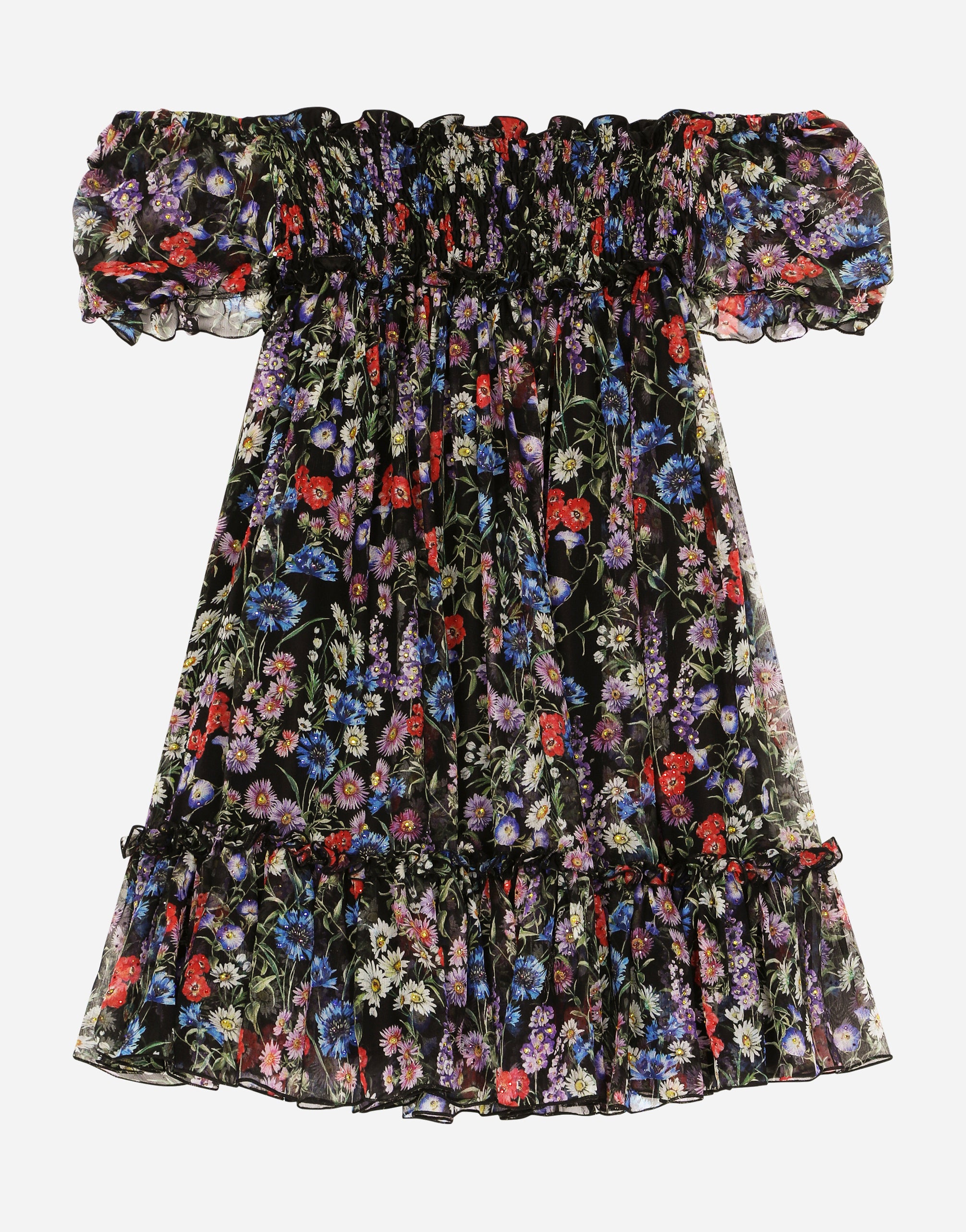 The girl’s Prateria Collection is inspired by the women’s 2001 New Hippy Collection, where the desert and meadows become bohemian and glamorous. Vaguely vintage/grunge looks come made up of volume and special pieces flaunt light printed and solid-color fabric details, smock stitching, corduroy, faux fur and a print distinguished by delicate and joyful multi-colored wildflowers for fun and ironic little girls. Chiffon dress with short sleeves: • Multi-colored • Regular fit • Square neckline • Short puff sleeves • Lined • Concealed zipper fastening on the back • Meadow flower print • Skirt with gathered ruffle • Smock stitch on the body • The item in the size 6 years measures 65 cm from the shoulder seam • Made in Italy The difference in the print placement that you may find on this product is a feature of Dolce&Gabbana’s “Handmade” pieces. A detail that makes every garment or accessory unique and exclusive.