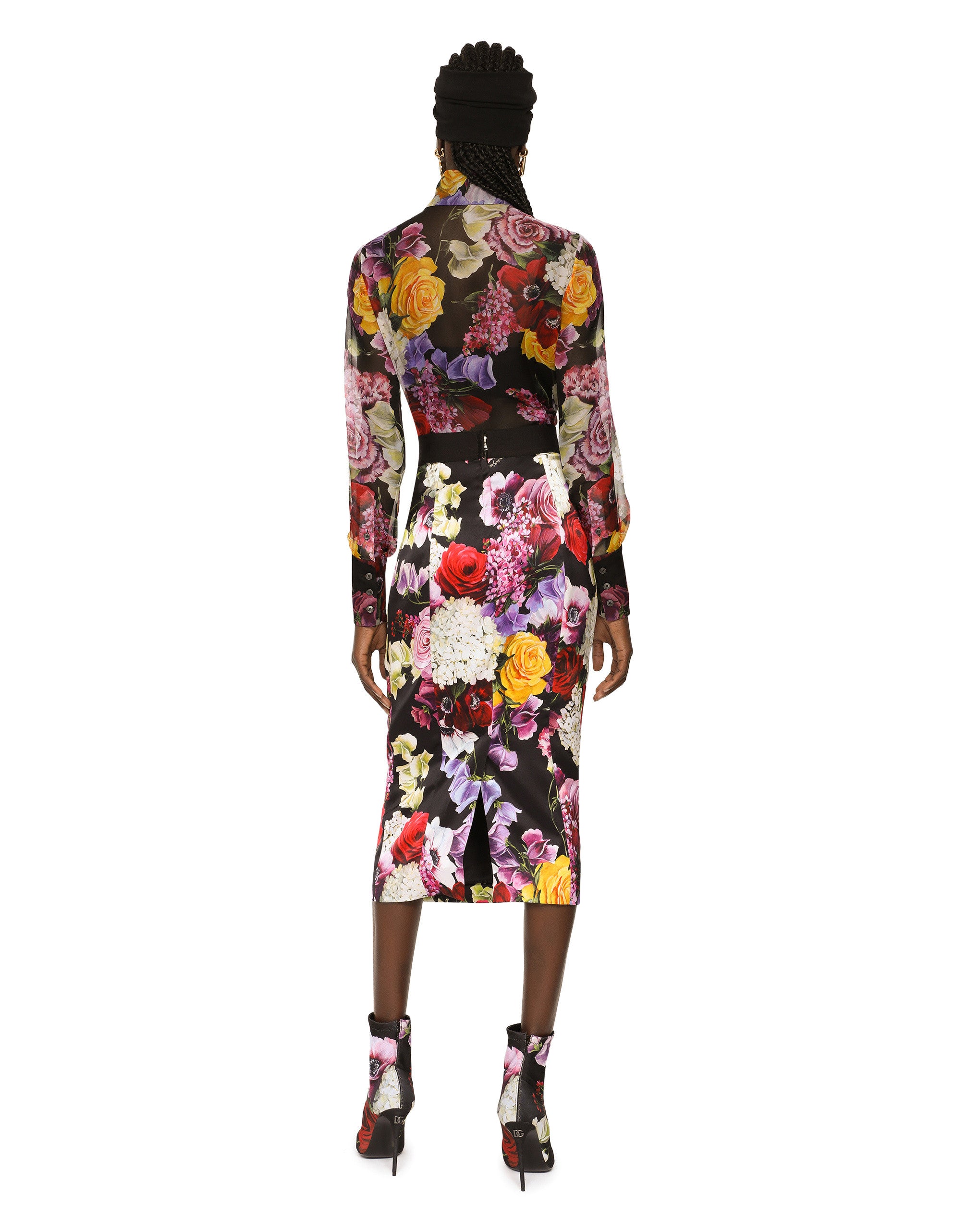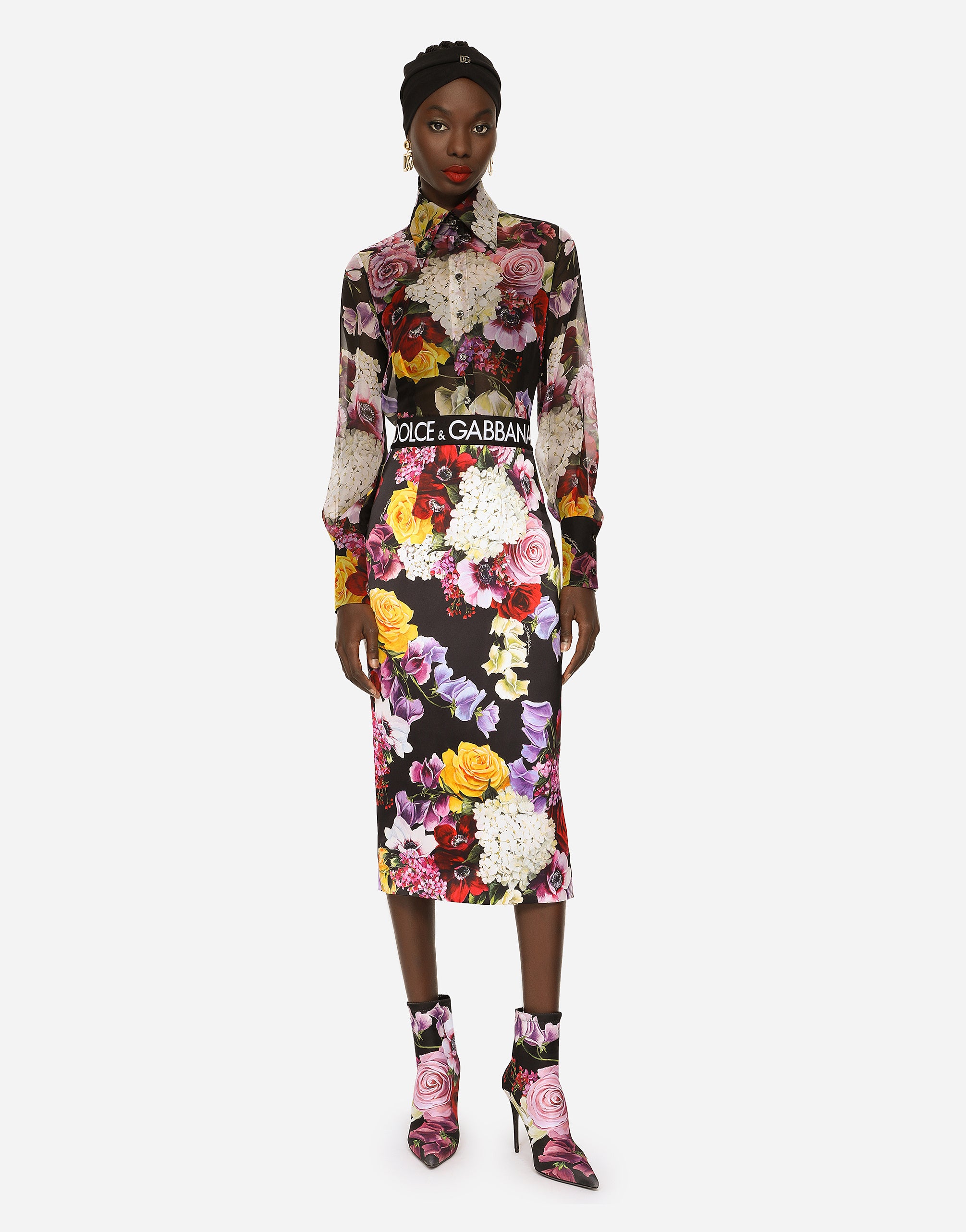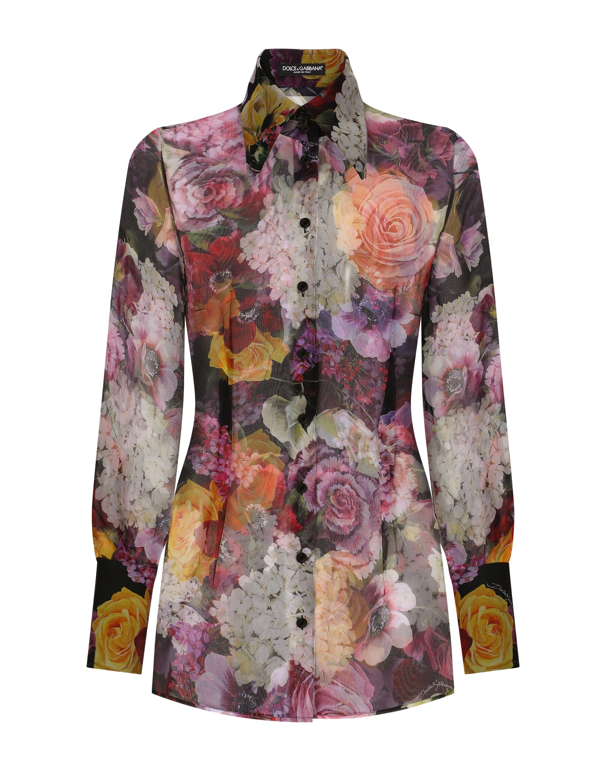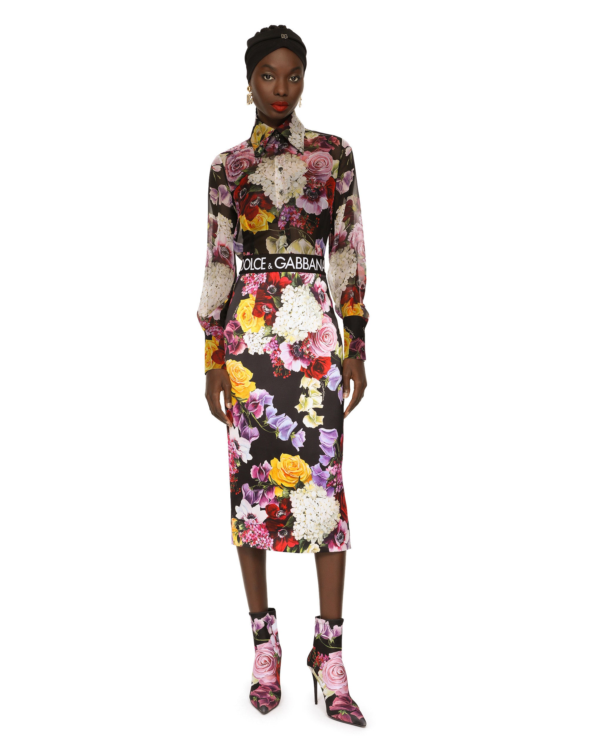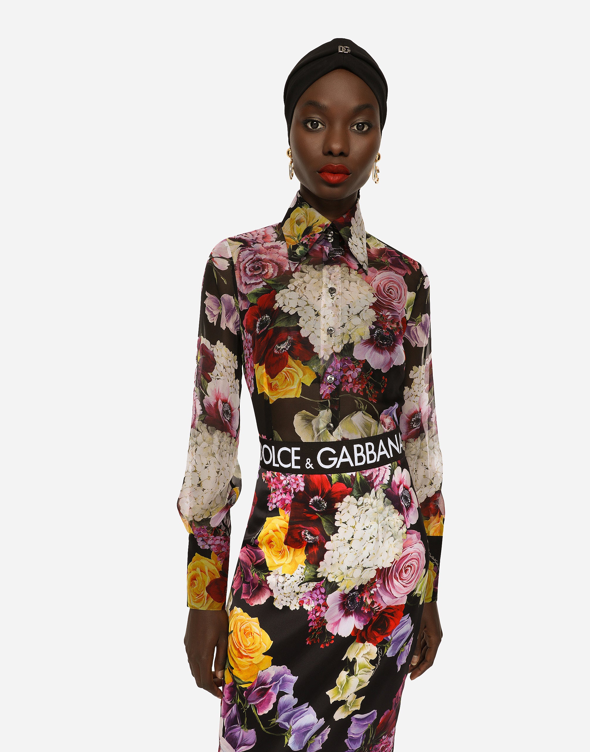 In its collections, Dolce&Gabbana emphasizes all its love for florals and takes meticulous care to celebrate this blooming world in a continuous game of endless renewal. Inspired by women surrounded by flowers, the brand presents pieces, such as this elegant ultra-fitted chiffon shirt with hydrangea print, that will bring out all their personality. Shirt collar • Long sleeves • Slim fit • Unlined • Button fastenings with branded bottom edge • The piece measures 69 cm from the rear seam on a size IT 40 • The model is 175 cm tall and wears a size IT 40 • Made in Italy