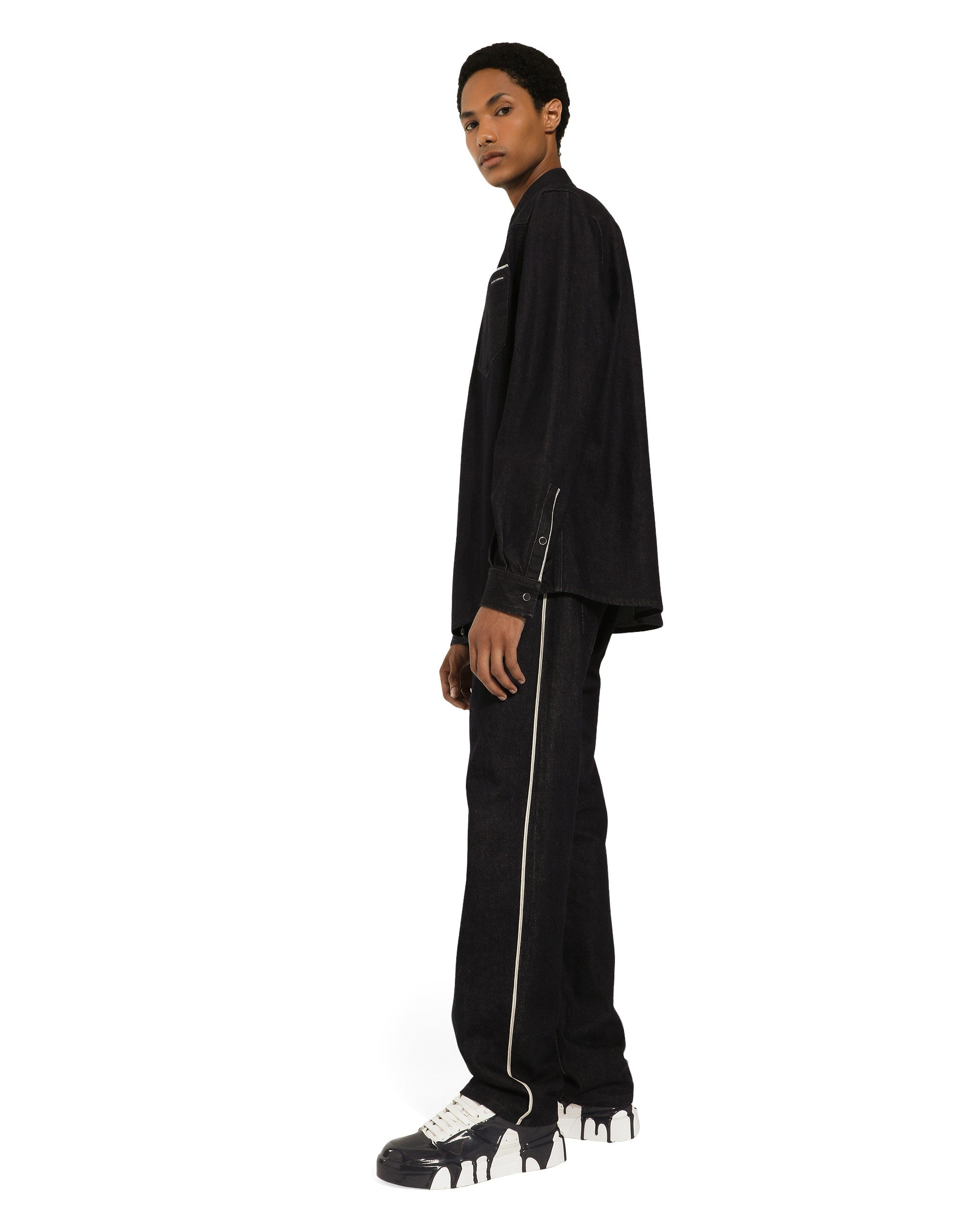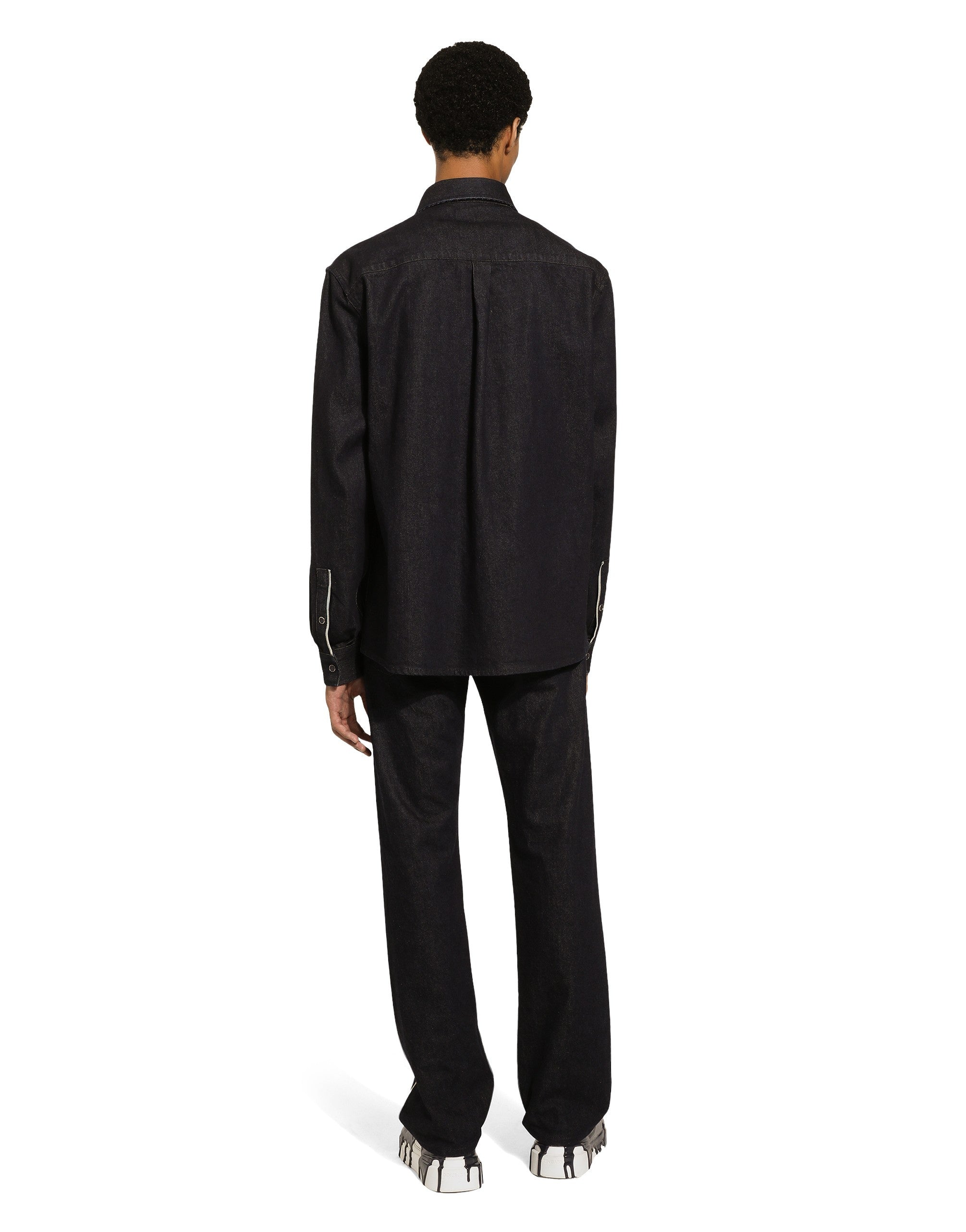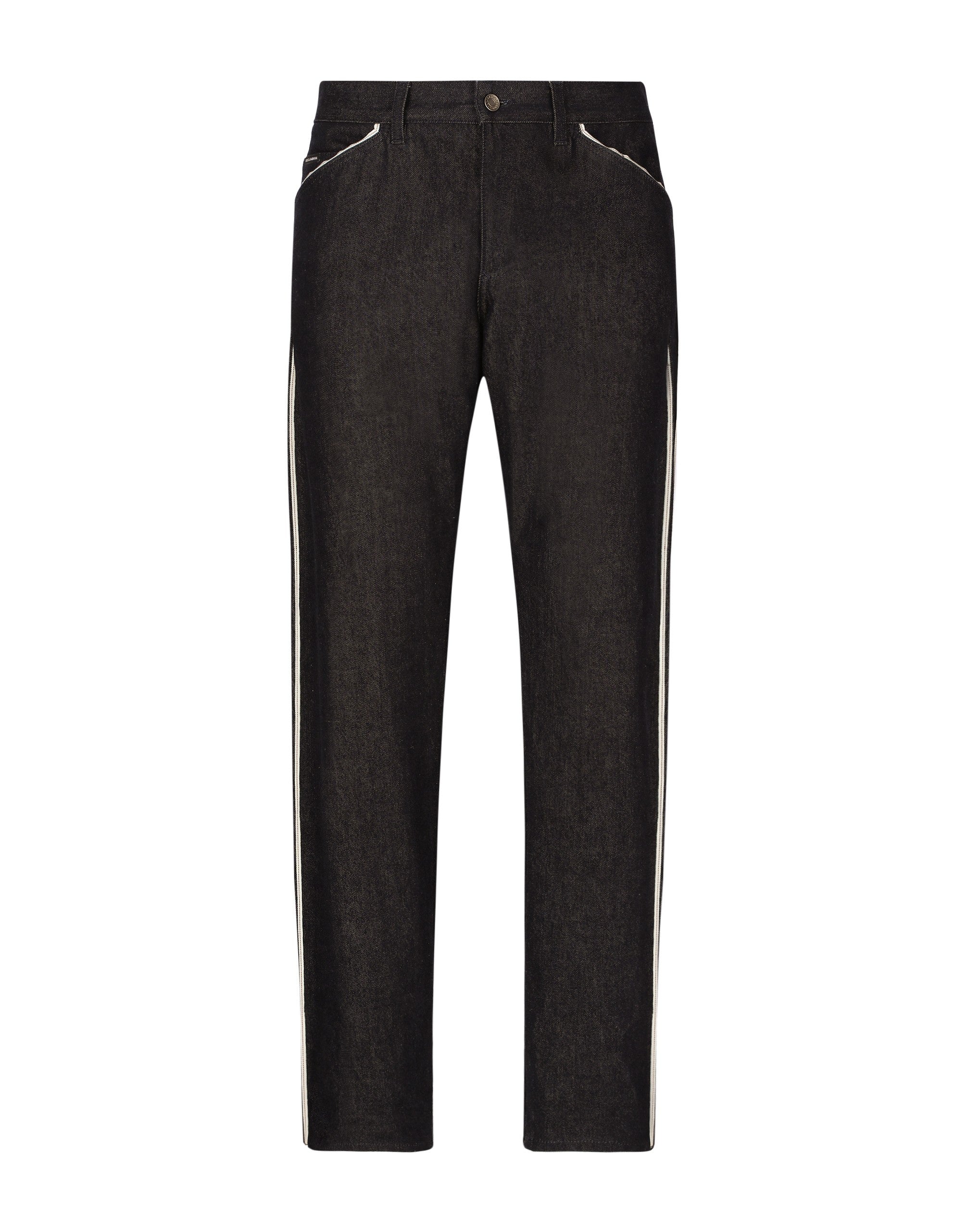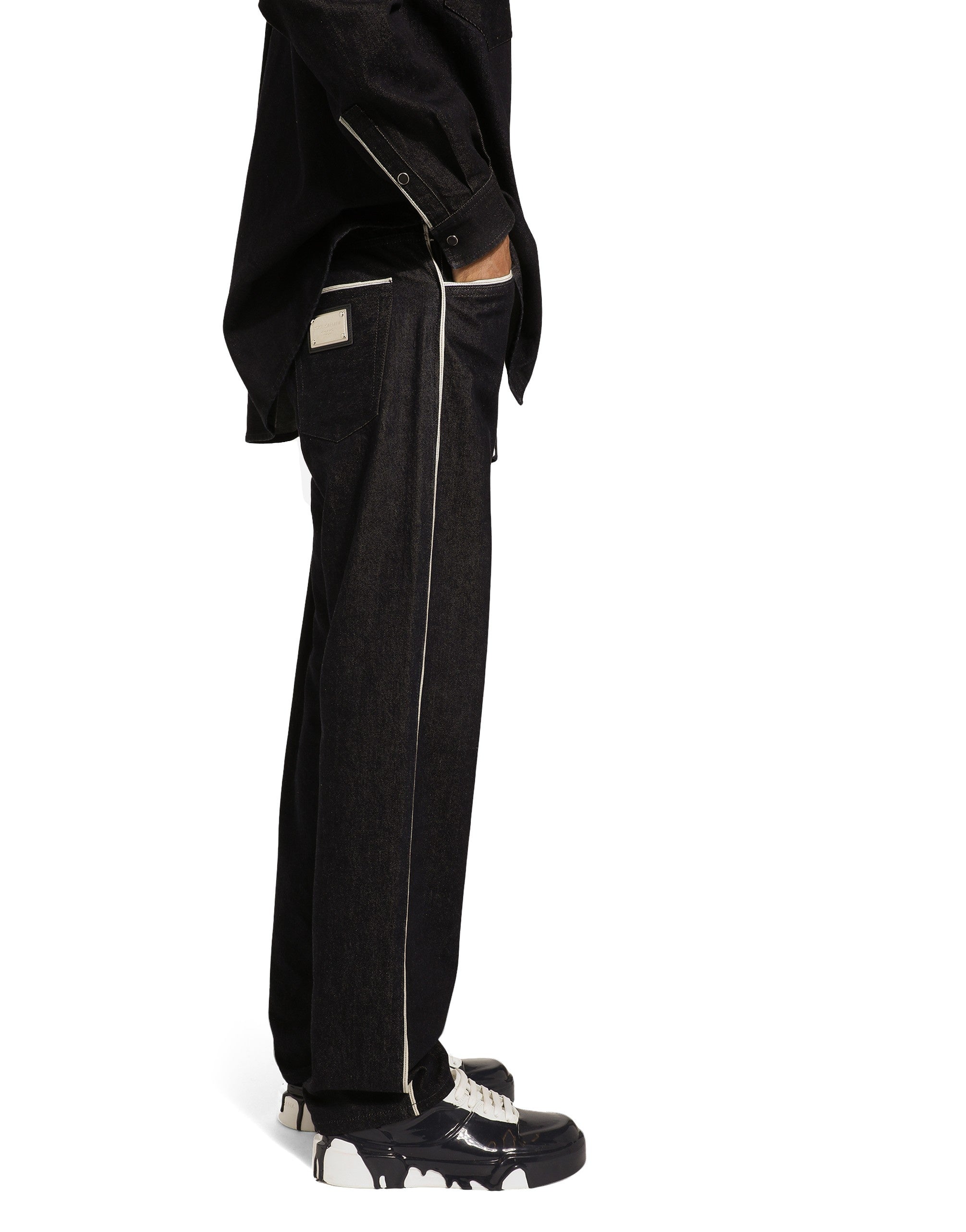 The Marina line has us dreaming of the Mediterranean sea and its myriad shades of blue, while also bringing weathered sailors to mind, yet with a contemporary edge. Aesthetic influences and clear lines, stormy sea blue jackets, multi-pocket pieces, waterproof garments, anchor prints and materials that invite us to discover the “lighthouse keeper”. Fascinating, enigmatic and at times lonely, it tells the tale of a new masculine sensuality built with small yet precise proportions and attention to stylish detail. Five-pocket selvedge denim jeans: • Blue • Classic fit • Front western-style pockets and patch back pockets with selvedge • Fly-covered zipper and button fastening • Metal Dolce&Gabbana logo tag on the back • The item measures 110 cm on the outer leg and the hem is 21 cm wide on a size IT 48 • Made in Italy
