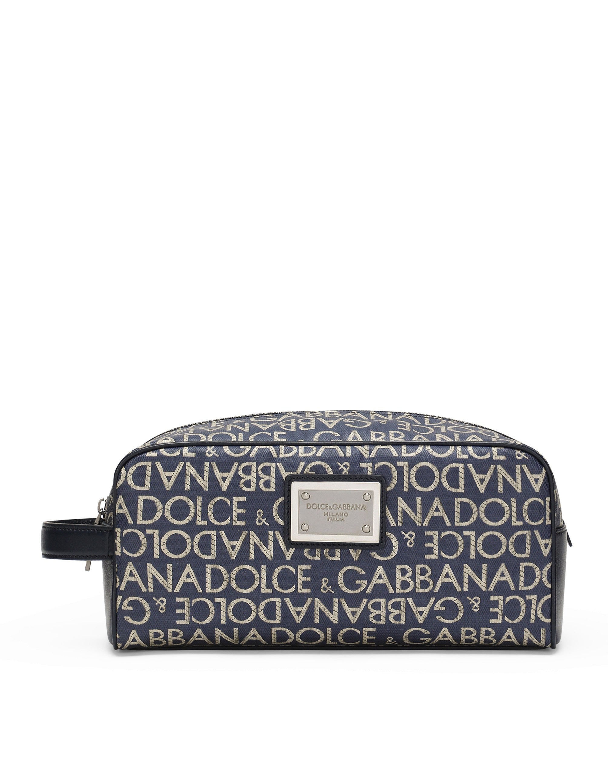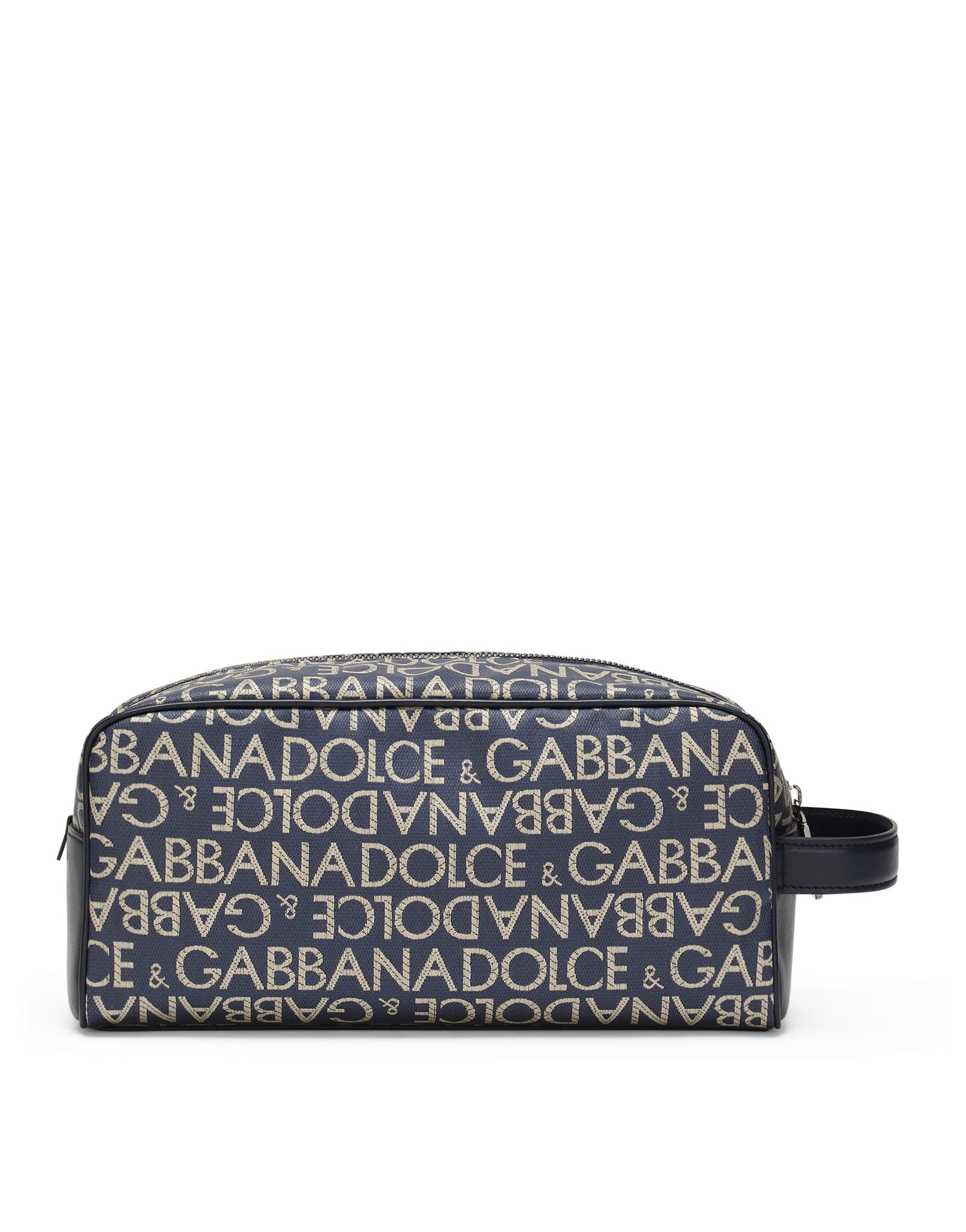The brand’s iconic features adorn the logo. This coated fabric toiletry bag features the all-over jacquard Dolce&Gabbana logo. Coated jacquard toiletry bag with all-over Dolce&Gabbana logo: • Blue • Calfskin strap • Branded tag in ruthenium-electroplated metal • Top fastening with zipper and slider with logo • Fabric lining with calfskin logo label • Item comes with a branded dust bag • Measurements: H12 x W25 x D11 cm • Made in Italy