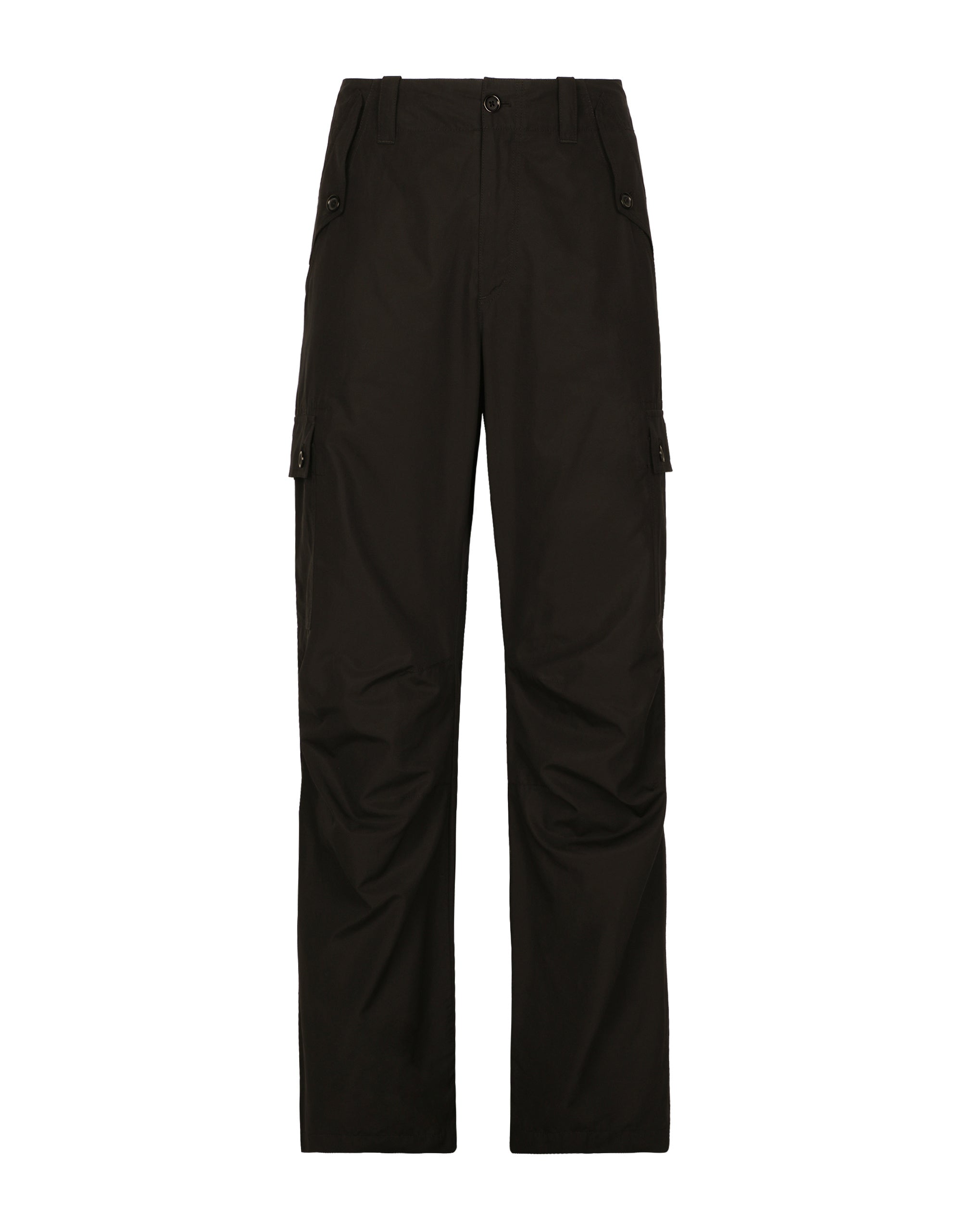 In all its beauty and modernity, the Roma collection presents an interpretation of the grandeur of Rome, whose cultural roots have made us unique in the world. The designers pay homage to masculine beauty and hedonism, reinventing and creating special pieces that make up a single total look, composed of monochrome silhouettes with Roman coin print accents, where engraved images of great emperors stand out against the unified background, for a visual result that is streetwise, young and confident. Wide-leg cargo pants in poplin and cotton with metal Dolce&Gabbana logo plate: • Black • Regular fit • Belt loops on the waist • Fly-covered zipper and button fastening • Front slant pockets with flap and button and flap pockets with button at the back • Large side pockets • The item measures 115 cm on the outer leg and the hem is 28.5 cm wide on a size IT 48 • The model is 185 cm tall and wears a size IT 48 • Made in Italy