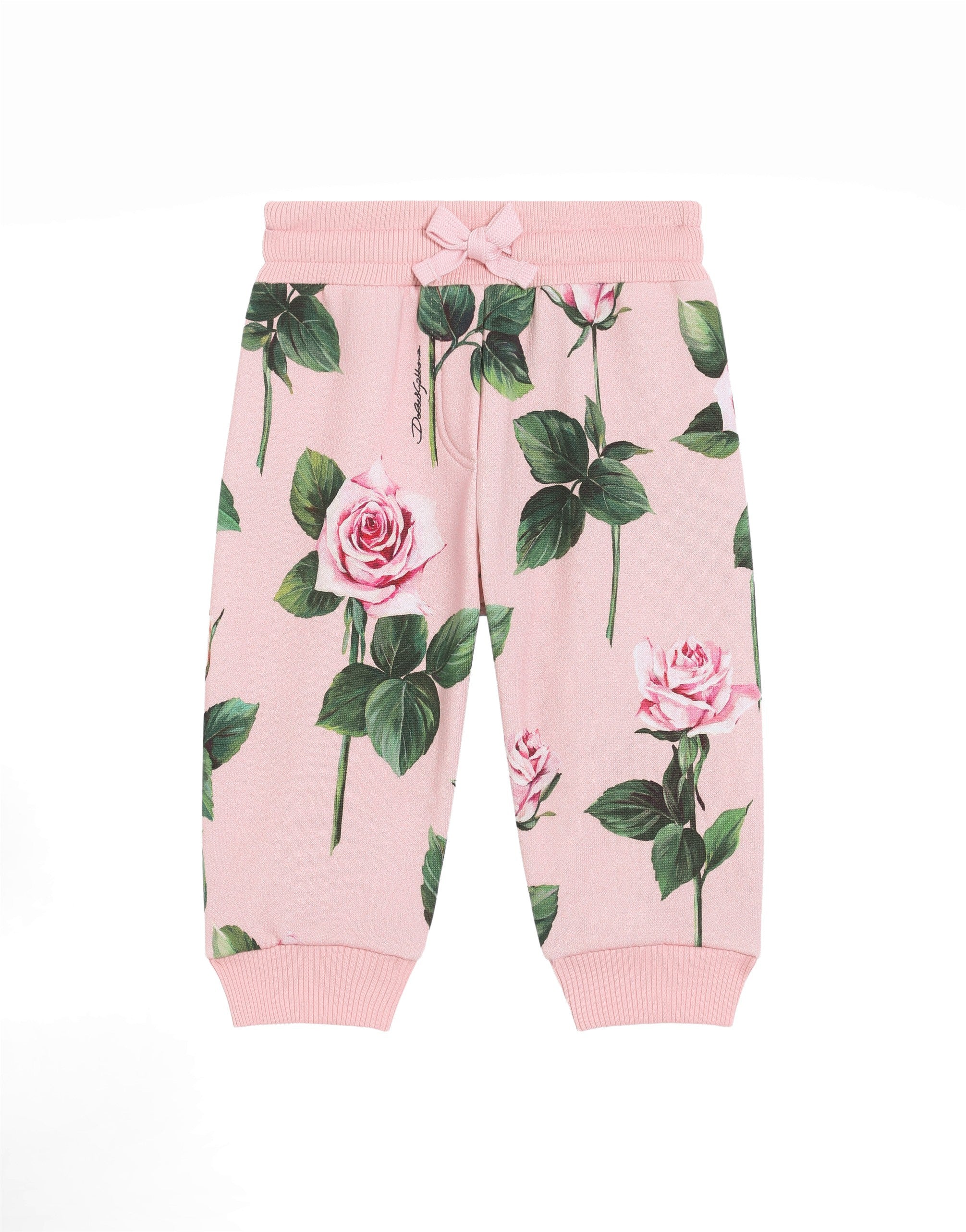 The Everyday Girl's Collection is defined by elegant Rose and Garden floral prints, luxurious fabrics like shimmering silver tweed, and striking contrasts with denim. Everyday pieces are elevated with exquisite details such as dégradé crystal DG embellishments, soft pink tulle, and pleated crêpe that add a romantic allure. Iconic golden touches, including lurex embroidery and the DG logo, complete the look with a signature flourish, making the ordinary feel truly special. Cotton fleece jogging pants with rose print: • Pink • Oversize fit • Stretch rib-knit waistband with drawstring • Decorative flap • Rib-knit ankle cuffs • All-over print • The item in the size 6/9 months measures 39 cm on the outer leg • Made in Italy The difference in the print placement that you may find on this product is a feature of Dolce&Gabbana’s “Handmade” pieces. A detail that makes every garment or accessory unique and exclusive.