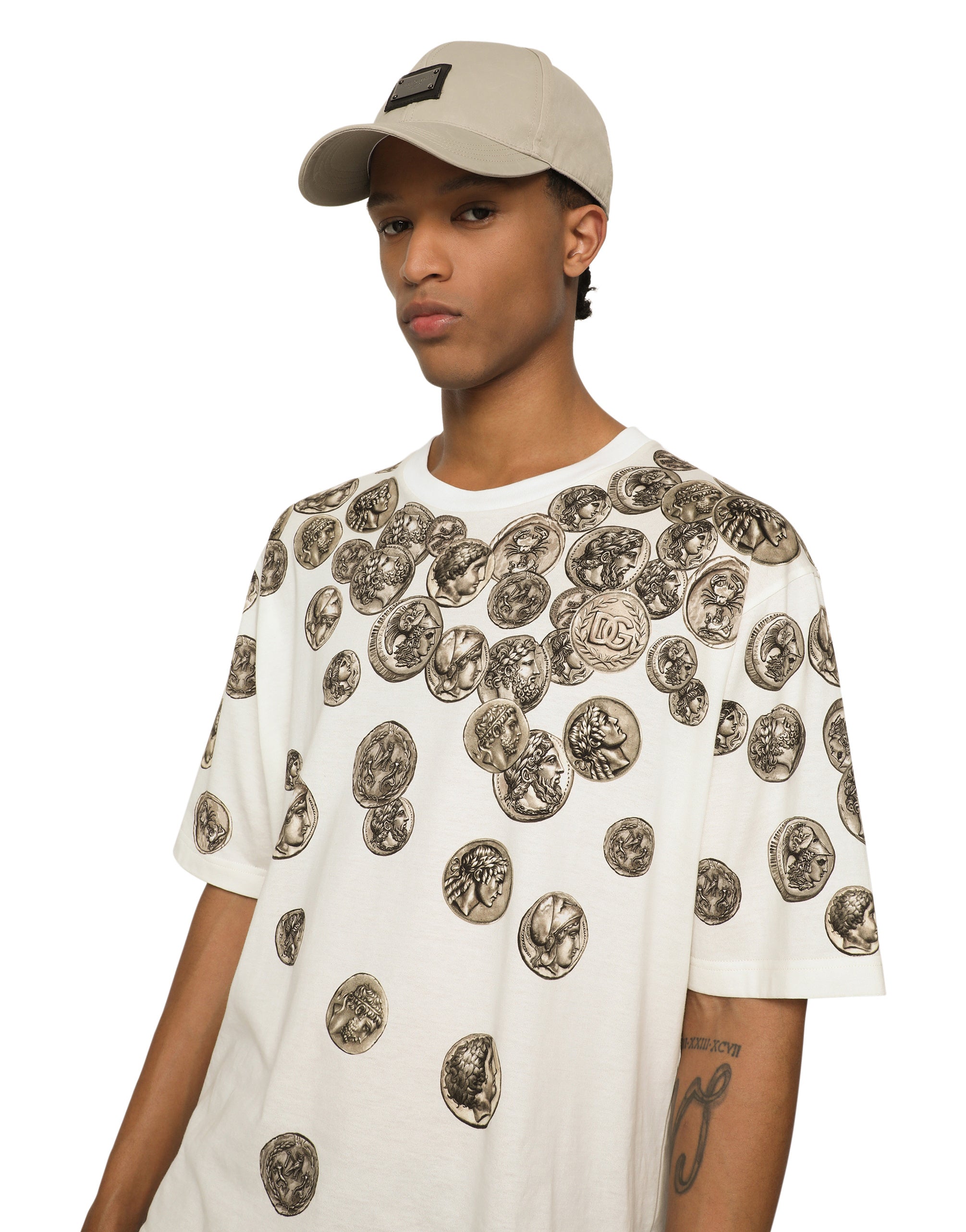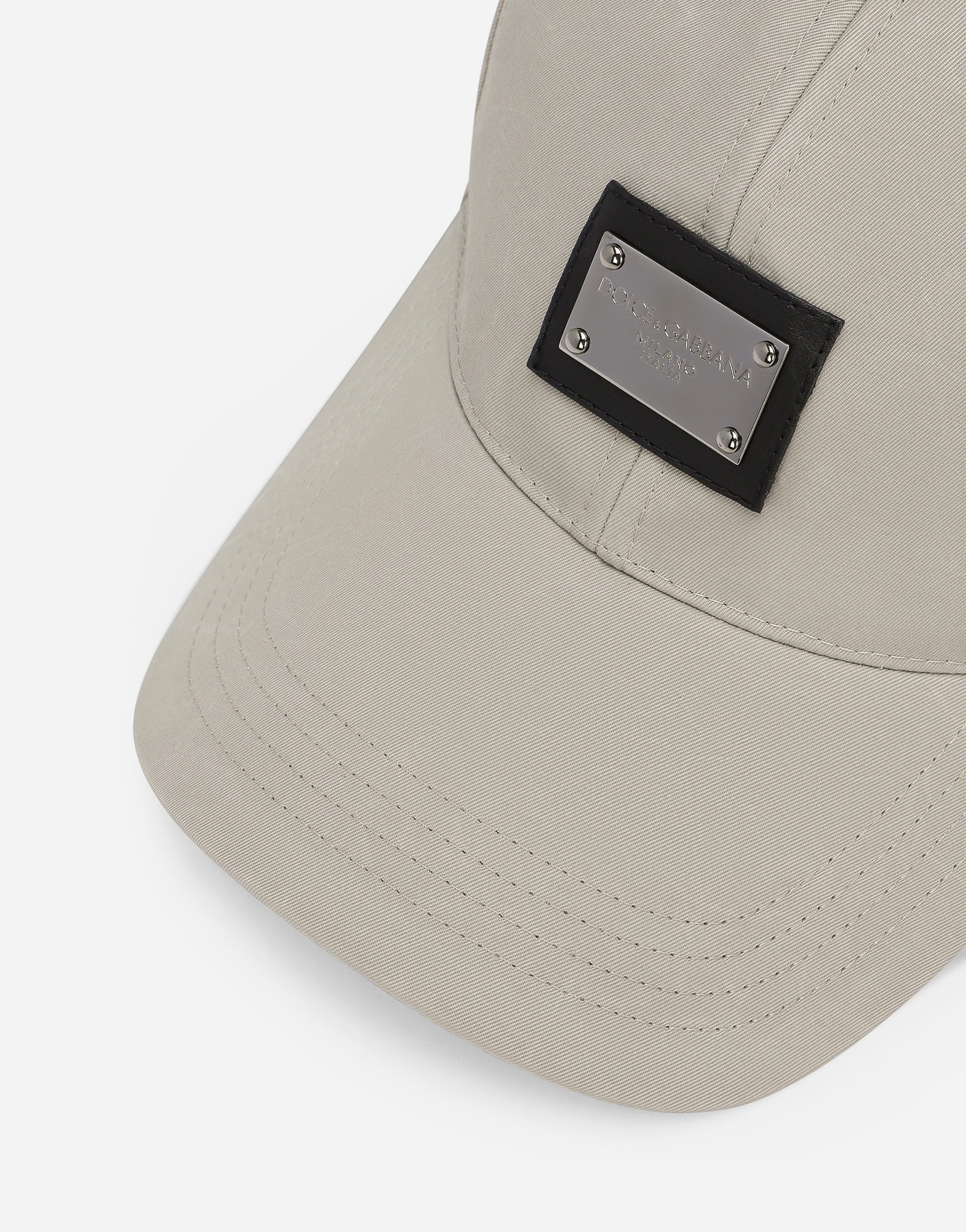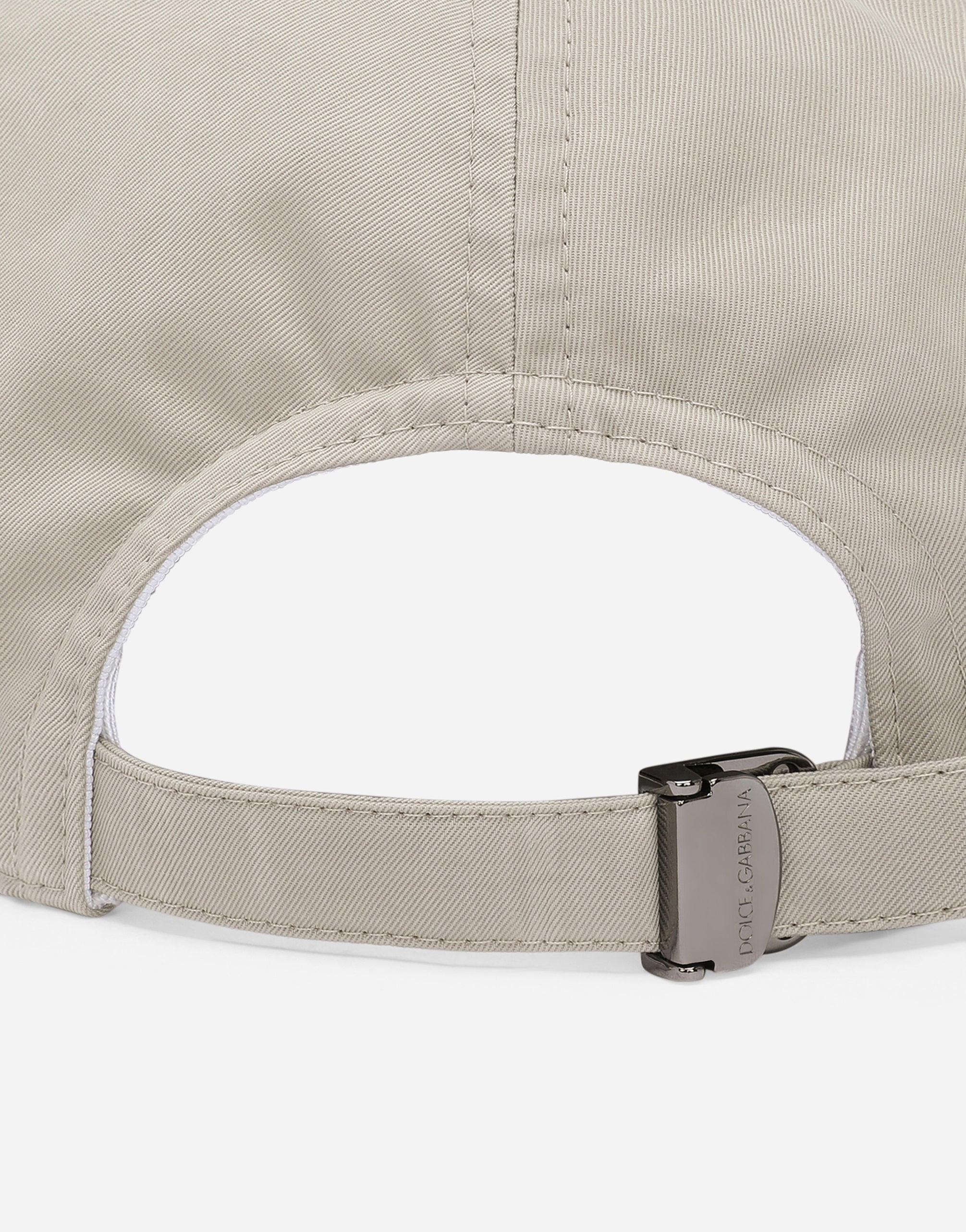 In all its beauty and modernity, the Roma collection presents an interpretation of the grandeur of Rome, whose cultural roots have made us unique in the world. The designers pay homage to masculine beauty and hedonism, reinventing and creating special pieces that make up a single total look, composed of monochrome silhouettes with Roman coin print accents, where engraved images of great emperors stand out against the unified background, for a visual result that is streetwise, young and confident. Cotton gabardine baseball cap with Dolce & Gabbana logo plate: • Beige • Adjustable rear strap with branded metal buckle • Gros-grain sweatband • Lined • Made in Italy