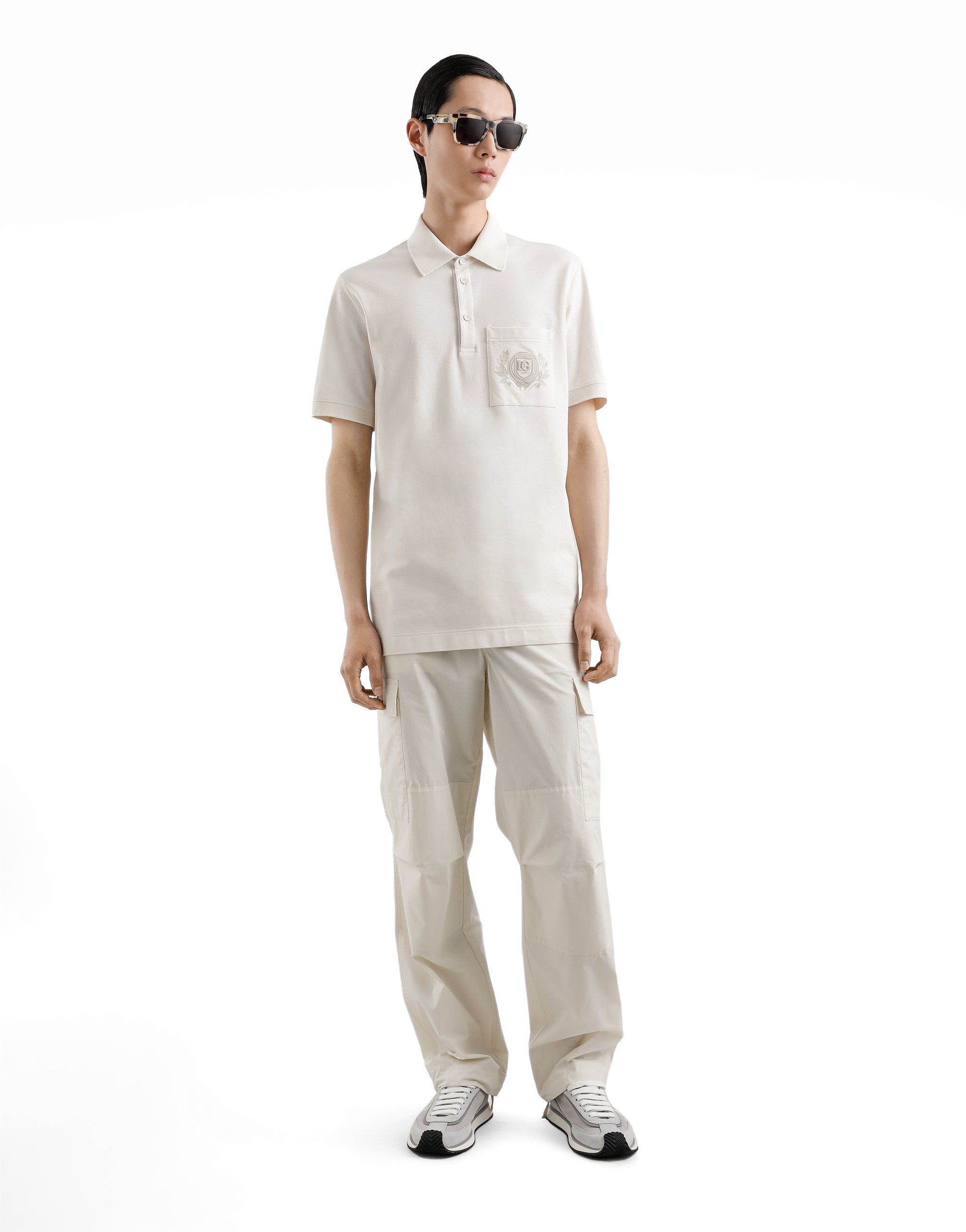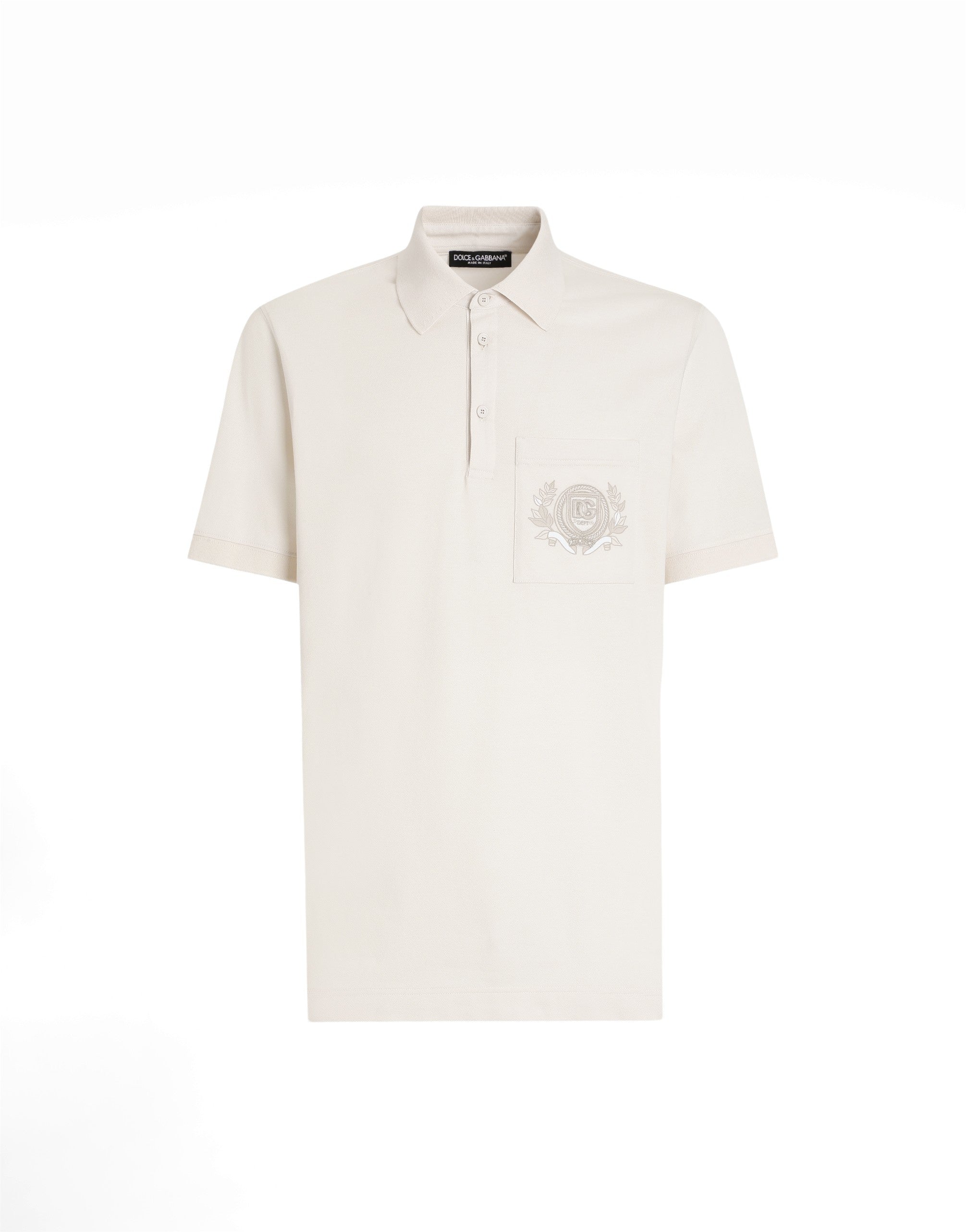 The DNA Men's Collection reimagines daily wear with bold contrasts, meticulous details, and innovative silhouettes. Outerwear stands out with clean lines and high-tech materials, merging sportiness with sophistication in sweaters, sweatshirts, and trousers. A striking color palette, including Black Sicily, caramel, cream, burgundy, and stone gray, pairs with iconic prints like Leopard and Polka dots, enhancing the collection's authentic and refined look. Cotton piqué polo-shirt with DG logo embroidery: • Cream • Regular fit • Button fastenings • Short sleeves • Breast pocket with logo • Fine-rib sleeve trims and neck • Fine-rib sleeve trims and neck • The piece measures 75.5 cm from the shoulder seam on a size IT 48 • Made in Italy