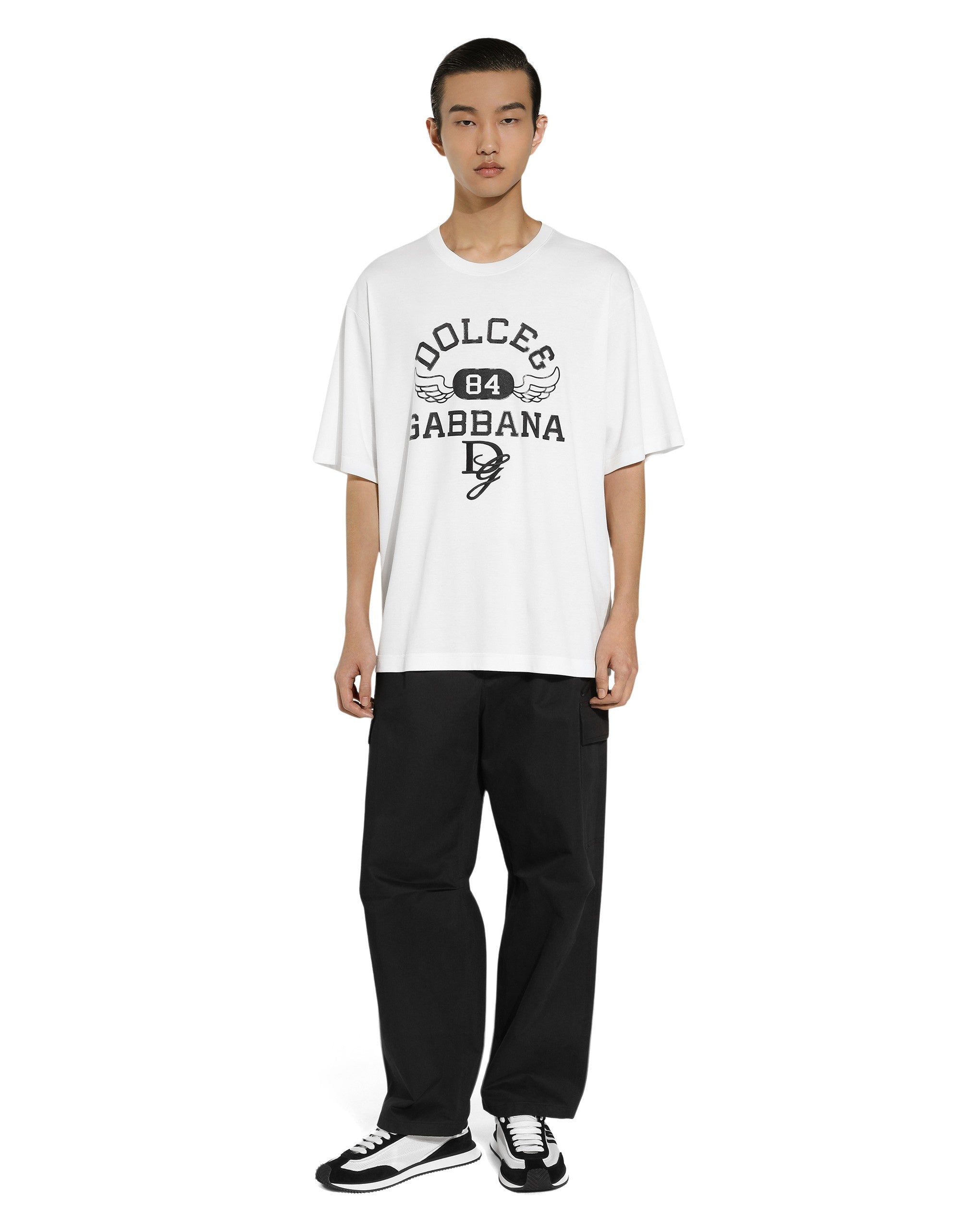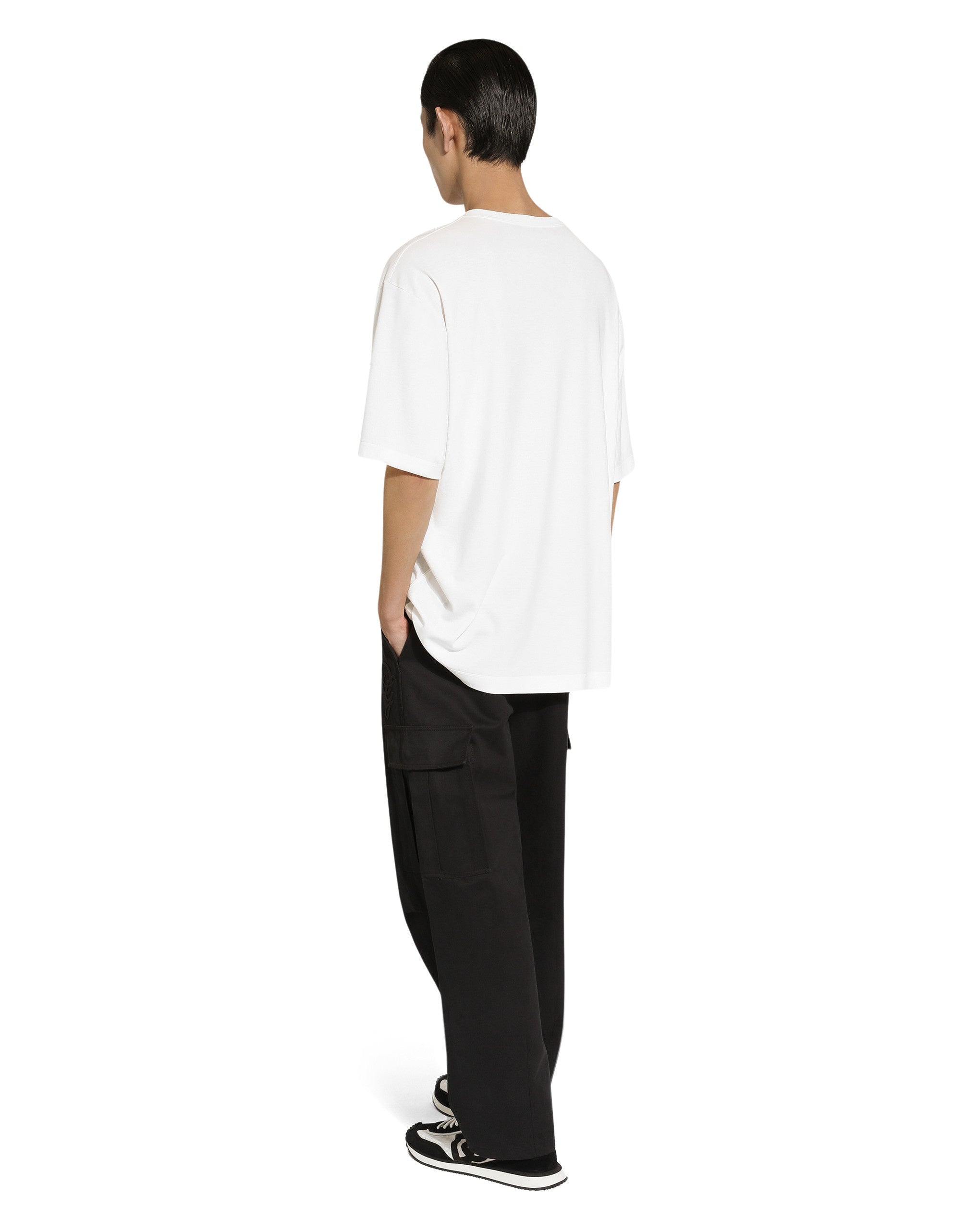 Contemporary men’s formalwear: The FW 24/25 Dolce&Gabbana Men’s Collection is embracing the concept of absolute elegance dominated by the iconic Nero Sicilia black. The daywear of the Dolce&Gabbana man comes to life through the outerwear that comes in a range of lengths and the slim-fit pants. For nightwear, the look becomes scintillating thanks to sequined embellishment and stone appliqués. This refined taste can also be seen on the accessories, such as on the slip-ons with hand-applied organza flower accent and the new clutch. Cotton crepe round-neck T-shirt with Dolce&Gabbana logo: • White • Regular fit • Short sleeves • The piece measures 73 cm from the shoulder seam on a size IT 48 • Made in Italy