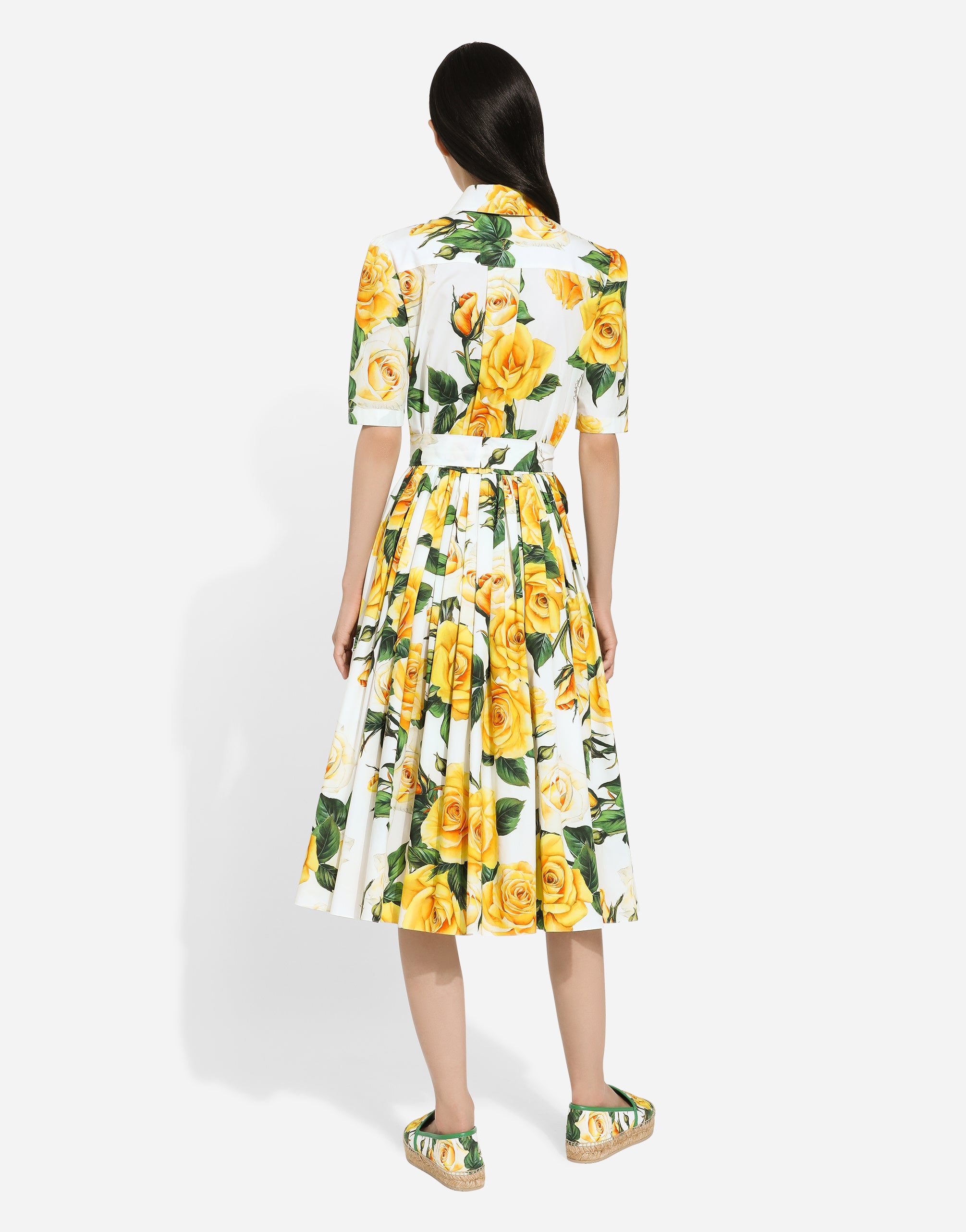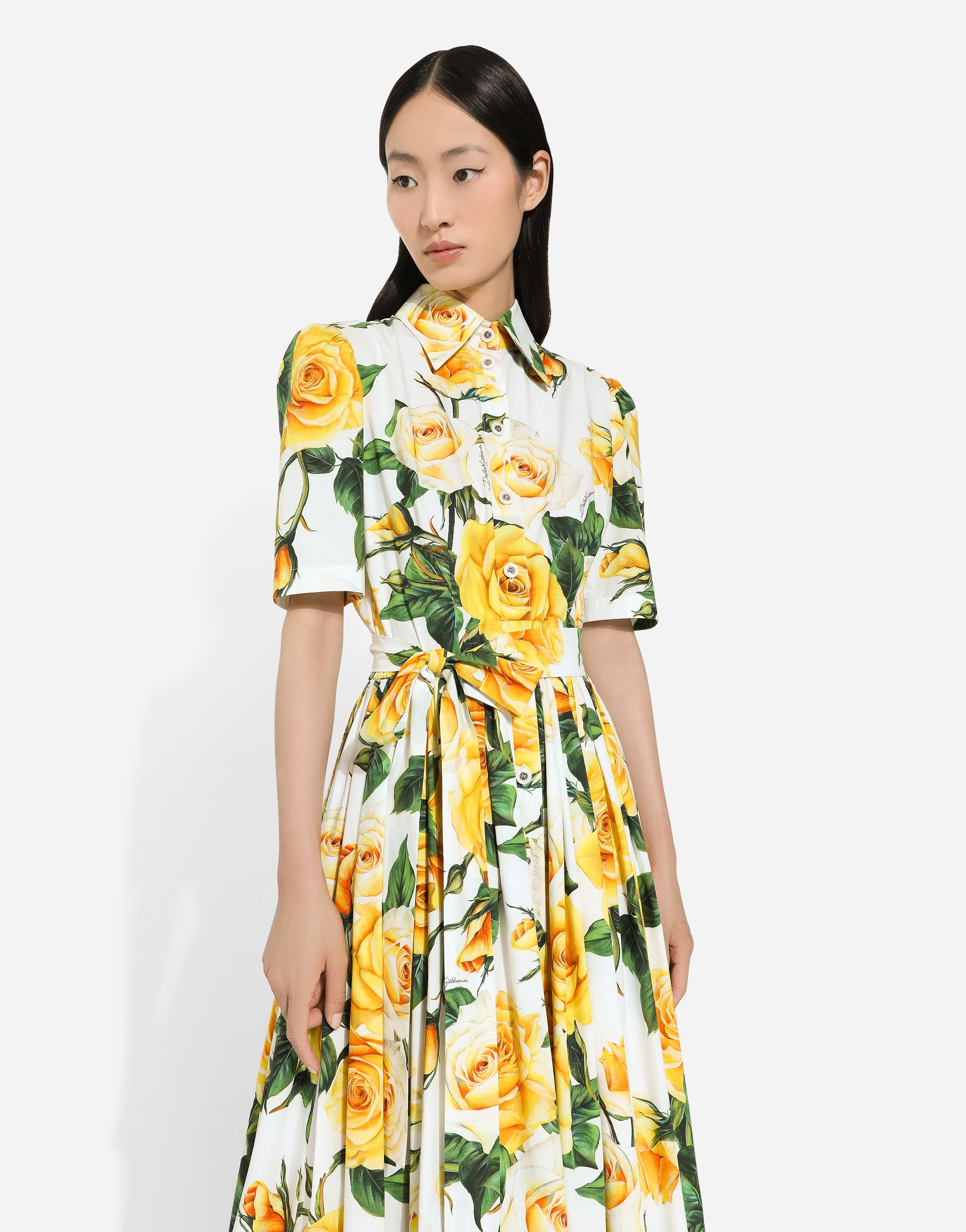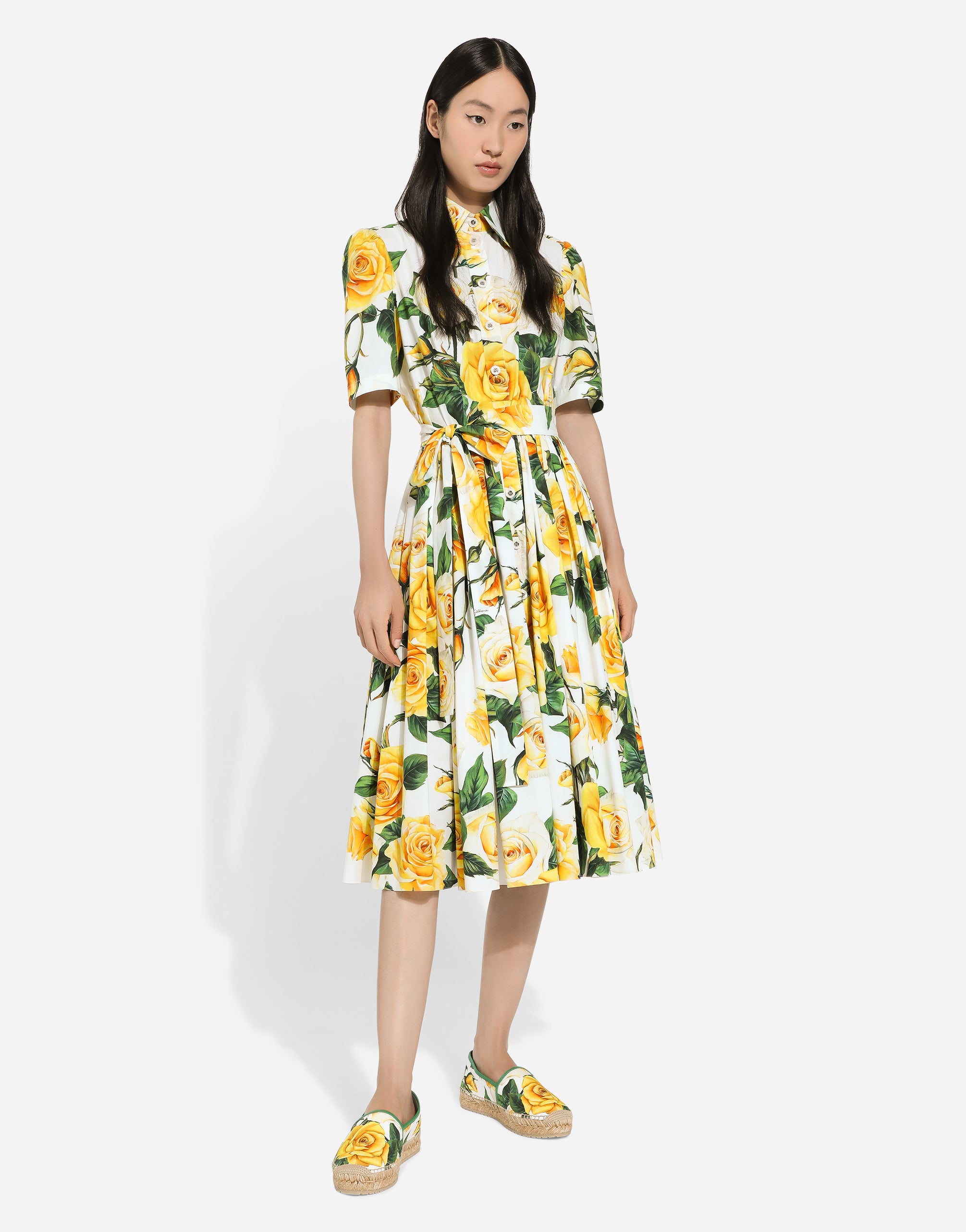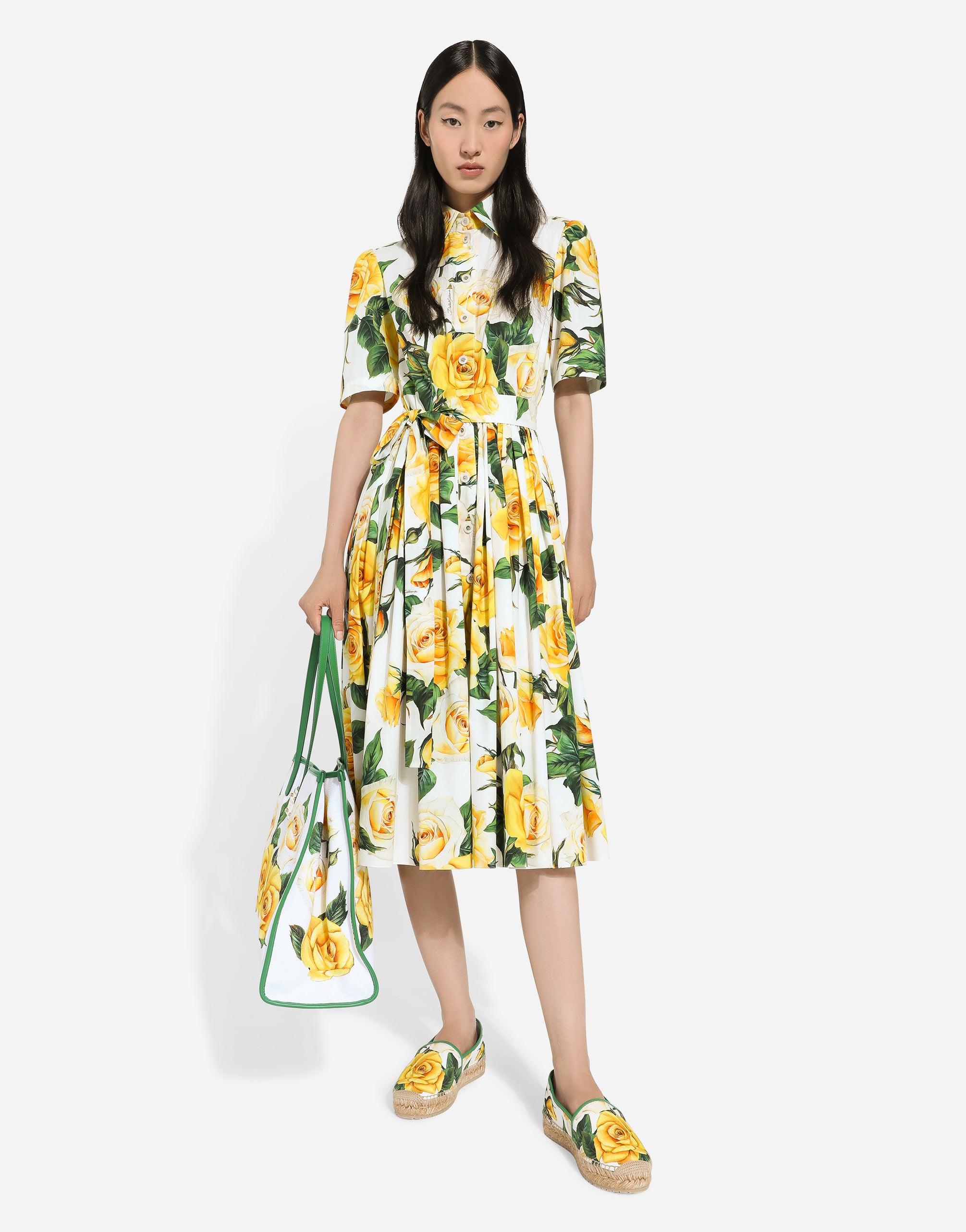 The Flowering Collection has us dreaming of faraway destinations, the most exclusive ones in the world, inviting us through the colors and the yellow rose print to take refuge in warm and unique places. Light White, lemon yellow, polka-dot accents and the various shades of leaf green for vibrant and ultra-feminine pieces where the keyword is tailoring. Every look invites us to savor and dream every moment of our free time, to discover beauty and enhance our femininity. Cotton poplin shirt dress with yellow rose print: • Multi-colored • Shirt collar • Short sleeves • Belted waist • Unlined • Buttons and belt on the front • The piece measures 70 cm from the waist down on a size IT 40 • The model is 175 cm tall and wears a size IT 40 • Made in Italy The difference in the print placement that you may find on this product is a feature of Dolce&Gabbana’s “Handmade” pieces. A detail that makes every garment or accessory unique and exclusive.