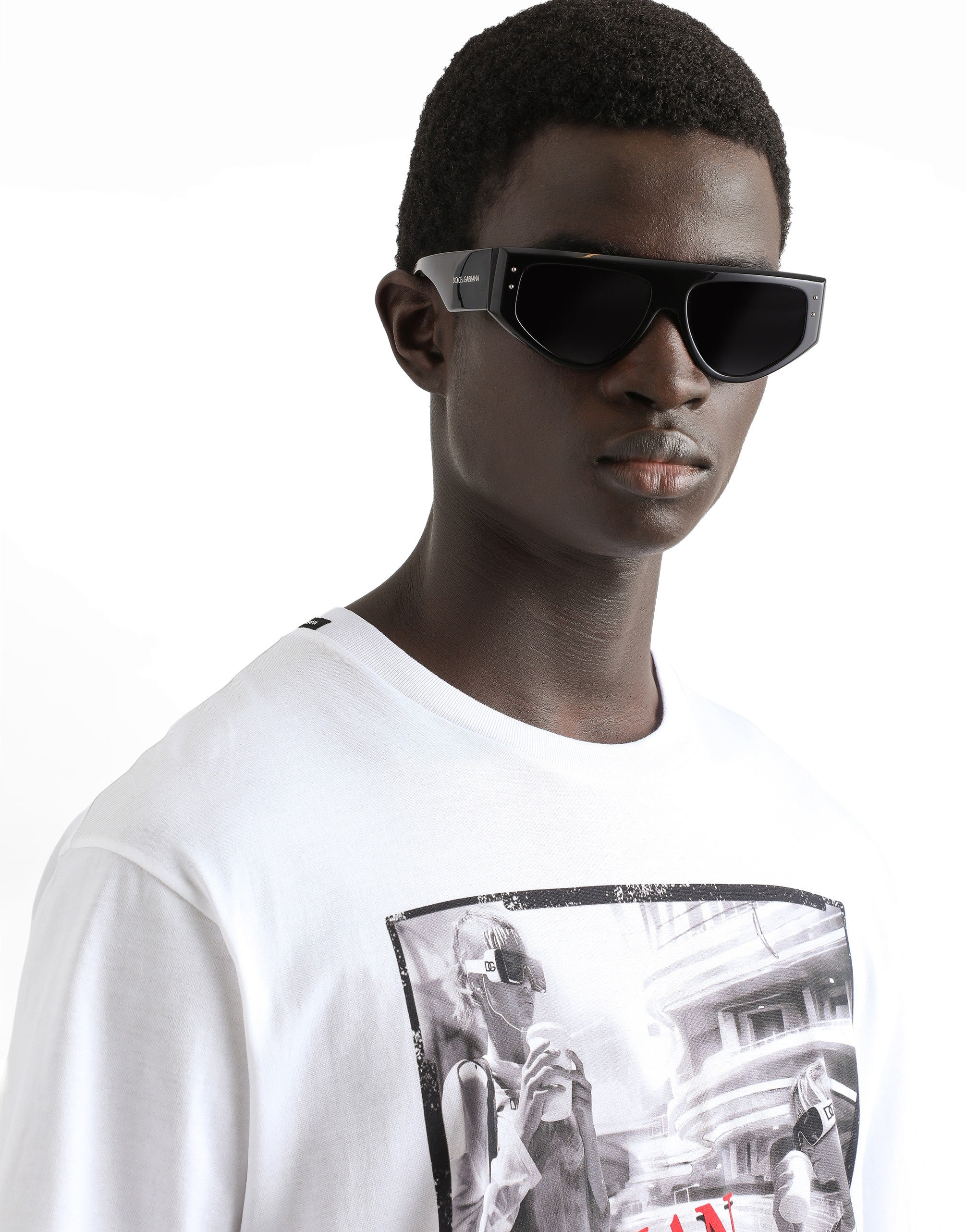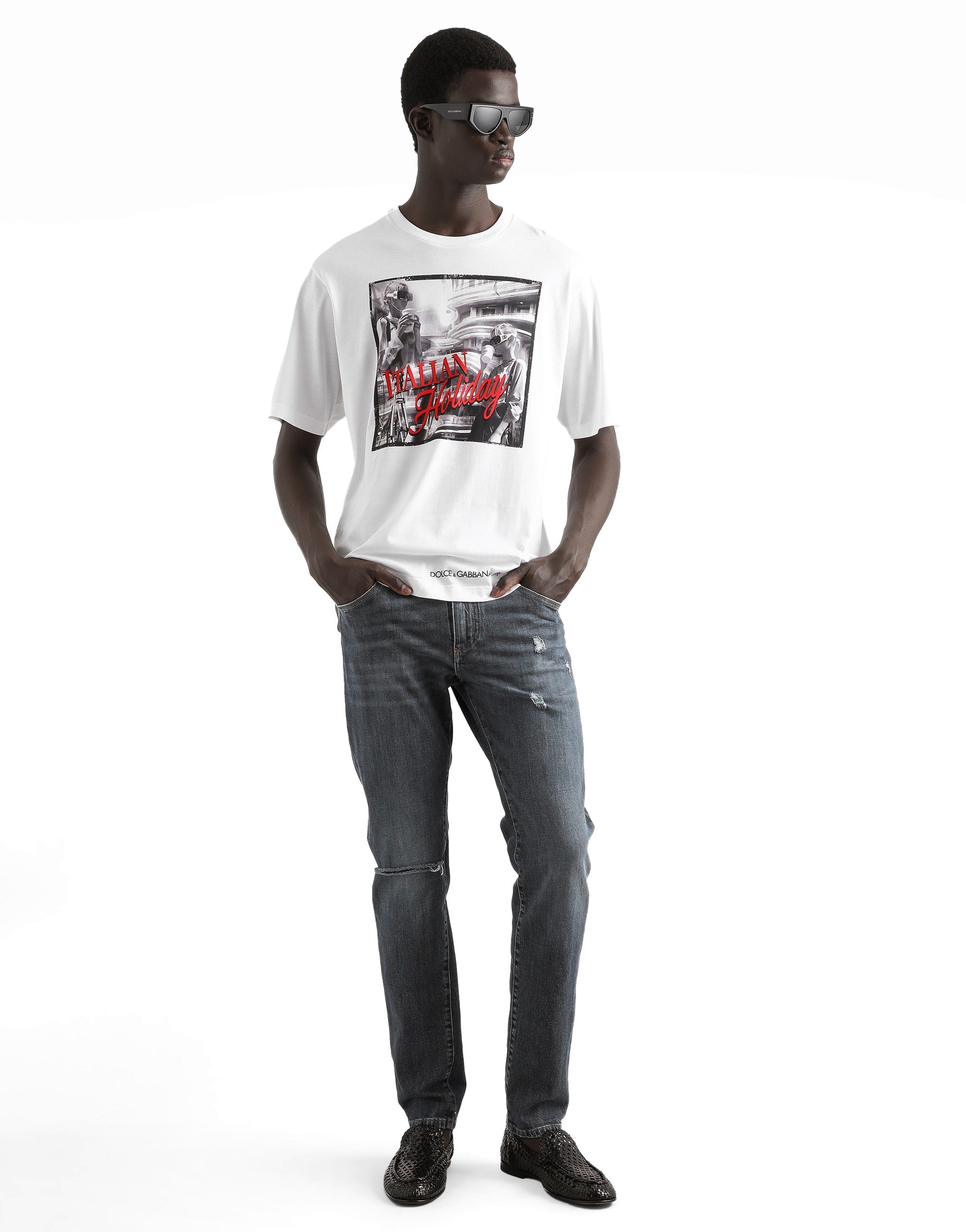 The Italian Holiday Men's Collection revisits 1950s style with a blend of relaxed fits and modern flair. Classic white shirts and tailored suits in refined fabrics contrast with casual denim and playful T-shirts featuring retro graphics with a futuristic twist. Bold prints—chessboards, cats, elegant lighters, and Mediterranean blue ribbons—alongside logo jacquard inspired by ties, infuse a contemporary edge into the essence of Italian holidays. Cotton jersey T-shirt with Italian Holiday print: • White • Regular fit • Short sleeves • The piece measures 73 cm from the shoulder seam on a size IT 48 • Made in Italy The difference in the print placement that you may find on this product is a feature of Dolce&Gabbana’s “Handmade” pieces. A detail that makes every garment or accessory unique and exclusive.