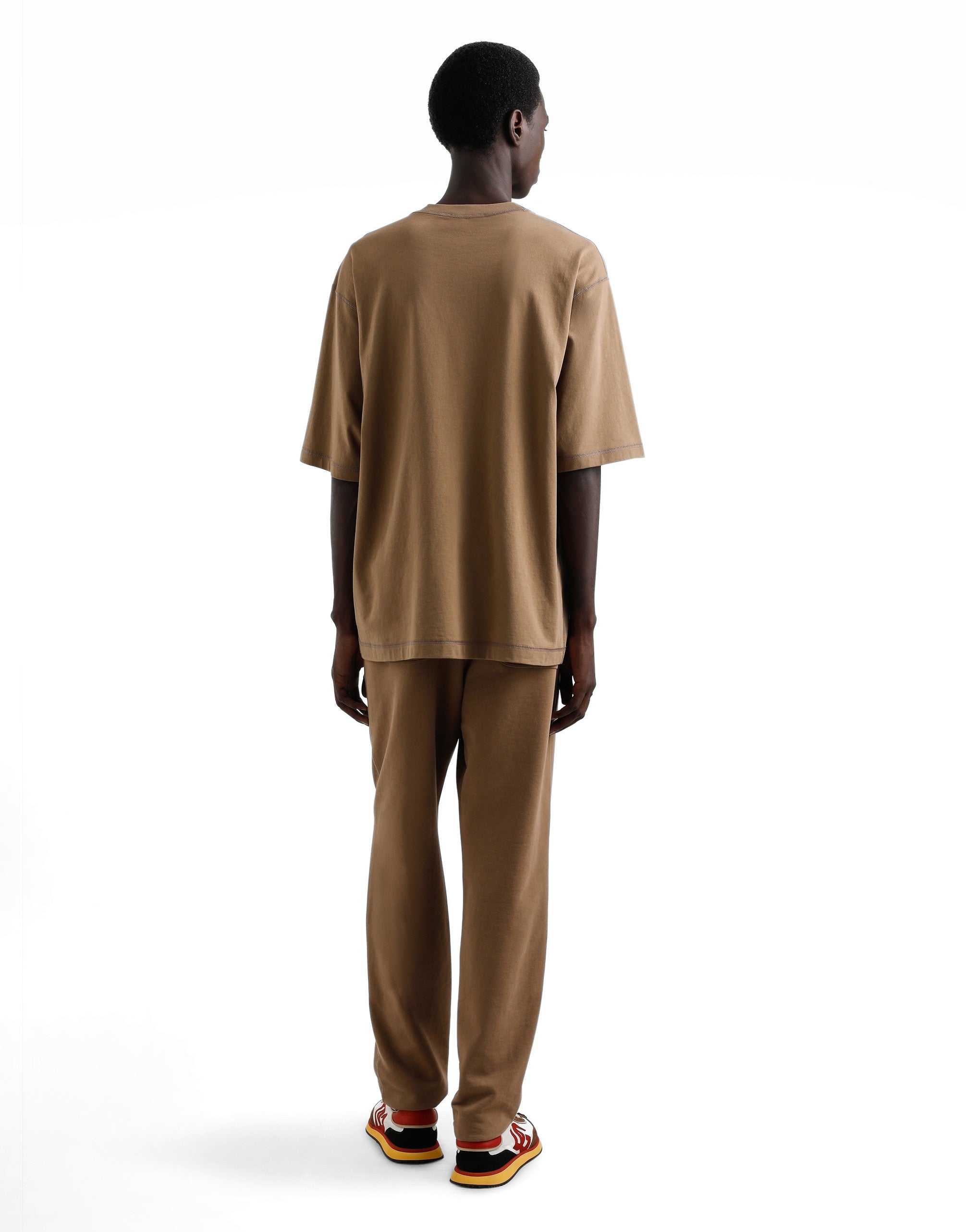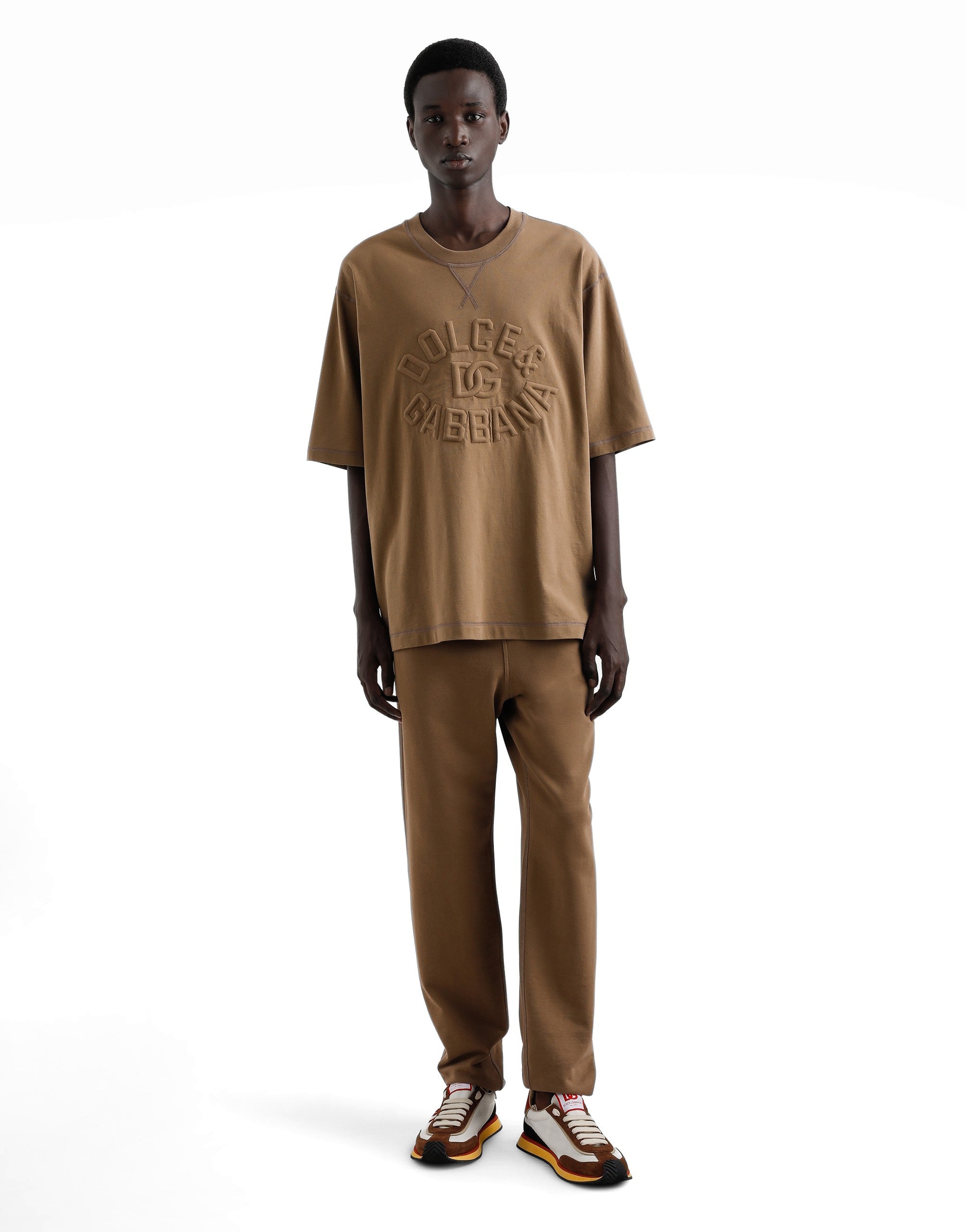 The DNA Men's Collection reimagines daily wear with bold contrasts, meticulous details, and innovative silhouettes. Outerwear stands out with clean lines and high-tech materials, merging sportiness with sophistication in sweaters, sweatshirts, and trousers. A striking color palette, including Black Sicily, caramel, cream, burgundy, and stone gray, pairs with iconic prints like Leopard and Polka dots, enhancing the collection's authentic and refined look. Cotton jersey T-shirt with embroidered Dolce&Gabbana logo: • Brown • Regular fit • Knit neck, sleeves and hem • Short sleeves • The piece measures 71.5 cm from the shoulder seam on a size IT 48 • Made in Italy