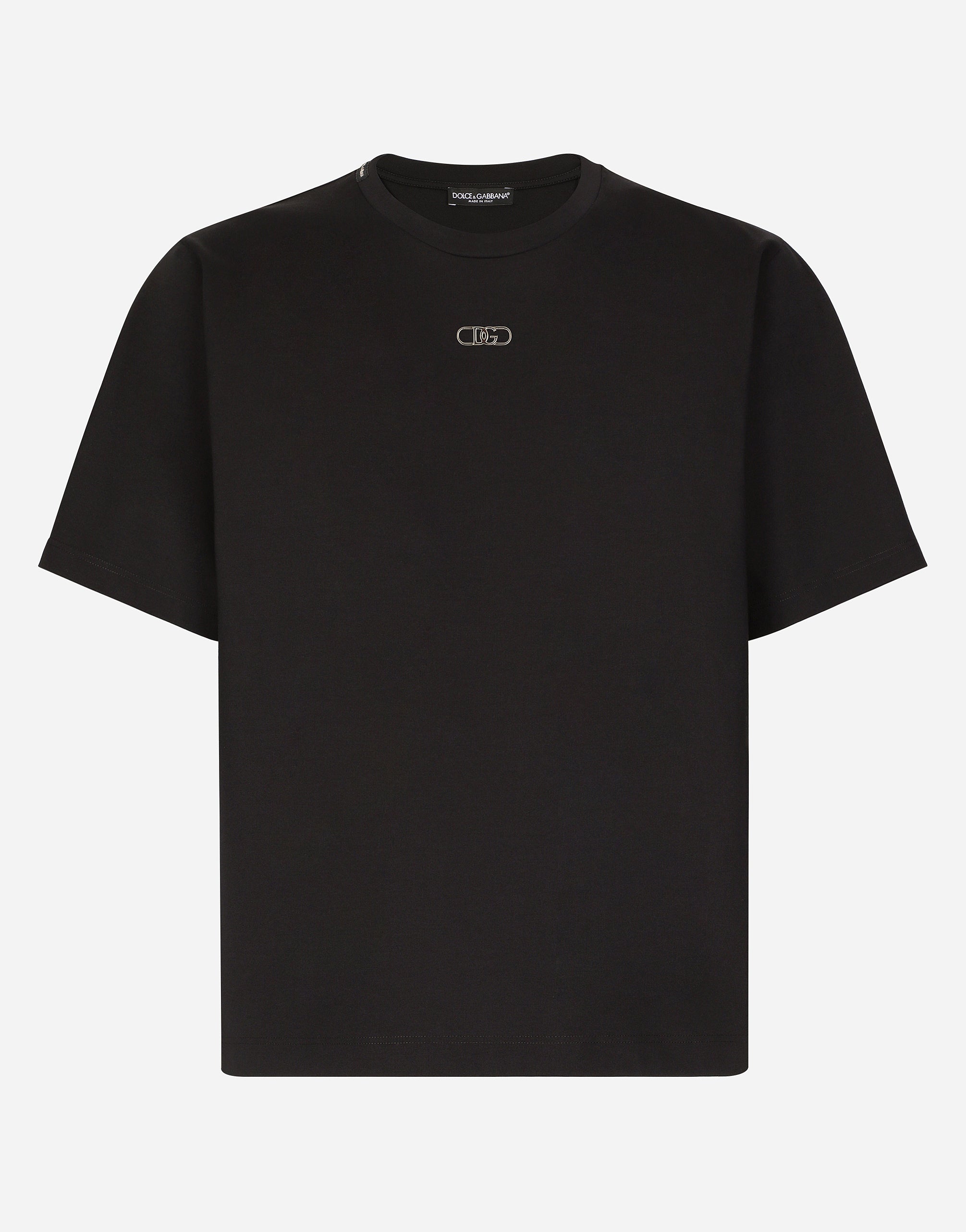 Tailoring means beauty, proportions, skilled cuts and sophisticated details. The FW 24-25 Sartoriale Collection builds on this solid foundation to define new ways of pairing colors, materials and textures. Sicilian rock gray envelops different textures, while Nero Sicilia black adorns textile and velvet weaves and camel pairs with orange. Various types of pinstripes, textured-effect cashmere, double fabrics, suede and denim meet in the looks. Cotton jersey T-shirt with metallic DG logo embellishment: • Black • Regular fit • Stretch knit round neck • Short sleeves • The piece measures 73 cm from the rear collar seam on a size IT 48 • Made in Italy