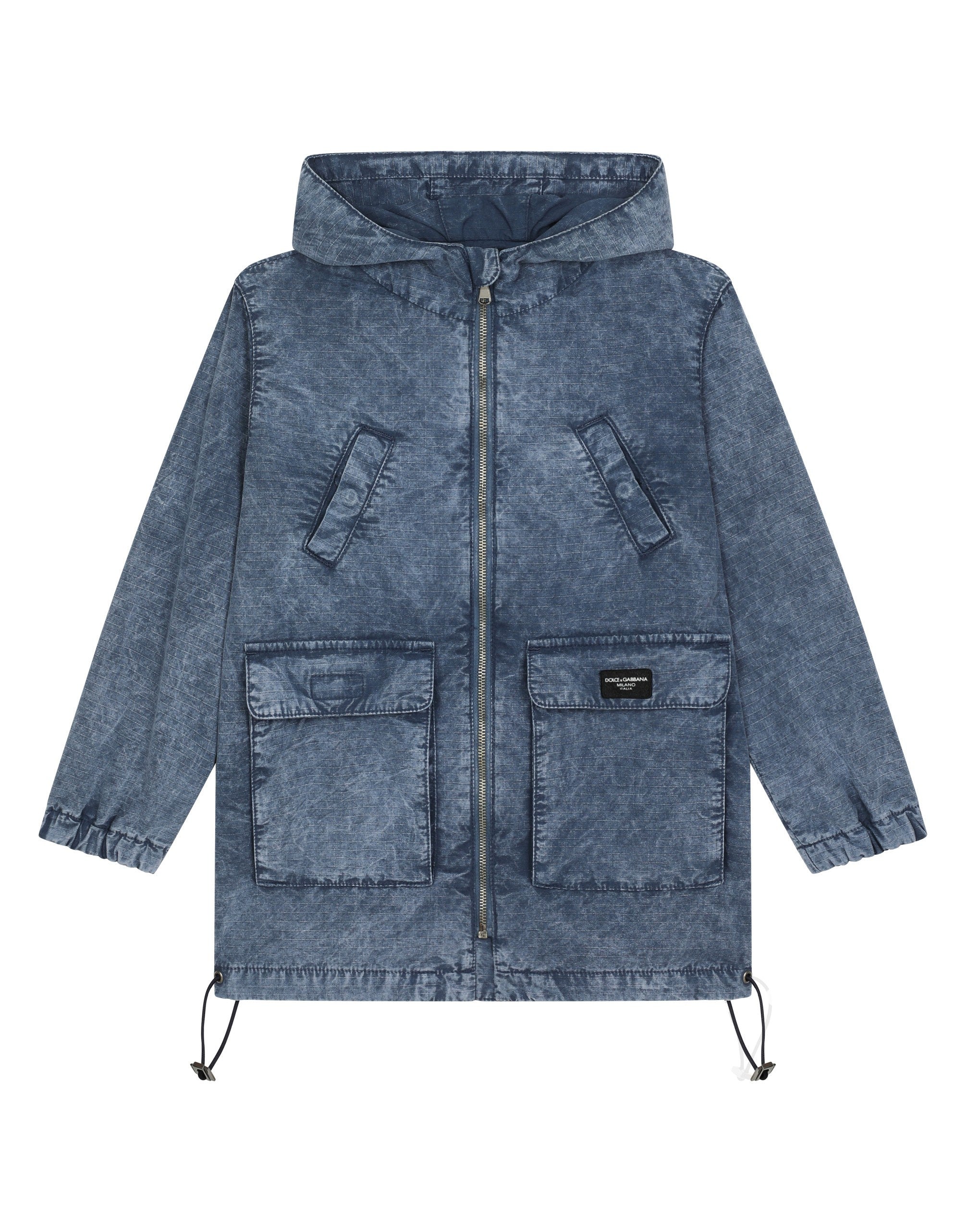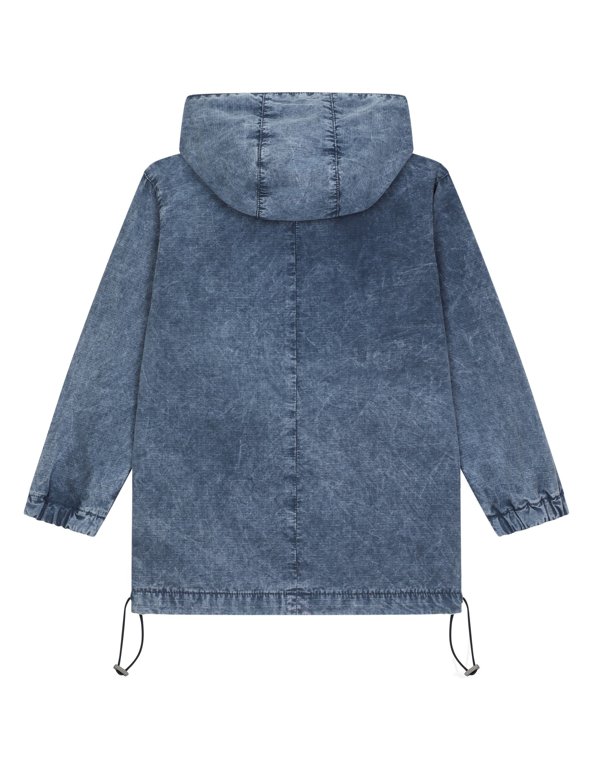 The inspiration is LA, one of the most beautiful, diverse and varied cities in the world. The collection presents a closet distinguished by an attitude that enhances the mix and match present in this incredible multifaceted city. Black, gray, brown, lilac, purple and red merge with oversize shapes packed with special treatments, recreating looks that are perfect for an immersive experience in the city’s lifestyle a place where fashion and innovation come together to create a new expressive language. Denim-effect cotton windbreaker: • Blue • Oversize fit • Neck with hood • Long sleeves with elastic • Welt breast pockets with concealed button • Lower front pockets with flap and hook-and-loop fastening • Rubberized logo plate • Drawstring hem • Front zipper fastening • The item in the size 6 years measures 58 cm from the shoulder seam • Made in Italy
