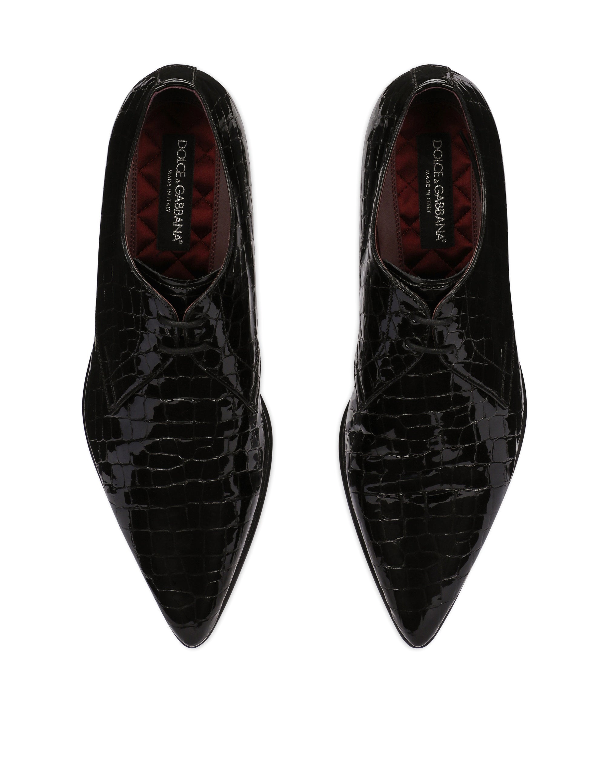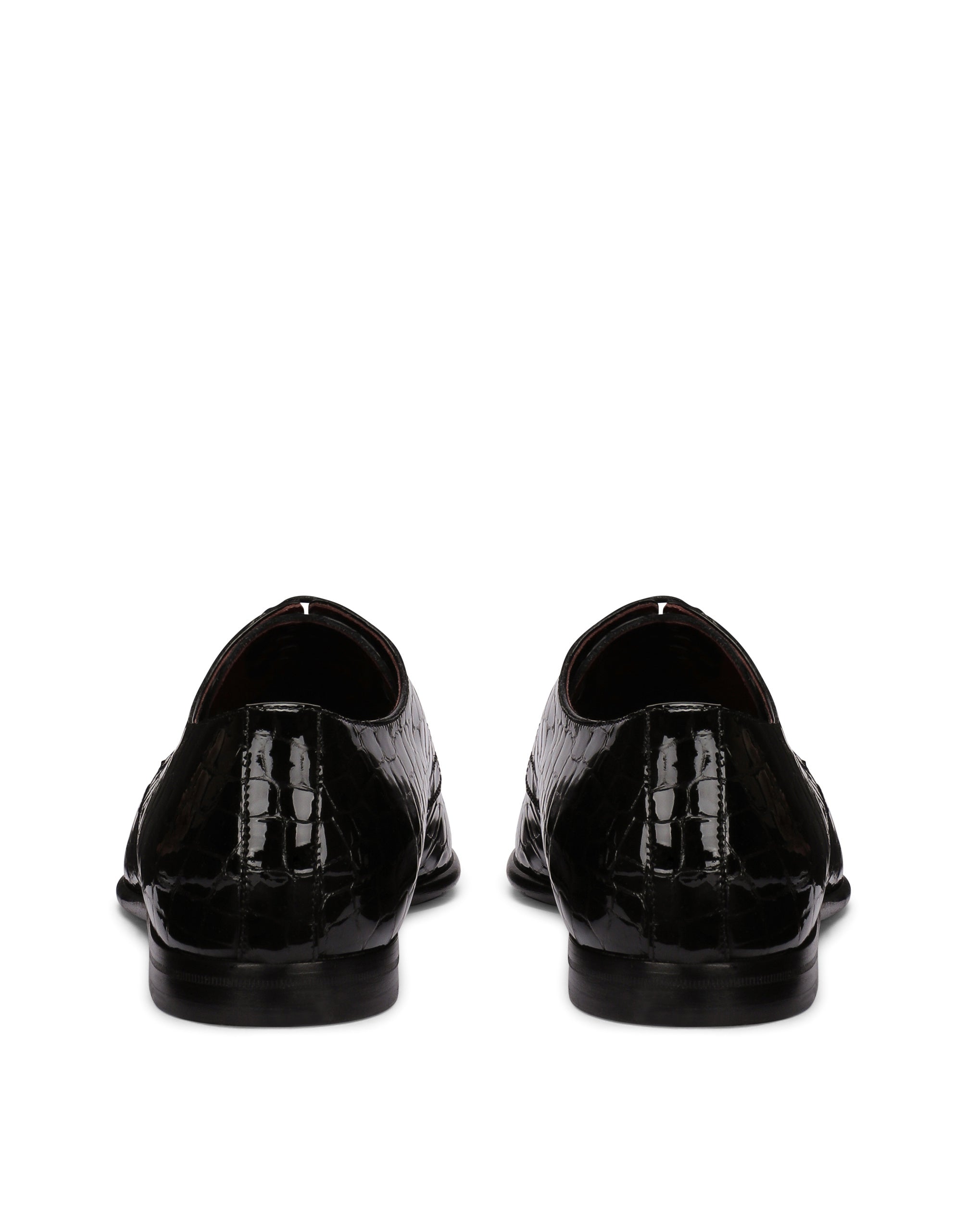 Flaunting bold, contemporary allure, these Achille Derby shoes come in soft crocodile-print calfskin. • Waxed laces • Leather-covered heel • Leather insole with quilted satin insert and branded label • Leather sole • Made in Italy