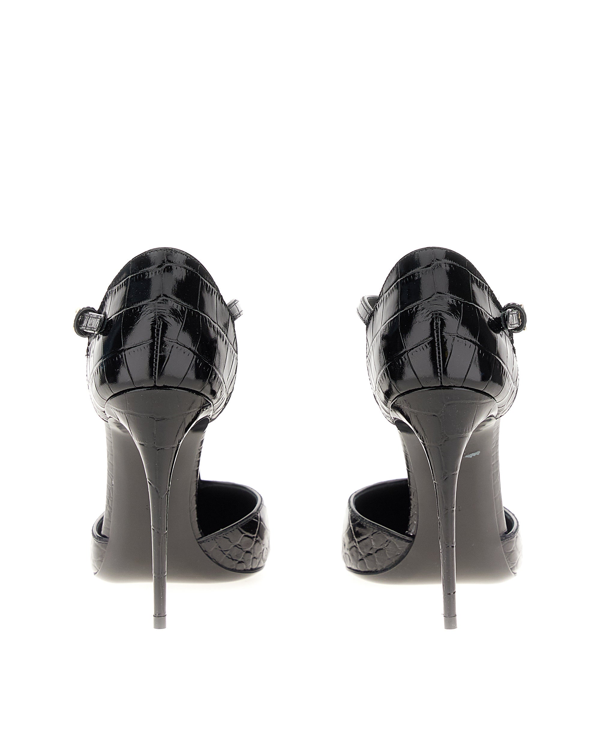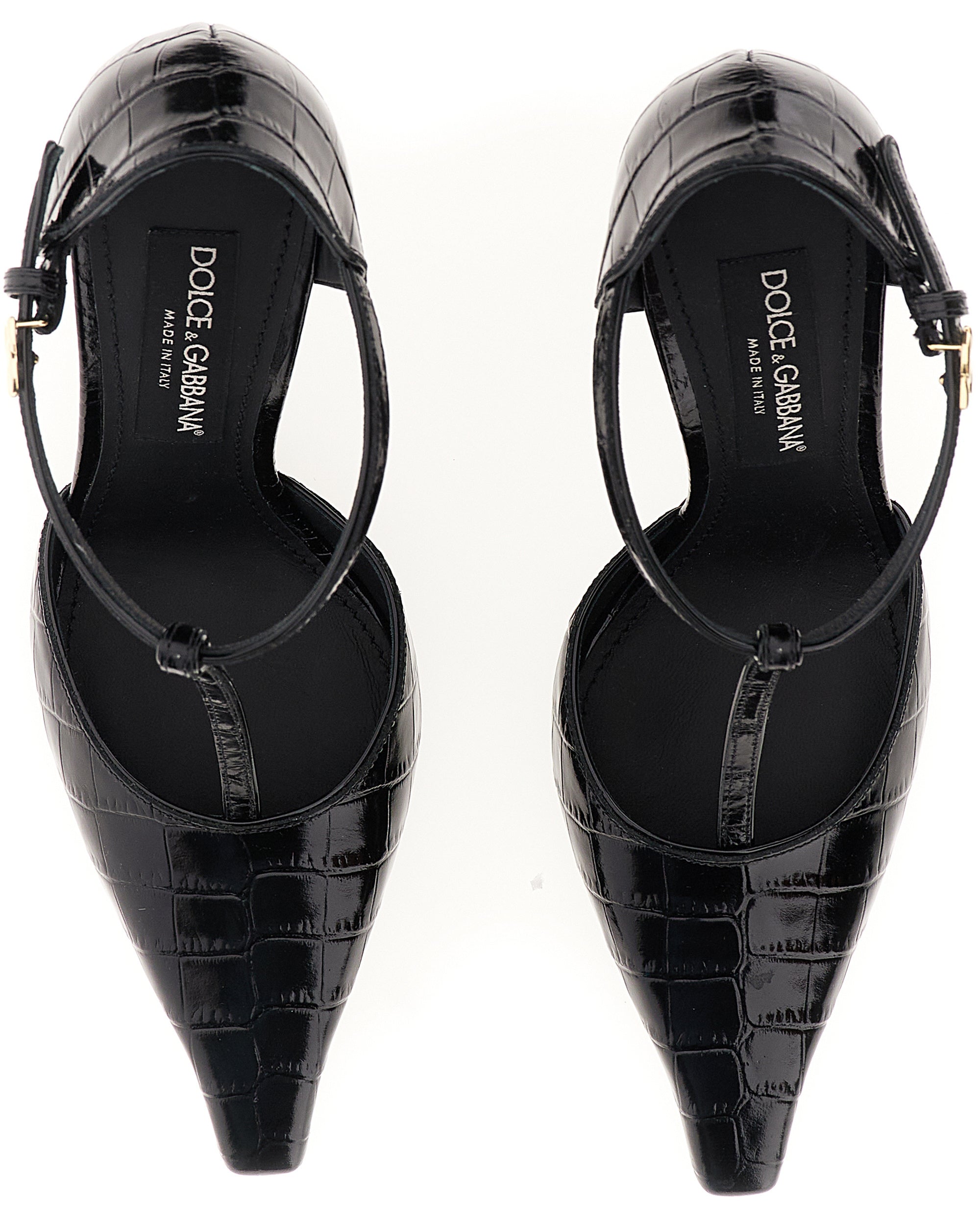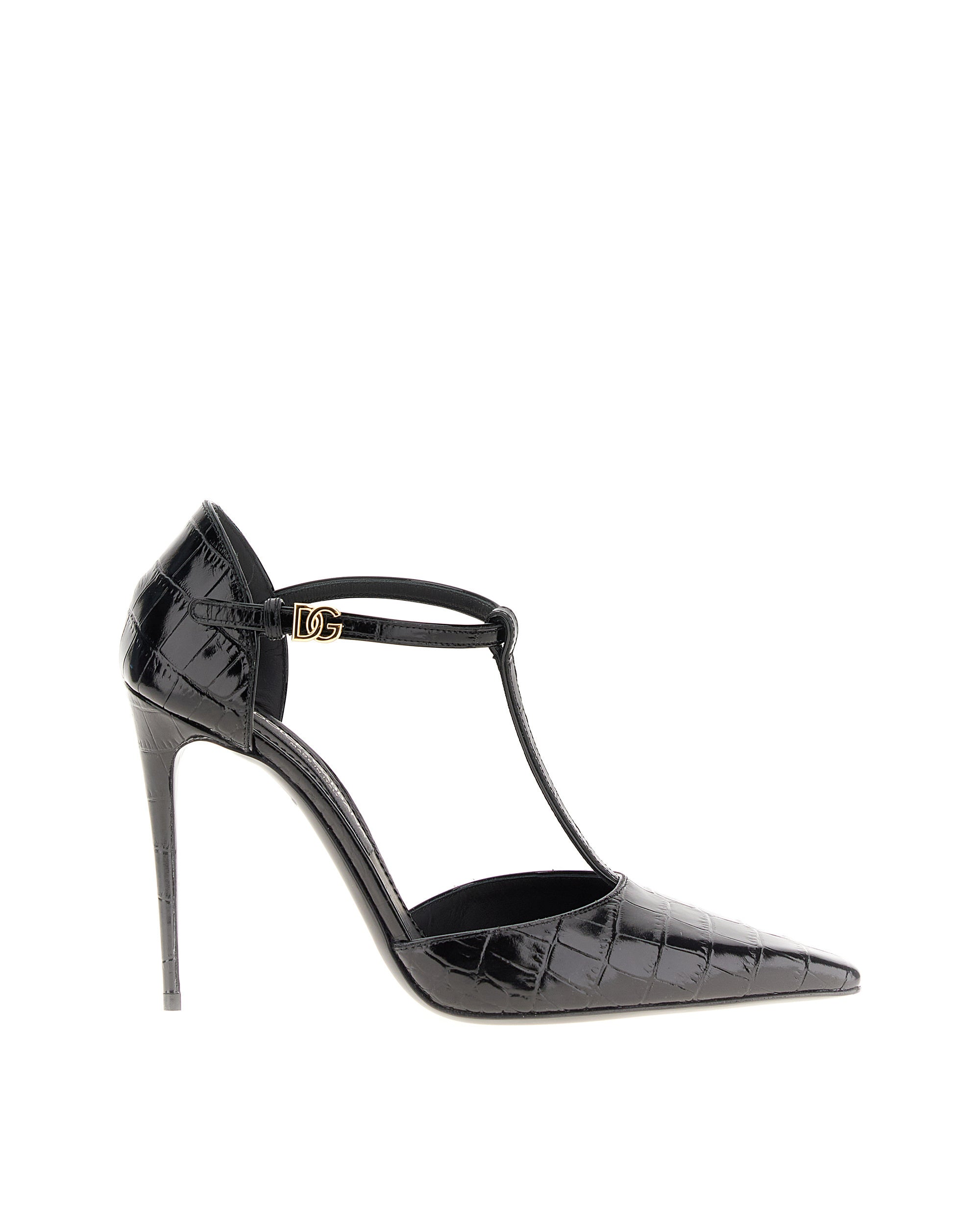 These new Mun T-bar pumps come in crocodile-print calfskin and feature the DG logo in light gold-plated metal. Crocodile-print calfskin T-bar pumps: • Black • 105-mm heel • Kidskin insole with branded label • Branded leather sole • Item comes with a branded dust bag • Made in Italy
