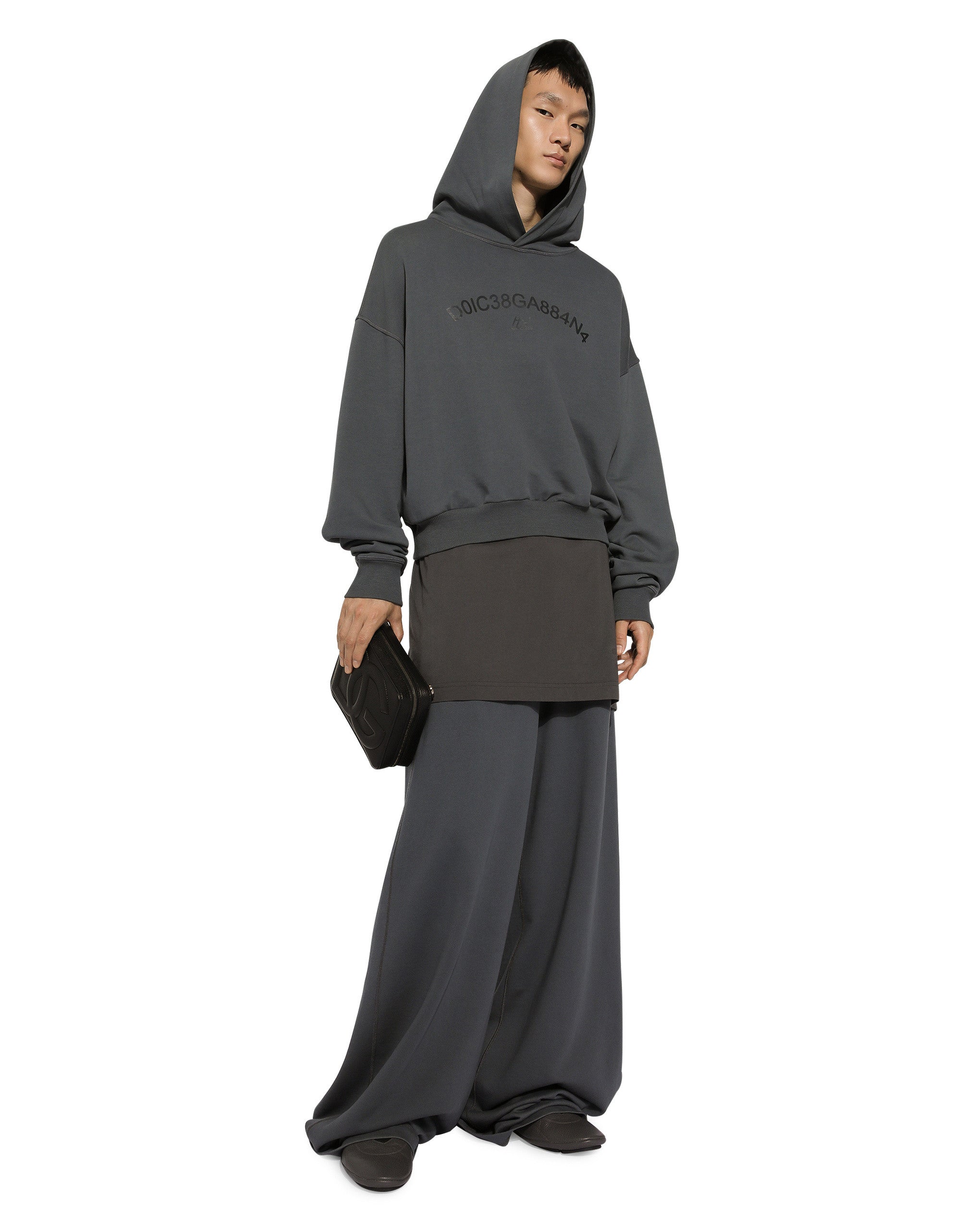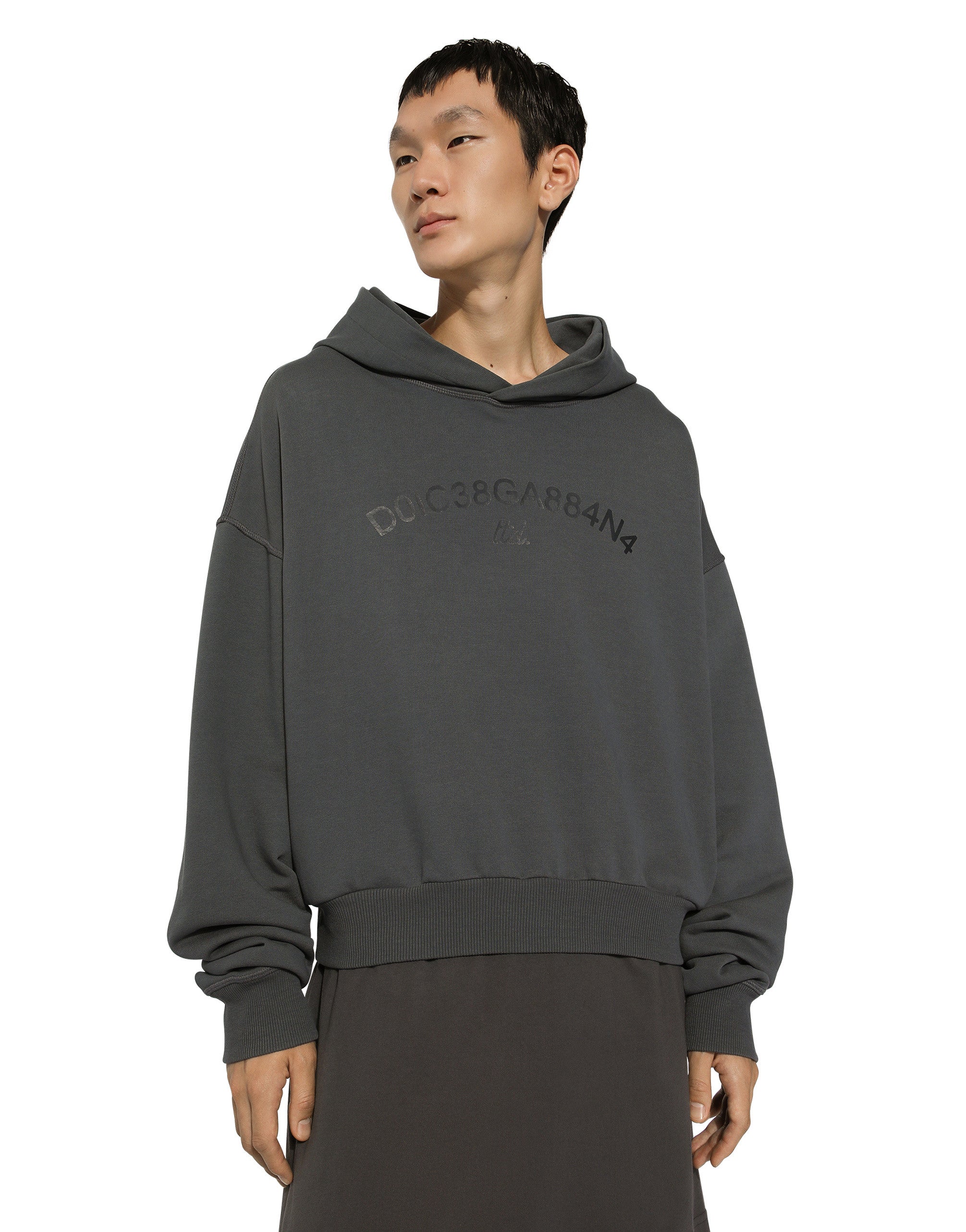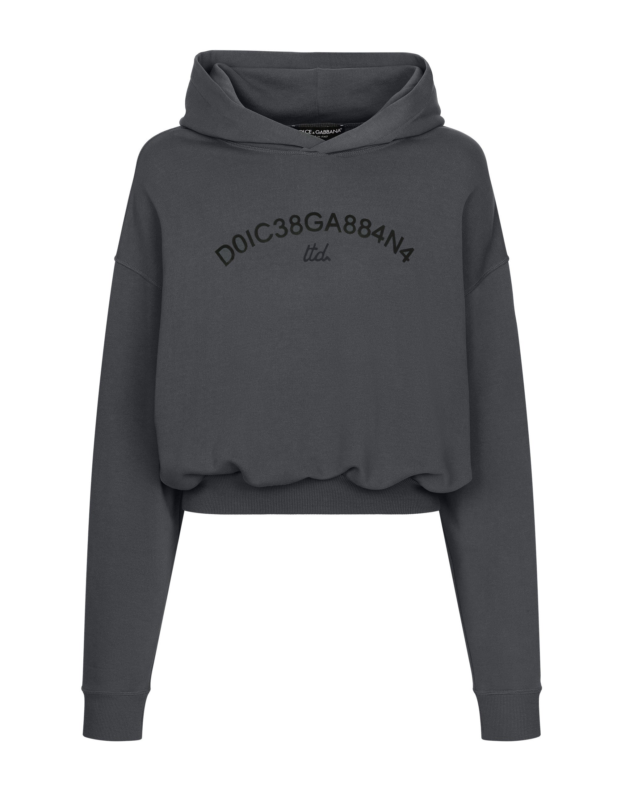 The SS24 “Stile” Collection recounts and clearly presents a strong concept: the unique and unmistakable style of Dolce&Gabbana. A word that is more than a statement. It is a concept! The designers work with surfaces, textures, layers and color nuances, as well as the sheen and fineness of the materials themselves, creating a “Stylish” collection. We’re going back to our roots with the desire to reaffirm the “Stile” - style -, flair and iconic DNA of the brand. Cropped cotton jersey hoodie with Dolce&Gabbana logo print: • Gray • Oversize fit • Side pockets • Stretch knit hem and cuffs • The piece measures 63 cm from the rear collar seam on a size L • Made in Italy