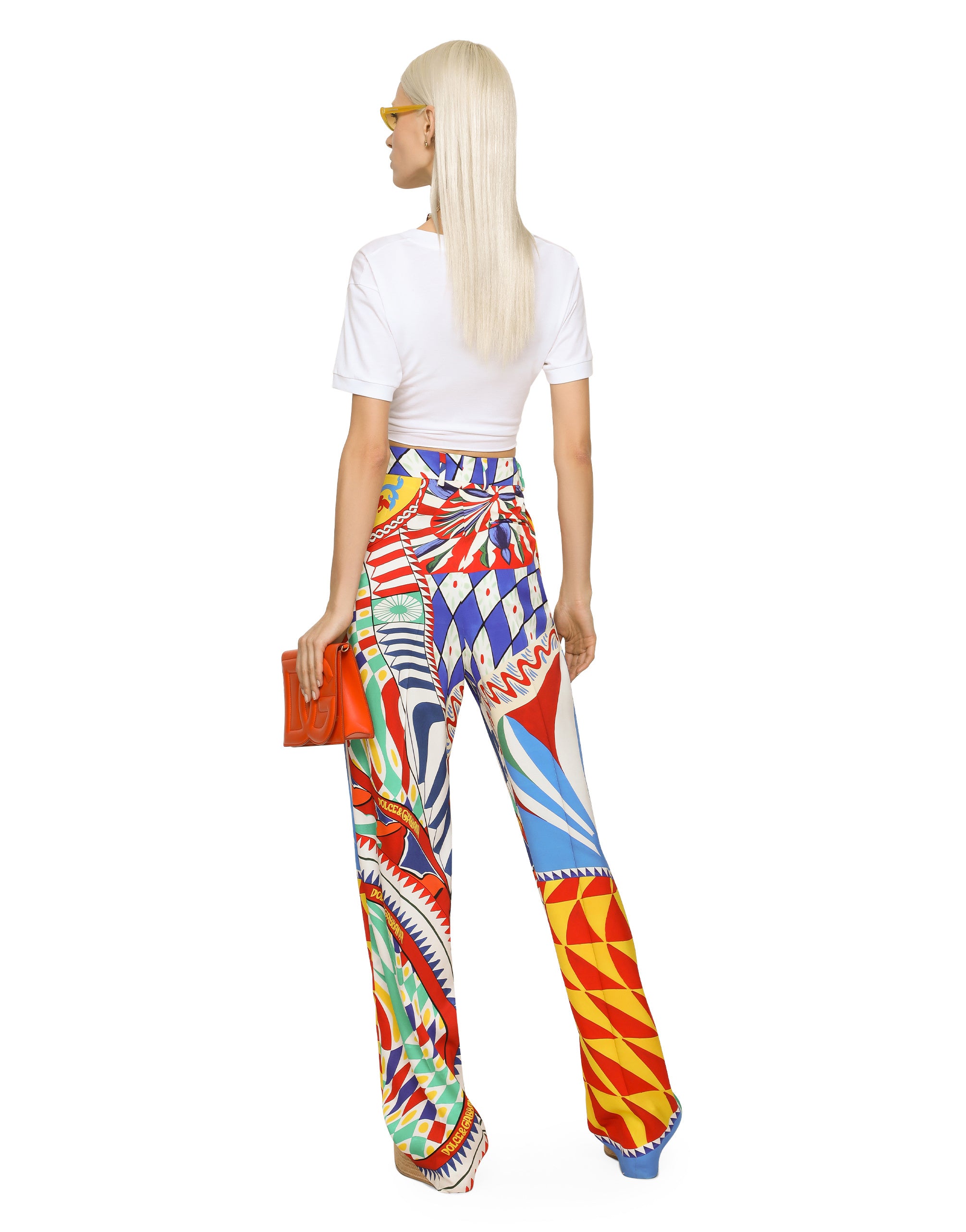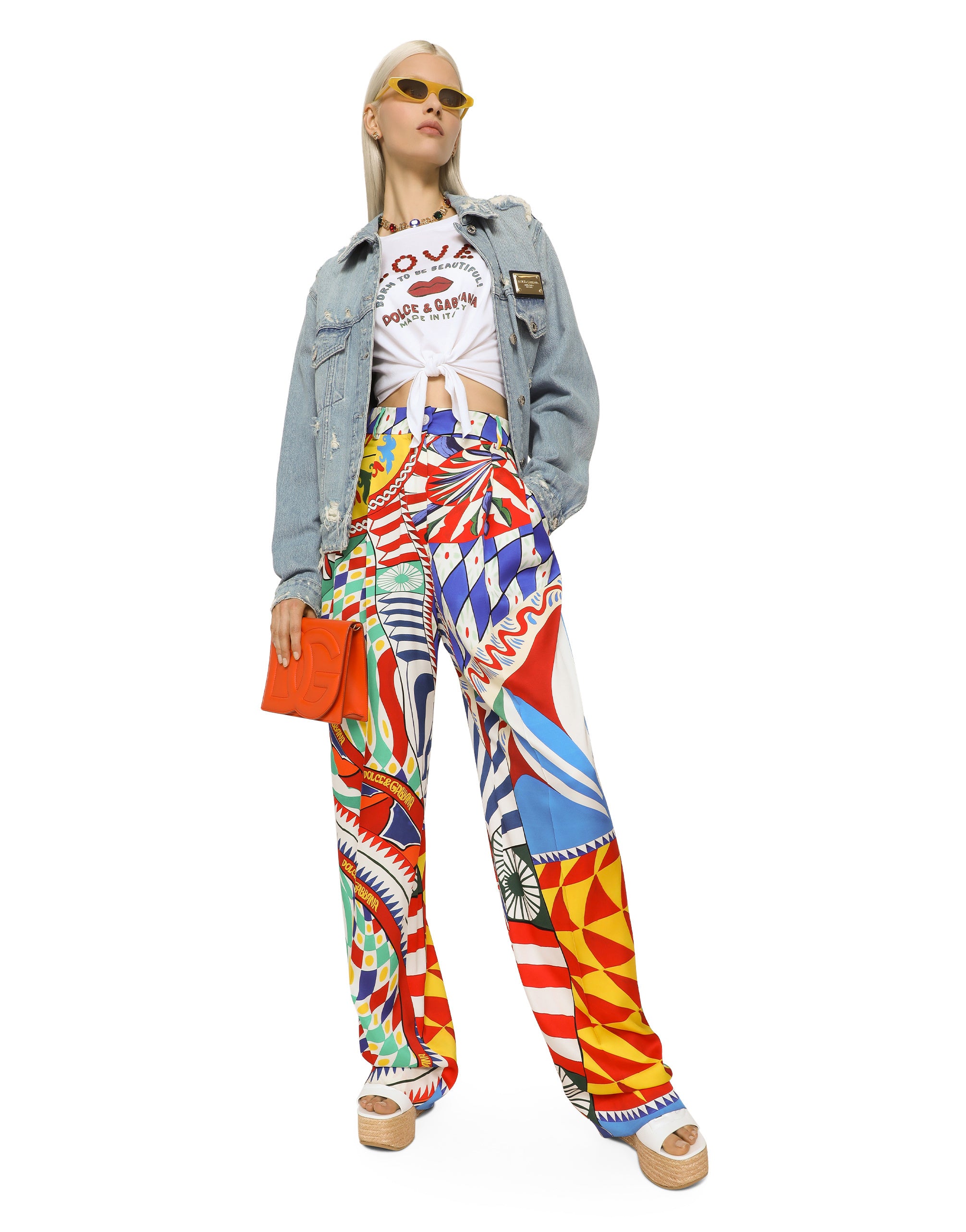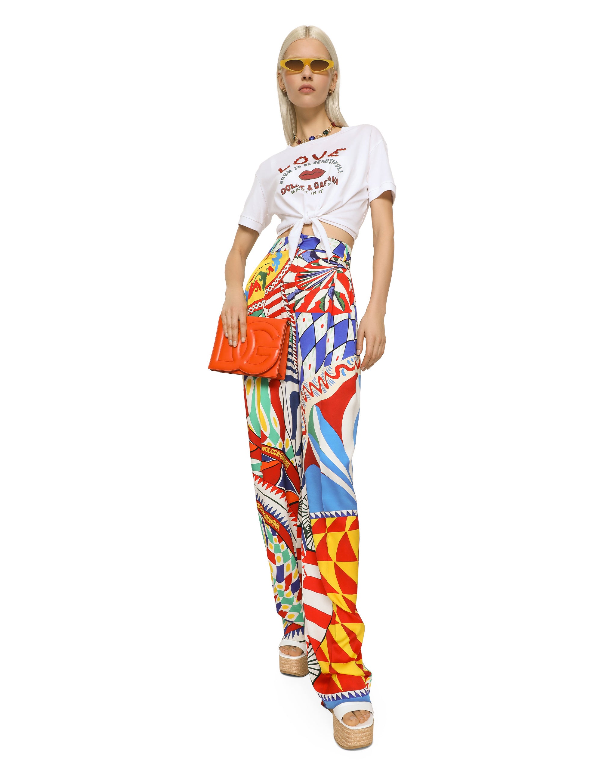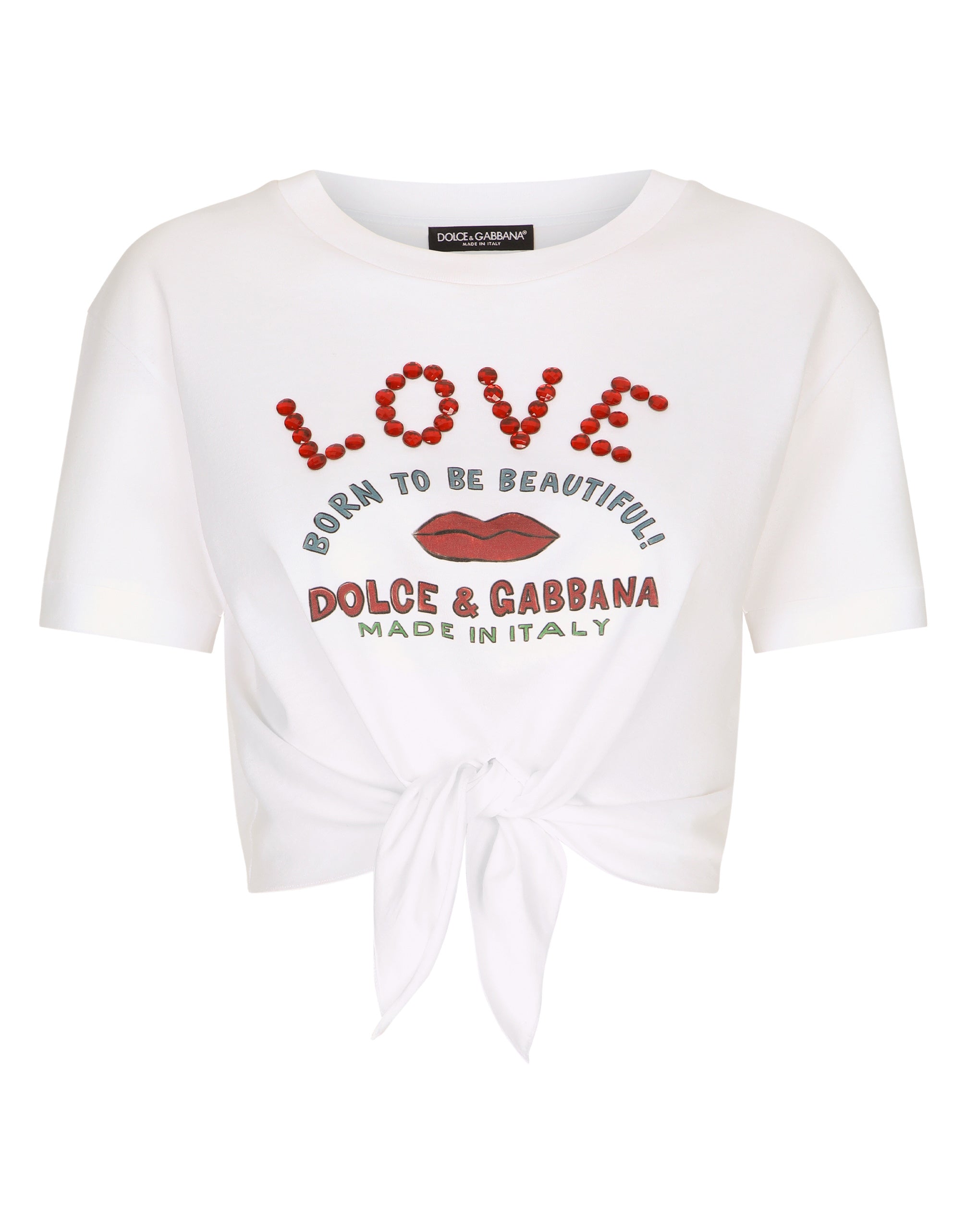 Since the very beginning, the style of the Sicilian Carretto carts has been an indelible part of Dolce&Gabbana. The amazement that these marvelous, beautiful works of art inspire when you first see them led our designers to put a fresh spin on the vision behind them. The colors are reworked through the eyes of the provocative and experimental artwork of the ‘60s, resulting in a psychedelic take on the classic Carretto style. Youthful and sophisticated, the resulting mix is breathtaking in its colors. Cotton jersey T-shirt with knot detail at the front and lettering: • White • Round neck • Short sleeves • Cropped fit • The piece measures 41 cm from the back of the neck on a size IT 40 • The model is 175 cm tall and wears a size IT 40 • Made in Italy The difference in the print placement that you may find on this product is a feature of Dolce&Gabbana’s “Handmade” pieces. A detail that makes every garment or accessory unique and exclusive.