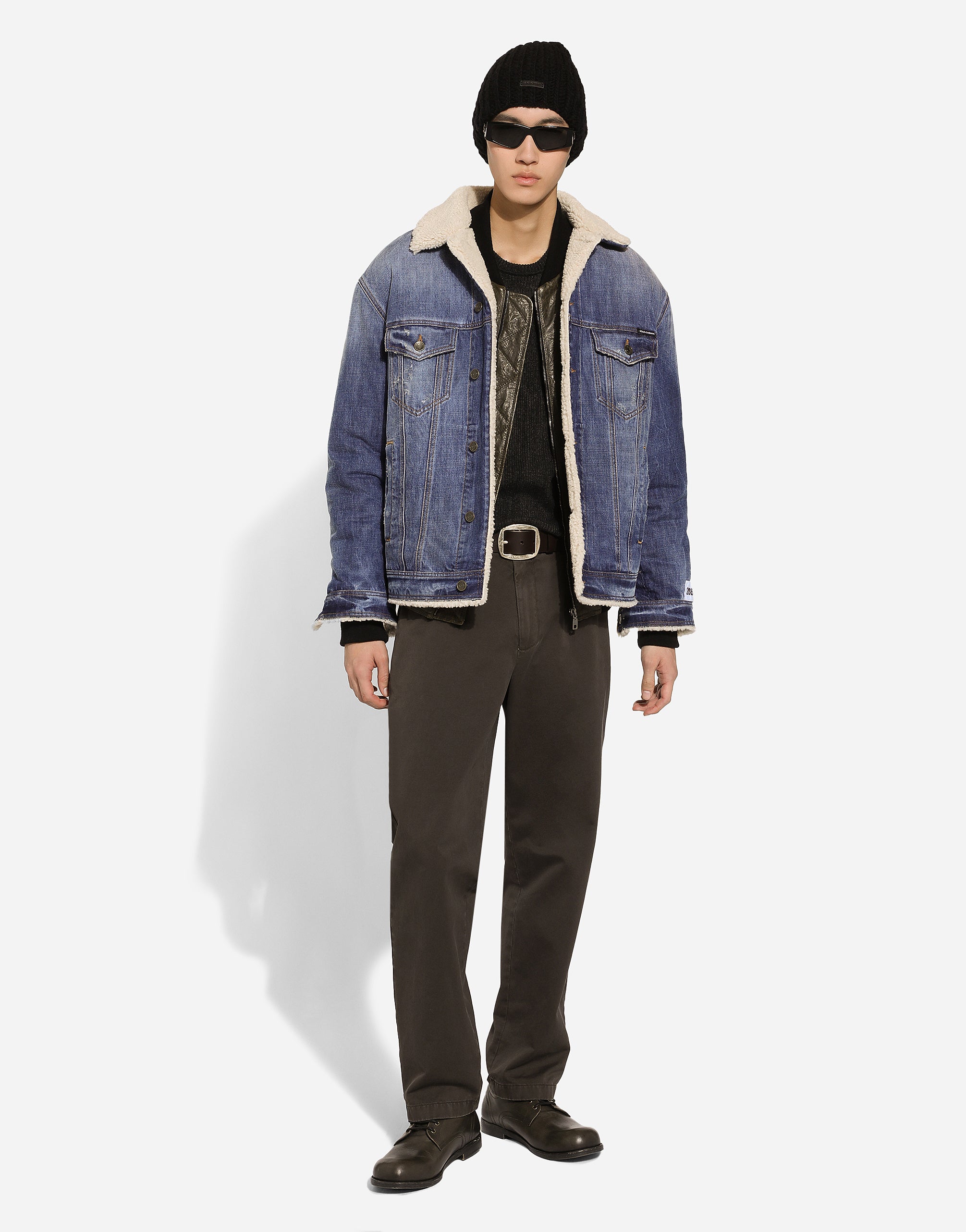 The men's FW 24-25 Re-Edition collection conveys contemporary style that flaunts all the power of the creative DNA that consolidated the brand's image and elevated it to iconic status in the 2000s. Raw-cut details and skilled finishes distinguish pieces with streetwear character: military-inspired jackets and maxi-coats, multi-pocket cargo pants and picot pieces alternate with denim boasting many washes and dyes, thereby redefining an iconic style that is always evolving. Denim and shearling jacket: • Blue • Regular fit • Branded metal buttons on the front • Pockets with buttons • Sheepskin lining • Quilted lining on sleeves • Metal logo tag on center back • The piece measures 69 cm from the rear collar seam on a size IT 48 • Made in Italy