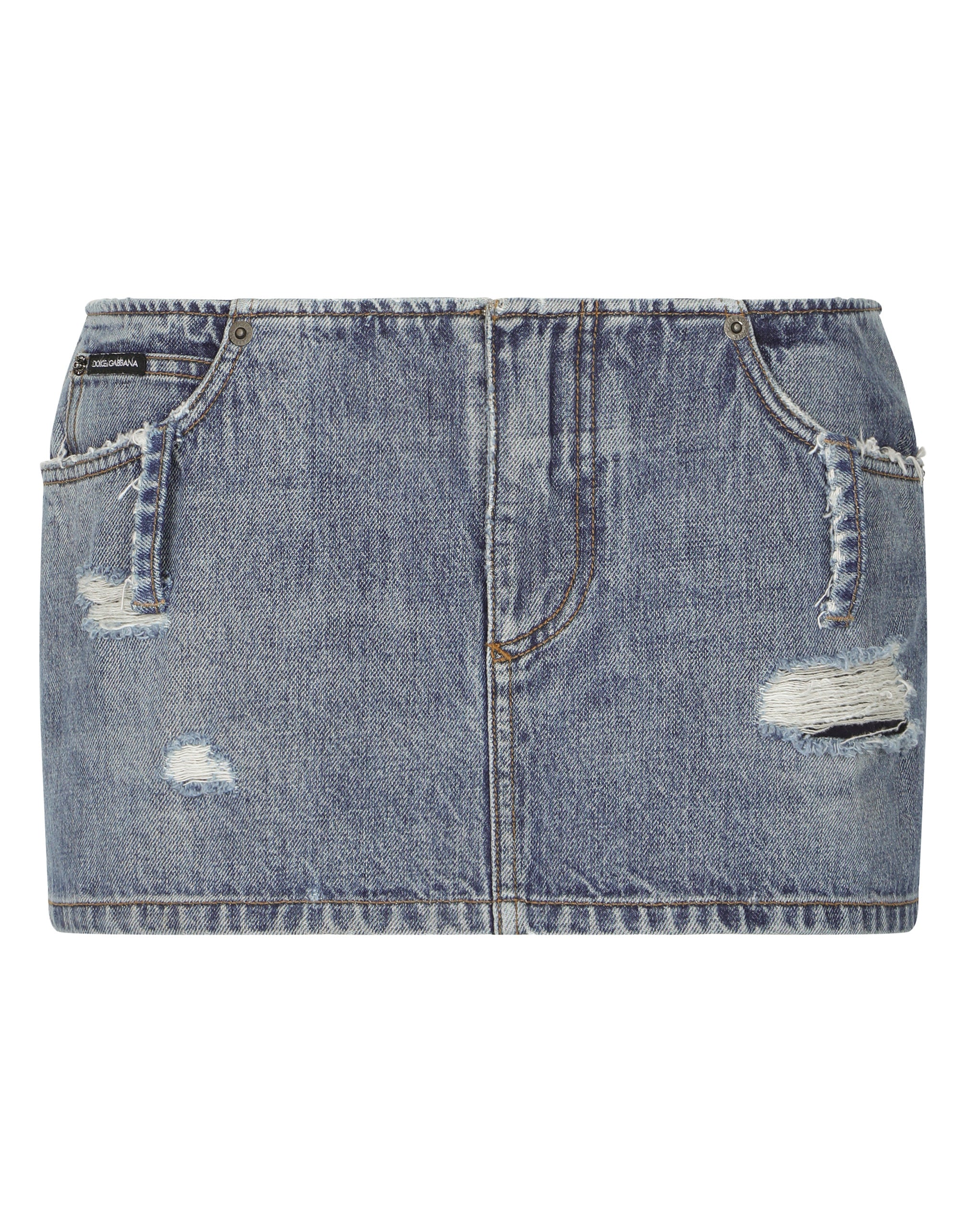 Dolce&Gabbana is conveying a new way of interpreting denim and does so by drawing inspiration from key words such as glamor and signature aesthetic, creating a collection that is perfect for every style and personality, merging femininity, modernity and originality. Denim mini skirt with rips: • Denim • Low rise • 5 pockets • Branded label on the coin pocket • The piece measures 45 cm from the waist down on a size IT 40 • Metal button with logo and zipper • The model is 175 cm tall and wears a size IT 40 • Made in Italy