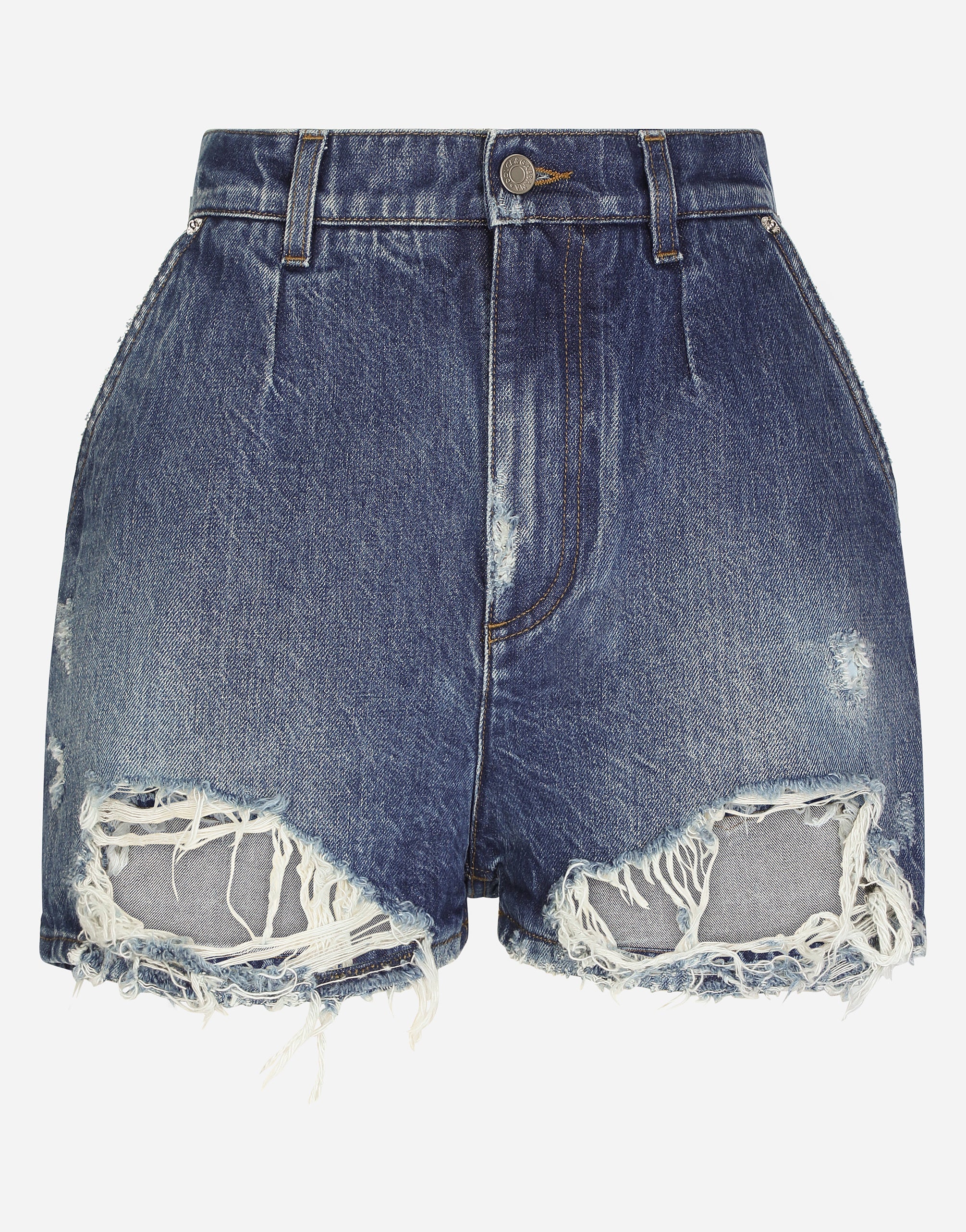 These comfortable, high-waisted shorts come in deep blue denim and represent a contemporary take on a great summer classic. The fringing and maxi-rips will add boldness to your looks. • High-waisted • Slant front pockets • Back patch pockets • Branded metal and leather plate • Inner leg. 4 cm • Curved hem. 31.8 cm • Zipper and branded metal button fastening • The model is 175 cm tall and wears a size IT 40 • Made in Italy