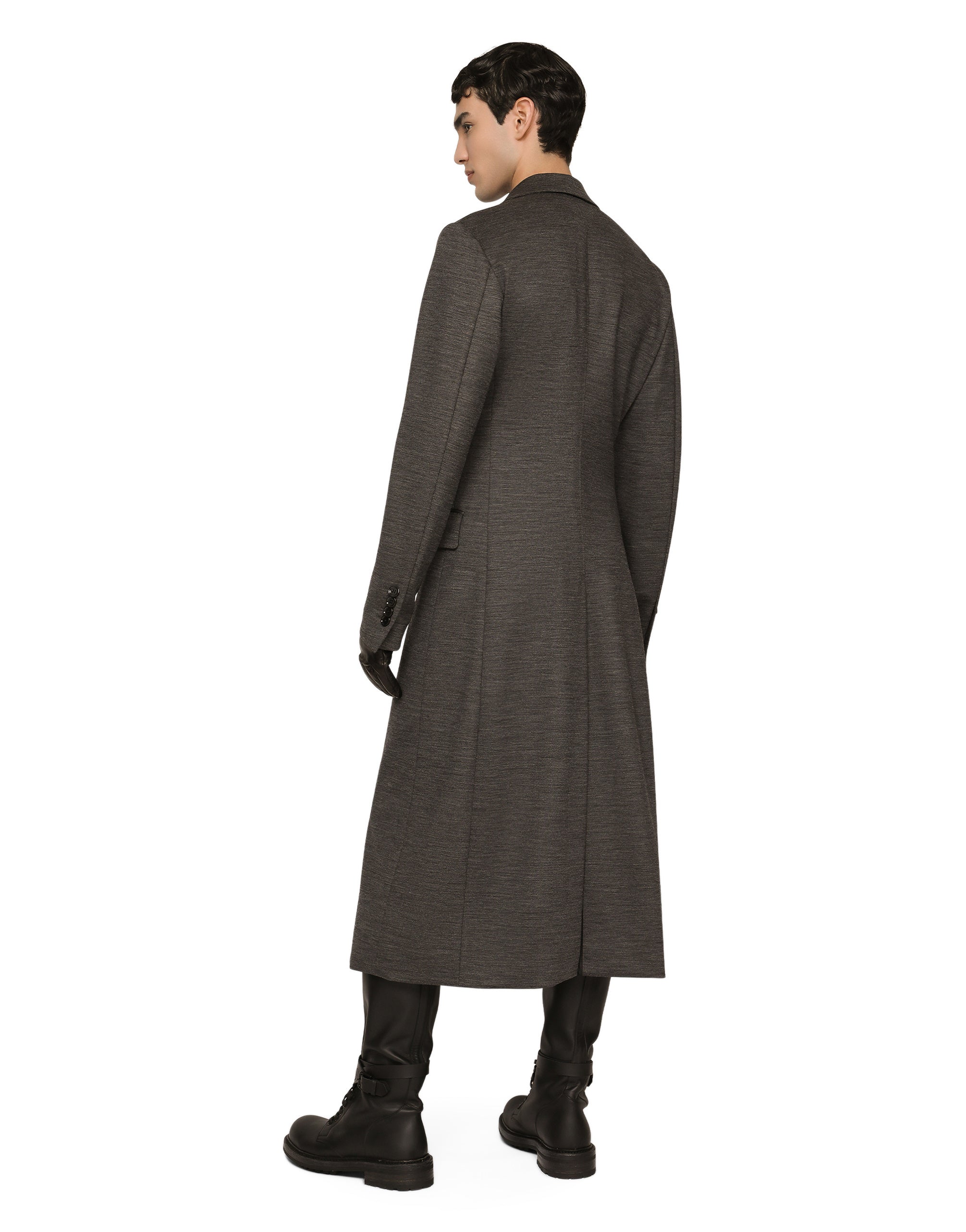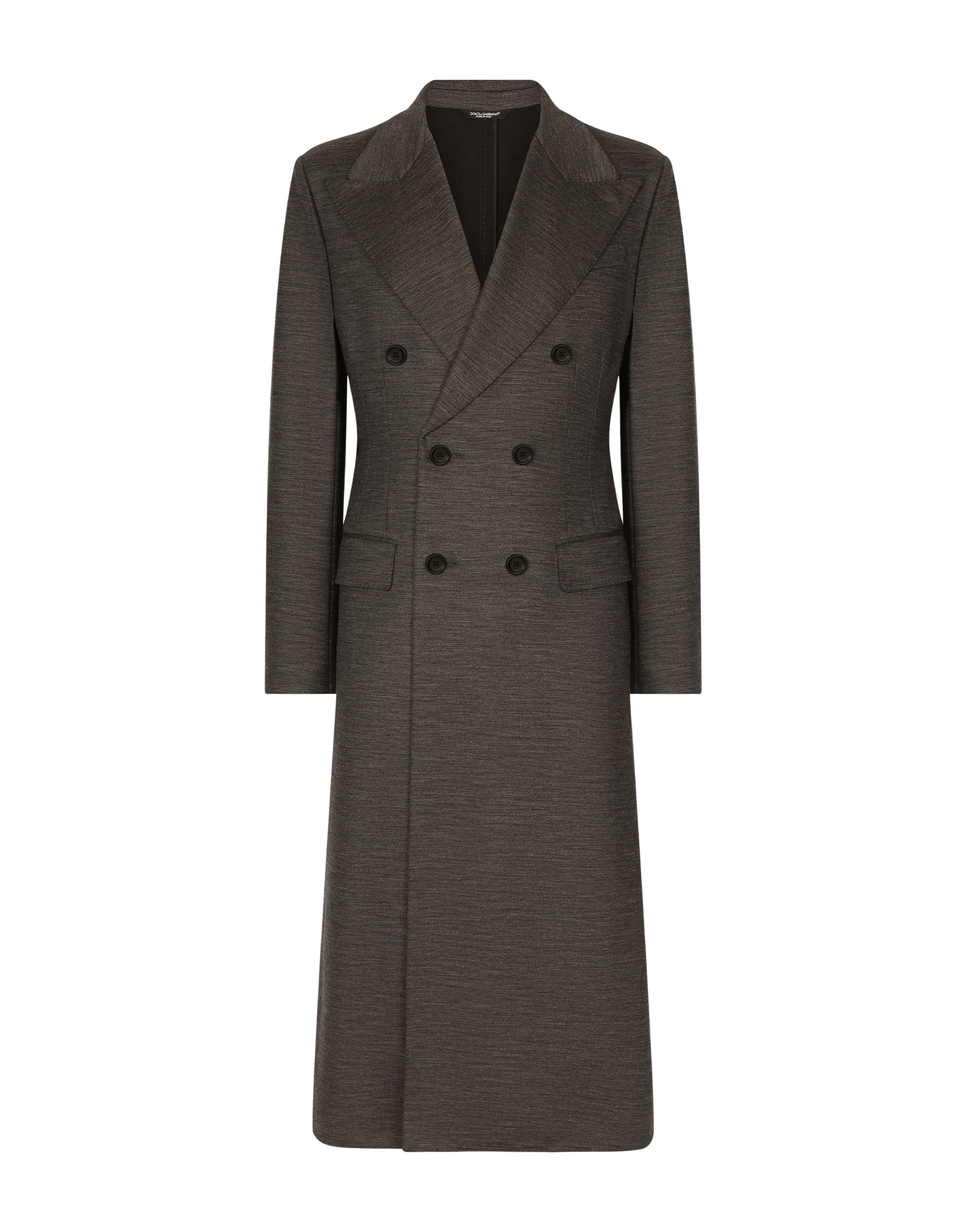 The pieces designed for FW23-24 represent the true essence of Dolce&Gabbana. They dominate with their pure volumes, tailored cut and new proportions. Coats, tops, white shirts, oversize pants, corset girdles and sash-bands that cinch the waist are reissues of the F/W 99-00 collection. Black, the absolute protagonist, which represents elegance, formality and seduction, has been translated into crystal embellishment that brings the wet volcanic stone of Etna and Stromboli to mind. Deconstructed double-breasted coat in stretch technical wool jersey: • Slim fit • Peak lapels • Button fastenings • Flap pockets, a welt breast pocket and inner welt pockets with button • Buttoned cuffs • Central vent • Unlined • Gray • The piece measures 130 cm from the rear collar seam on a size IT 48 • The model is 185 cm tall and wears a size IT 48 • Made in Italy