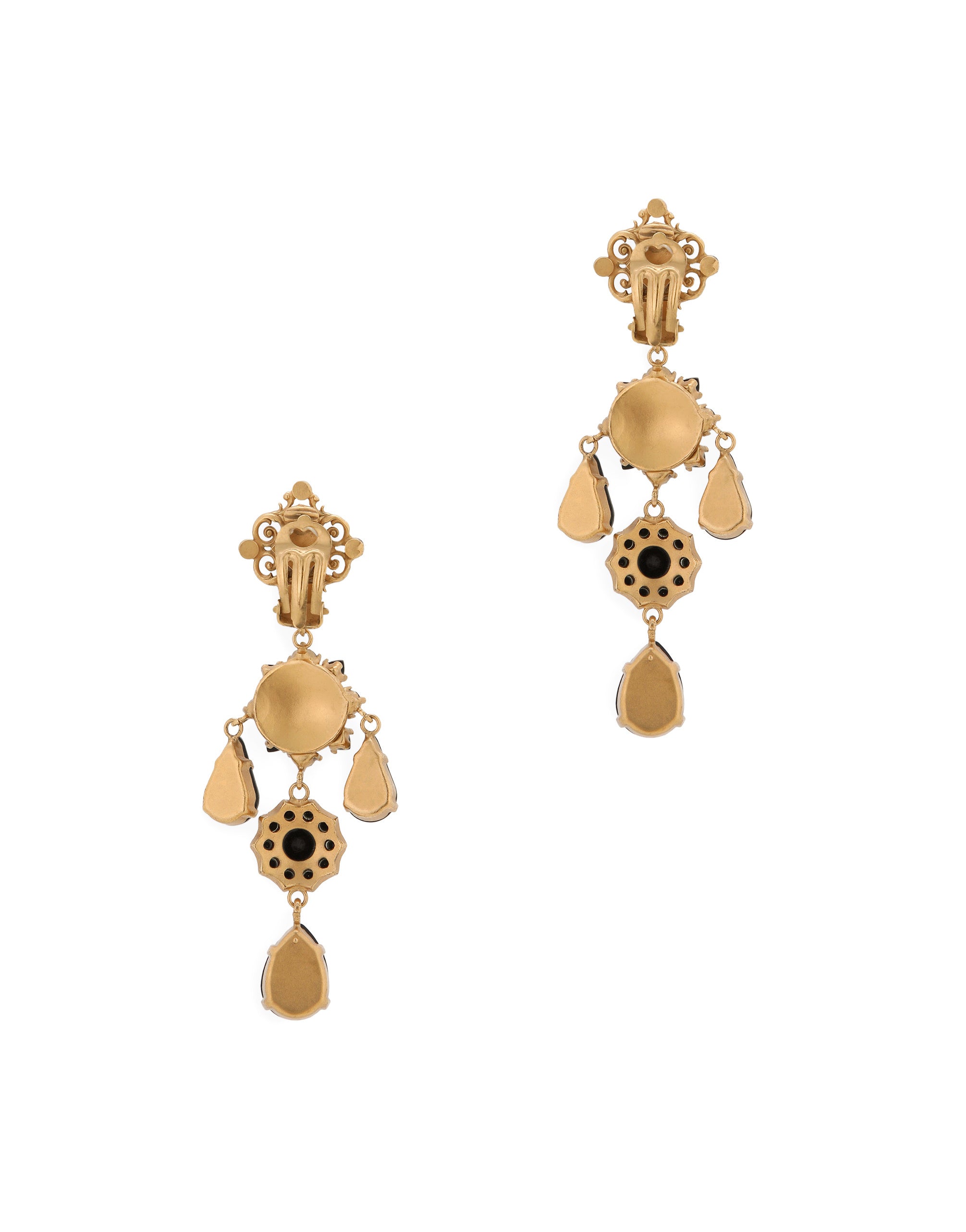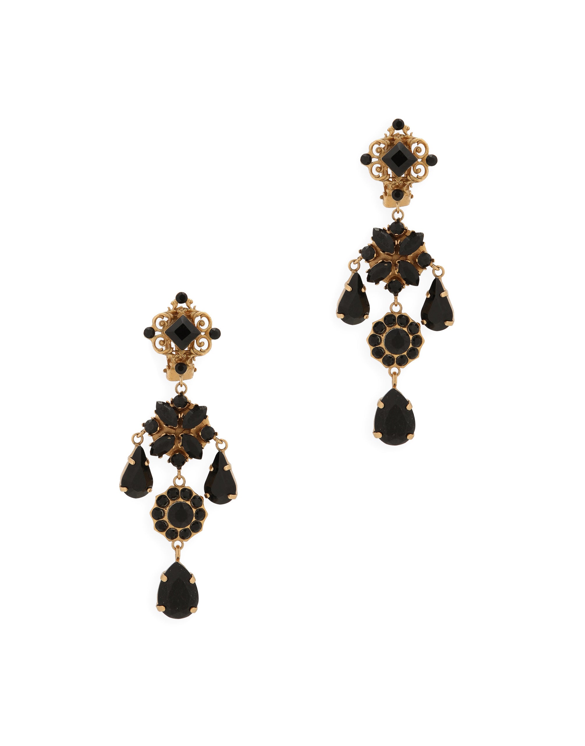 These gold-plated brass earrings will add an elegant touch to your looks. • Clip fastening • Floral metal accents with “Filigree” style detailing. • Black diamond , round, marquis and teardrop crystal rhinestones. • Nickel-free and hypoallergenic materials. • Engraved logo • Made in Italy