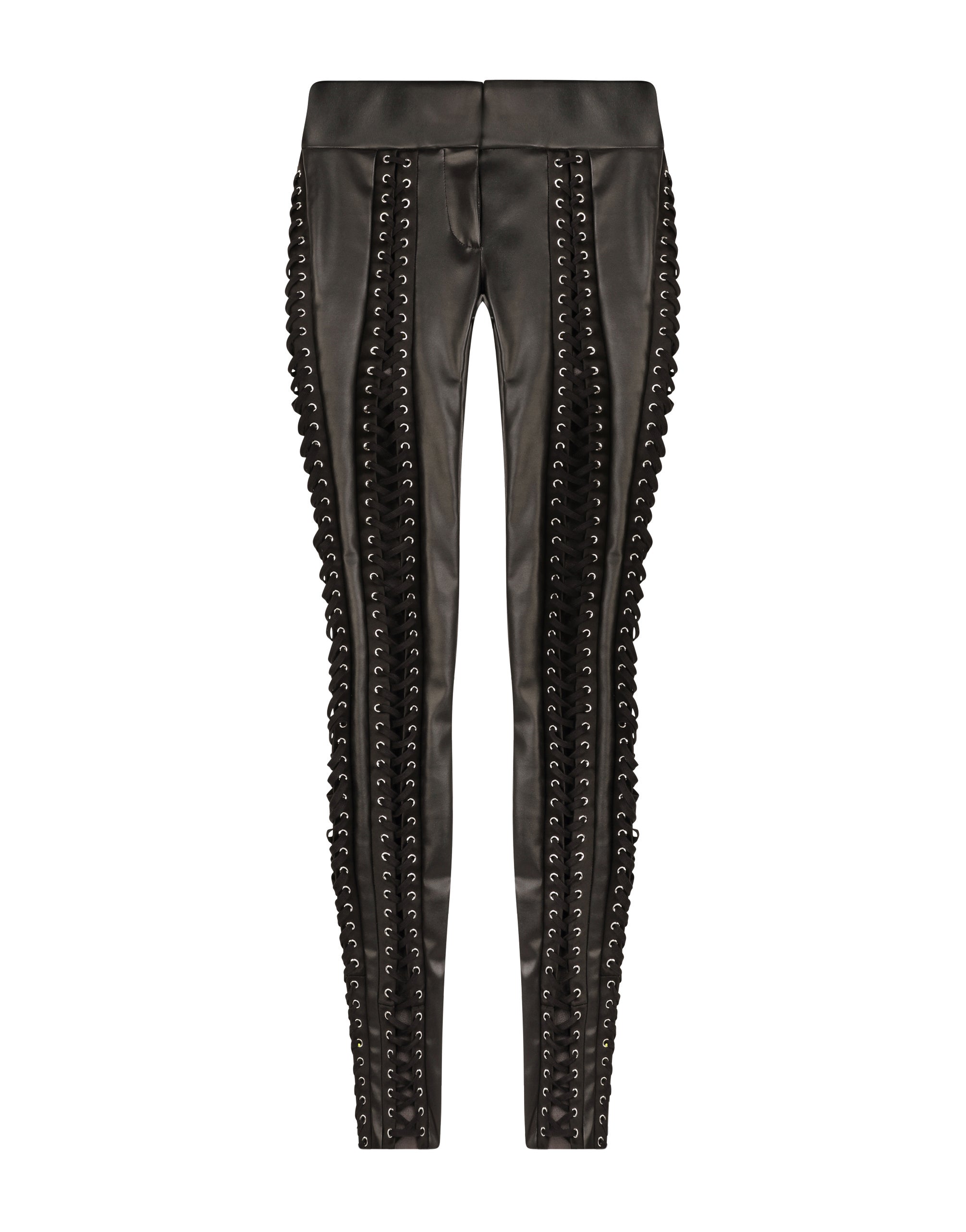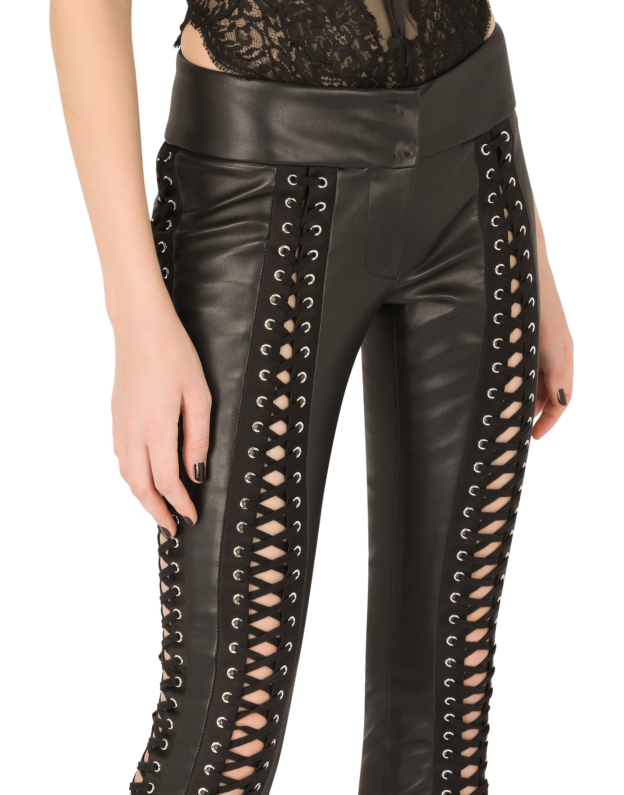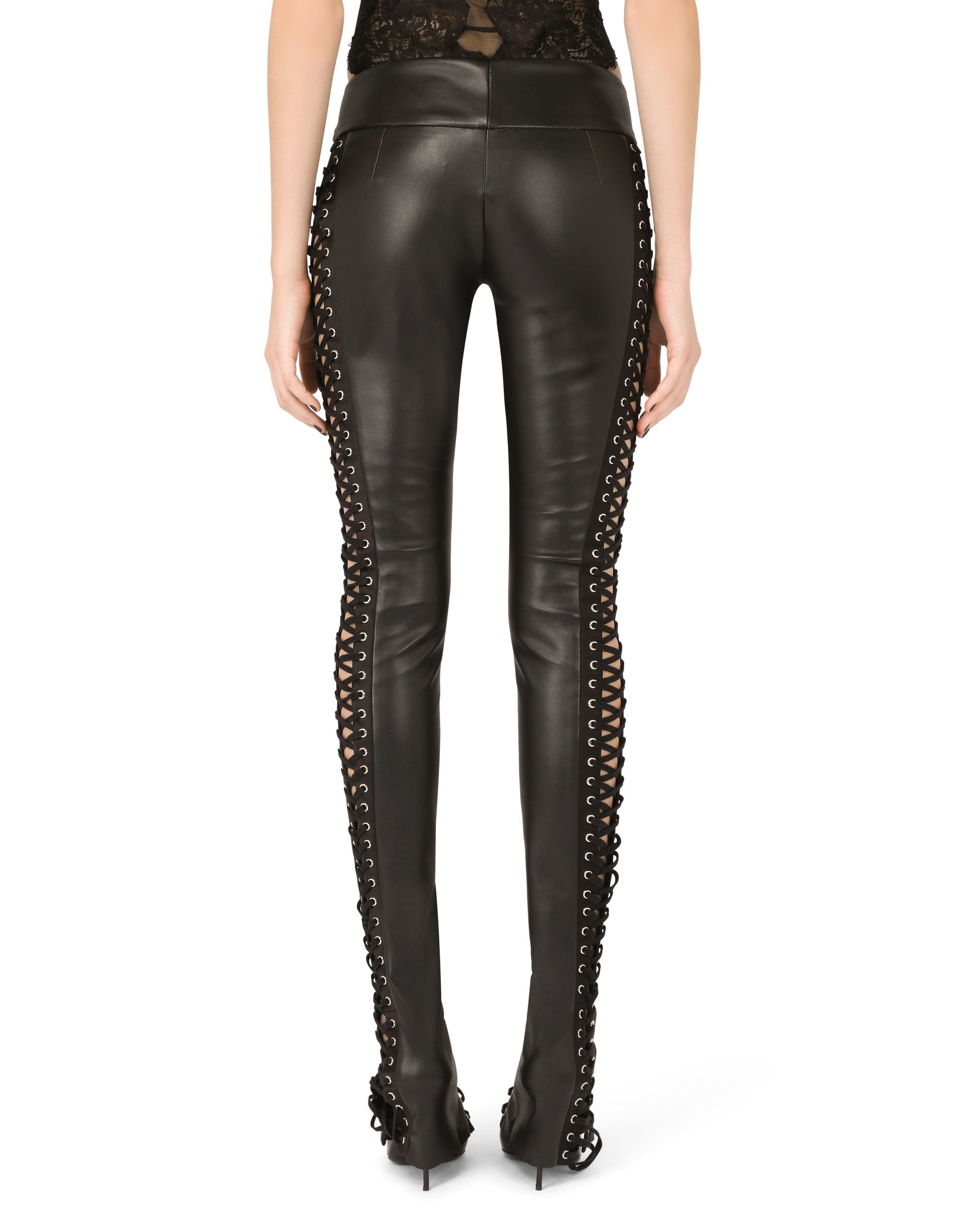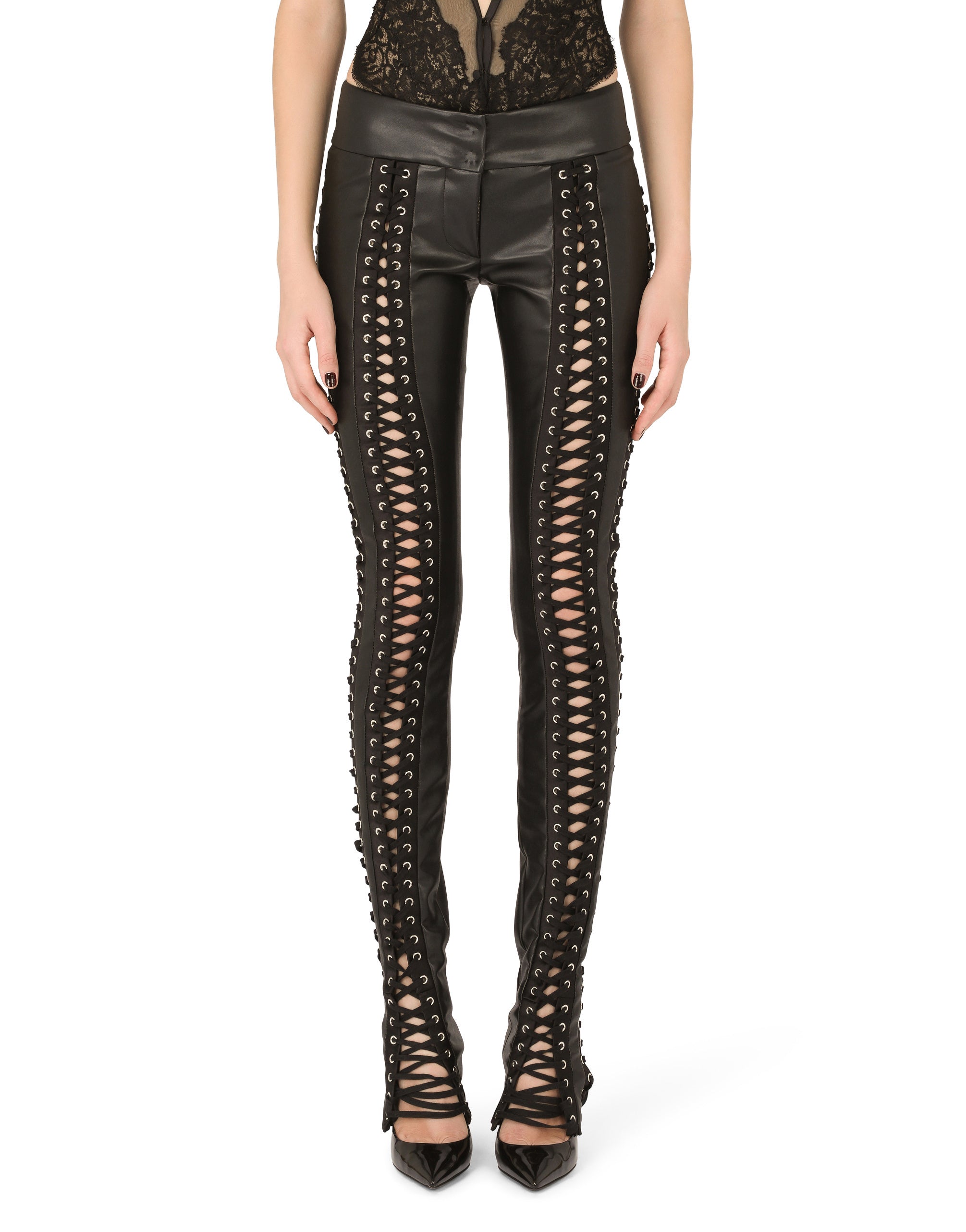 Dolce&Gabbana always conveys a sensual and glamorous feel in its collections. These skinny corset-inspired pants come in faux leather with laces and eyelets and are sure to put your personality on display and give you contemporary looks: • Low rise • Pockets • Welt back pockets • Inner leg: 94 cm • Zipper and press-stud button fastenings • The model is 175 cm tall and wears a size IT 40 • Made in Italy