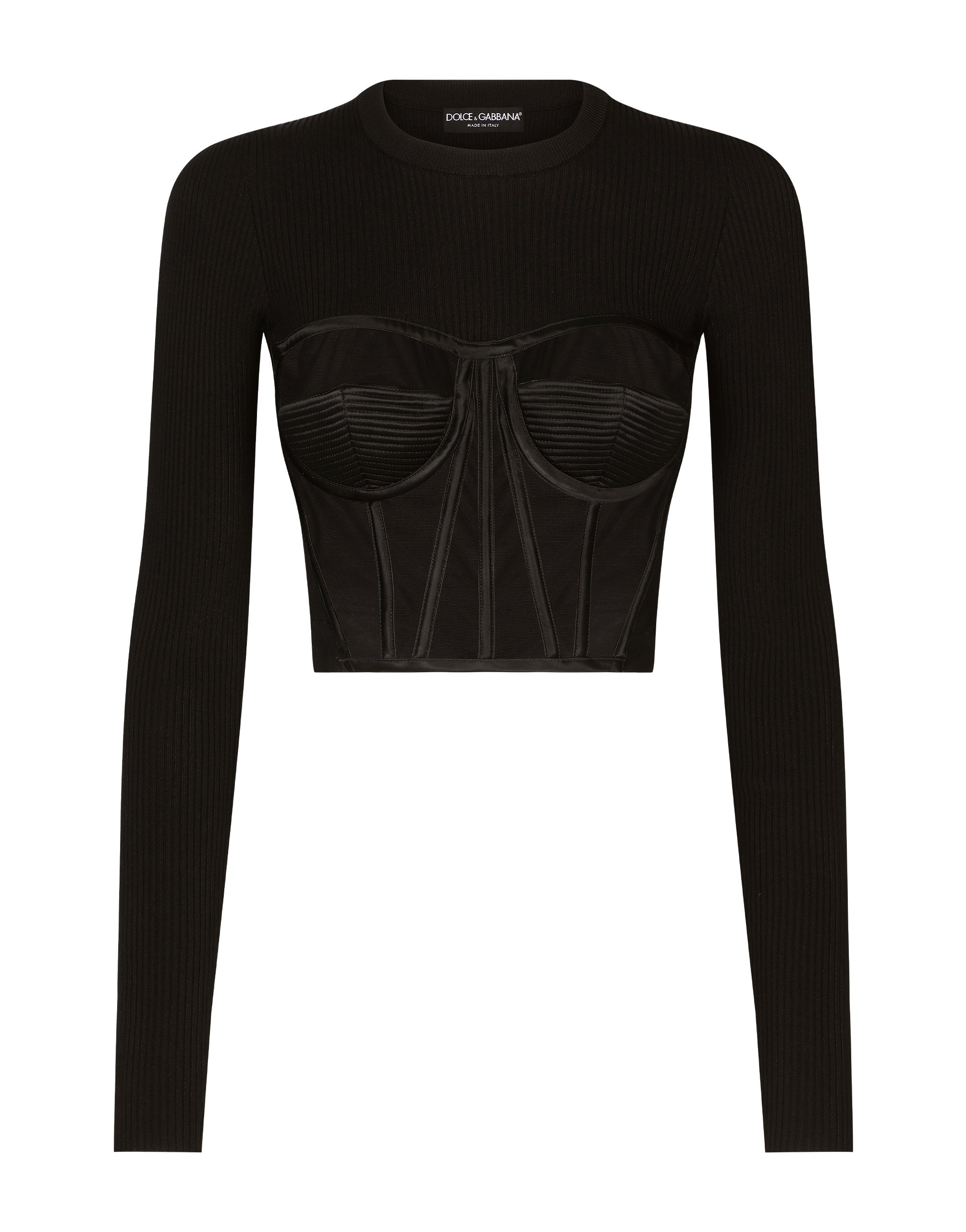 Dolce&Gabbana’s signature aesthetic is permeated by concepts linked to the magnetic allure of sensuality. This sweater will win you over with its boudoir silhouette featuring a tulle corset and half-covered satin cups complemented by long fine-rib viscose sleeves. It is sure to be the perfect piece that will give you femme fatale outfits. • 18-gauge knit • Round neck • Long sleeves • Slim fit • Fine-rib trims • The piece measures 41 cm from the shoulder seam on a size IT 40 • The model is 175 cm tall and wears a size IT 40 • Made in Italy
