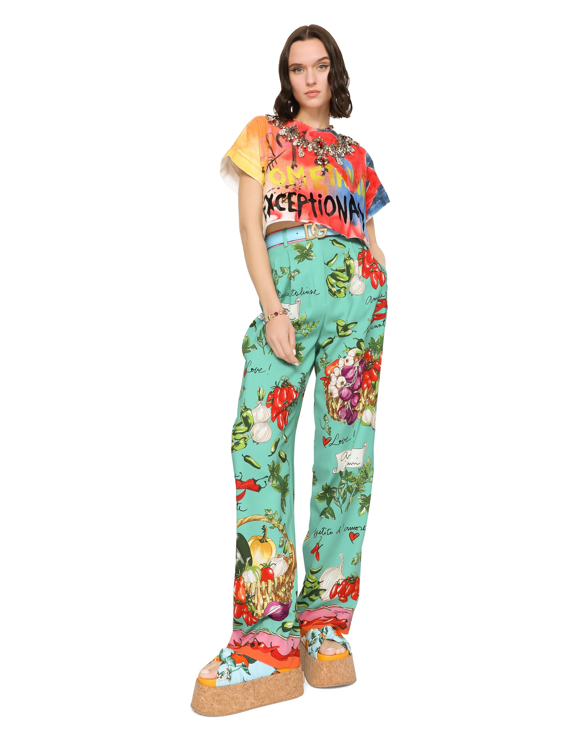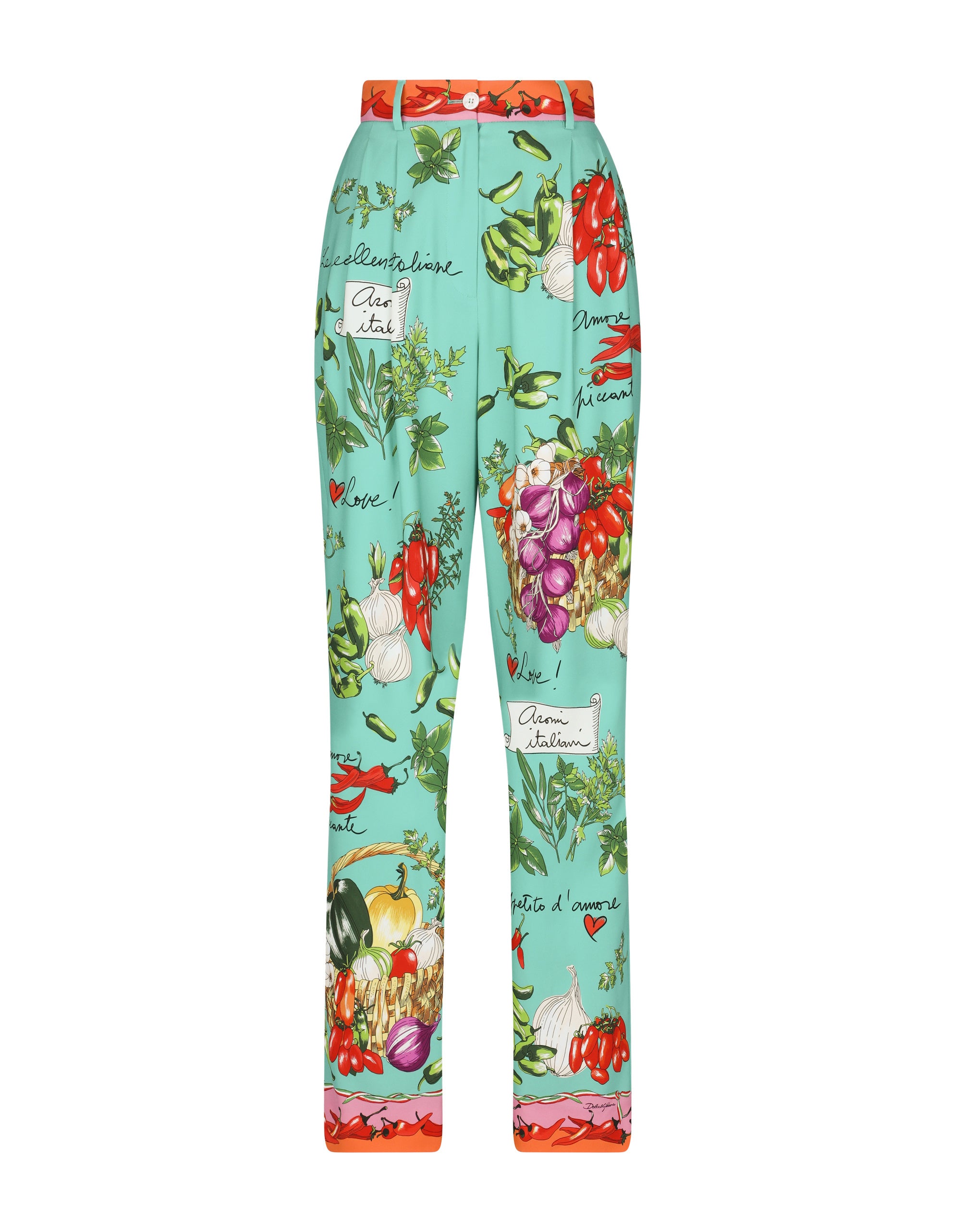 In its Capri line, Dolce&Gabbana is paying tribute to and recounting the charm, wonders and tradition of the Italian peninsula. Prints inspired by the feel of the Mediterranean merge with fine fabrics to create a new contemporary telling, such as with these flared pants with a surprising and ironic feel. • Dolce high waist • Front in-seam pockets • Welt back pocket • Belt loops • Inner leg. 87 cm • Hem. 25 cm • Zipper and button fastening with DG logo • The model is 175 cm tall and wears a size IT 40 • Made in Italy