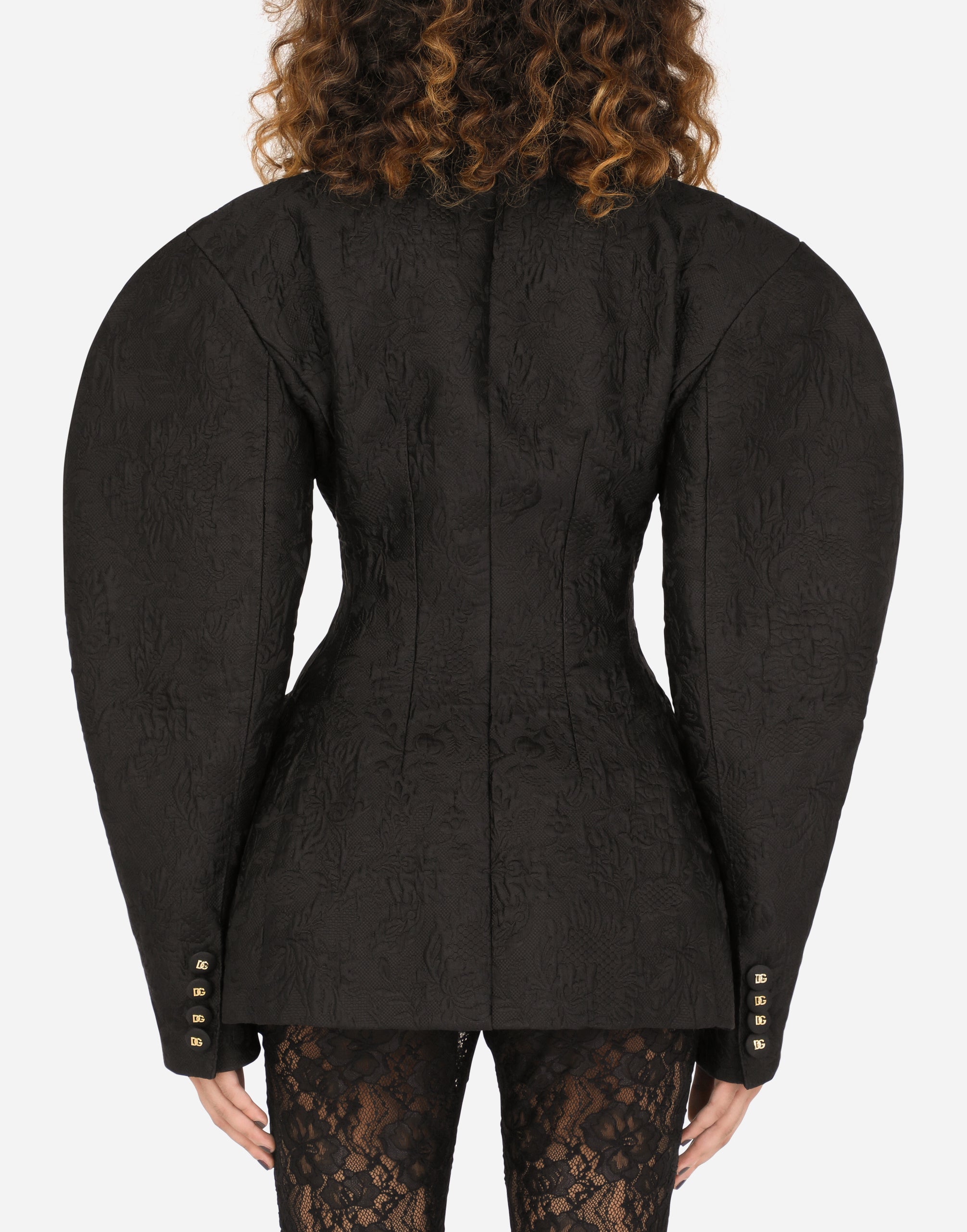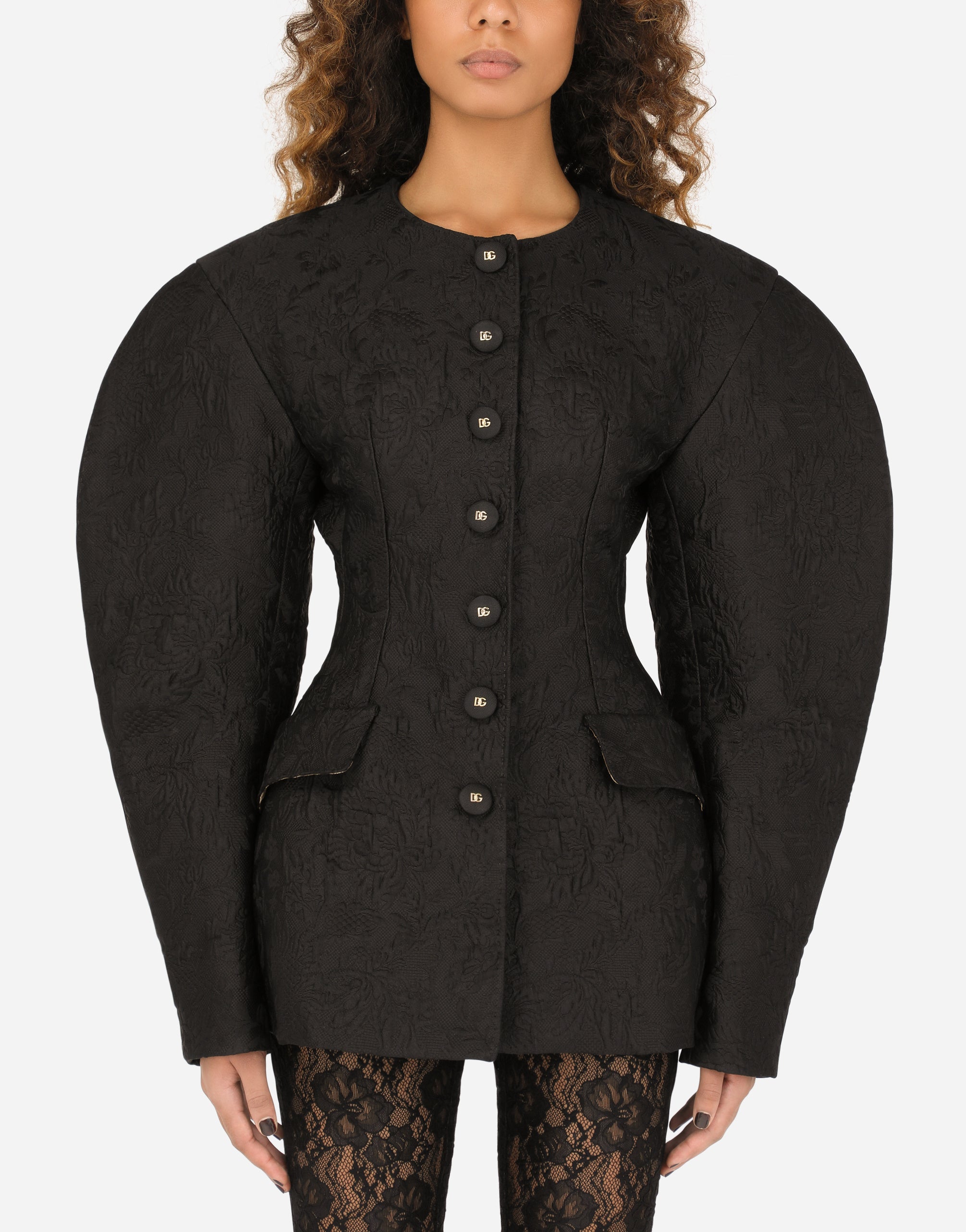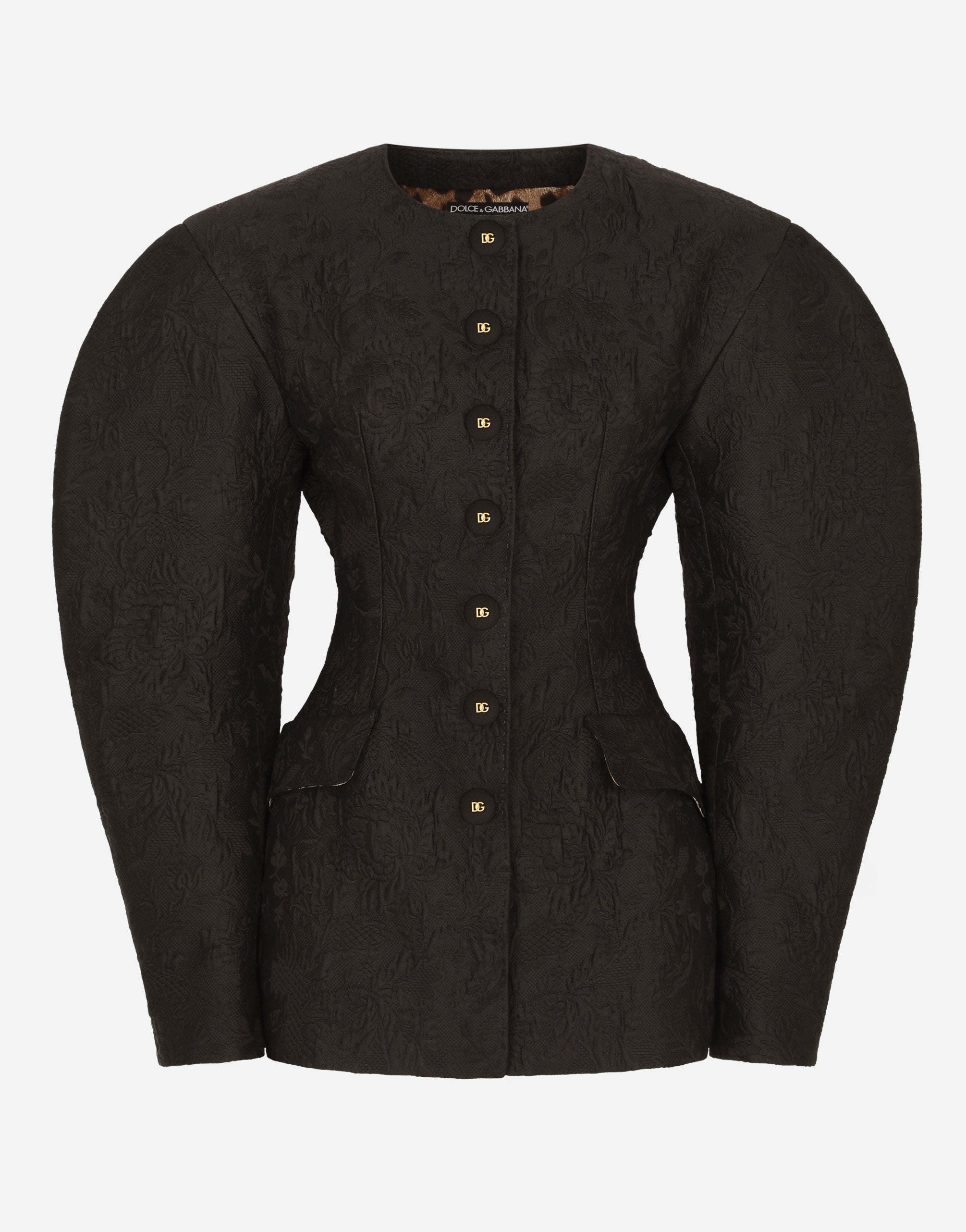 In this collection Dolce&Gabbana is rewriting the rules of fashion, women and modernity and infusing it with joy and optimism, creatively merging textures, colors and styles in a modern way and drawing inspiration from the 2000s. This jacquard jacket sees the sleeves become statement accents. Huge volume and creativity give us unique and original looks where the focus is fully on Italian craftsmanship. • Round neck • Long sleeves • Flap pockets • Leopard-print stretch satin lining • Button fastenings in silk canneté with DG logo • The piece measures 70 cm from the rear collar seam on a size IT 40 • The model is 175 cm tall and wears a size IT 40 • Made in Italy