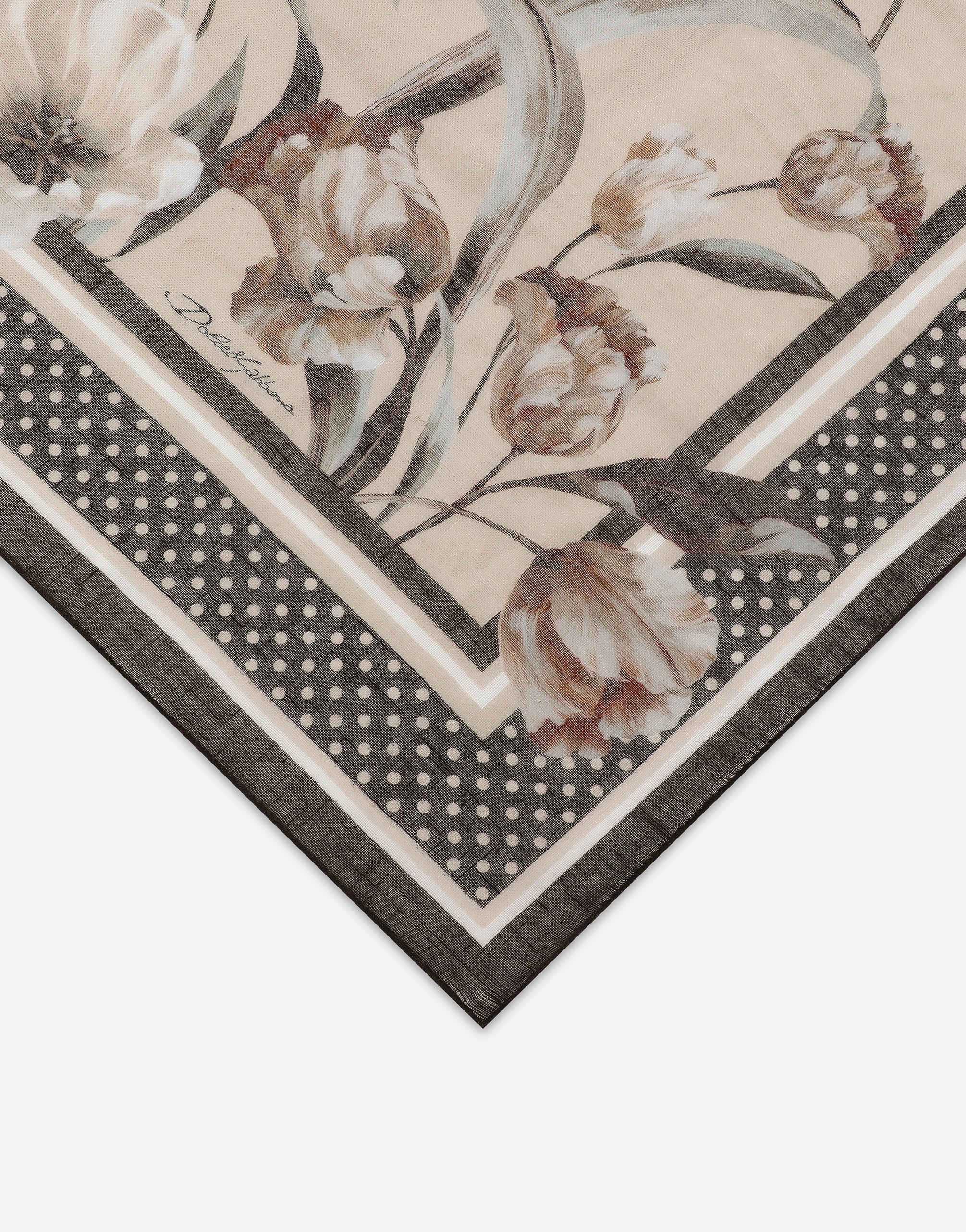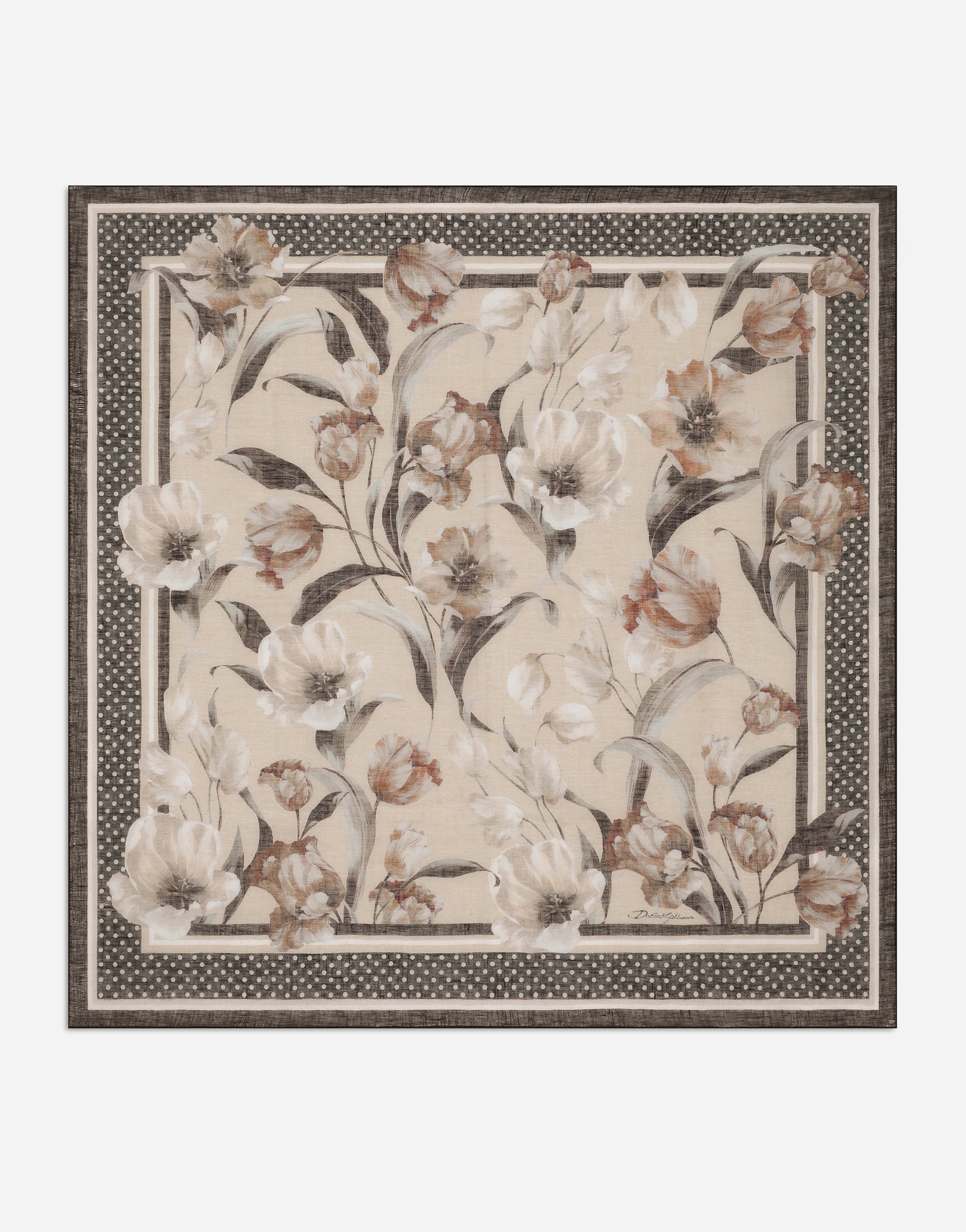 The Palermo collection represents the link between the Sicilian man’s world and the unspoiled nature of the island. A language marked by warm hues – sand, cream, Nero Sicilia black – floral paintings and iconic prints. The Dolce&Gabbana closet must-haves have been reworked in different materials, in pursuit of a new form of harmony. A collection rich in suggestion, such as the stripes inspired by the old mattresses of the 1940s and 1950s, and the timeless aesthetic of the looks. Floral-print gauze bandanna: • Beige • Logo print • Measurements: 90x90 • Made in Italy The difference in the print placement that you may find on this product is a feature of Dolce&Gabbana’s “Handmade” pieces. A detail that makes every garment or accessory unique and exclusive.