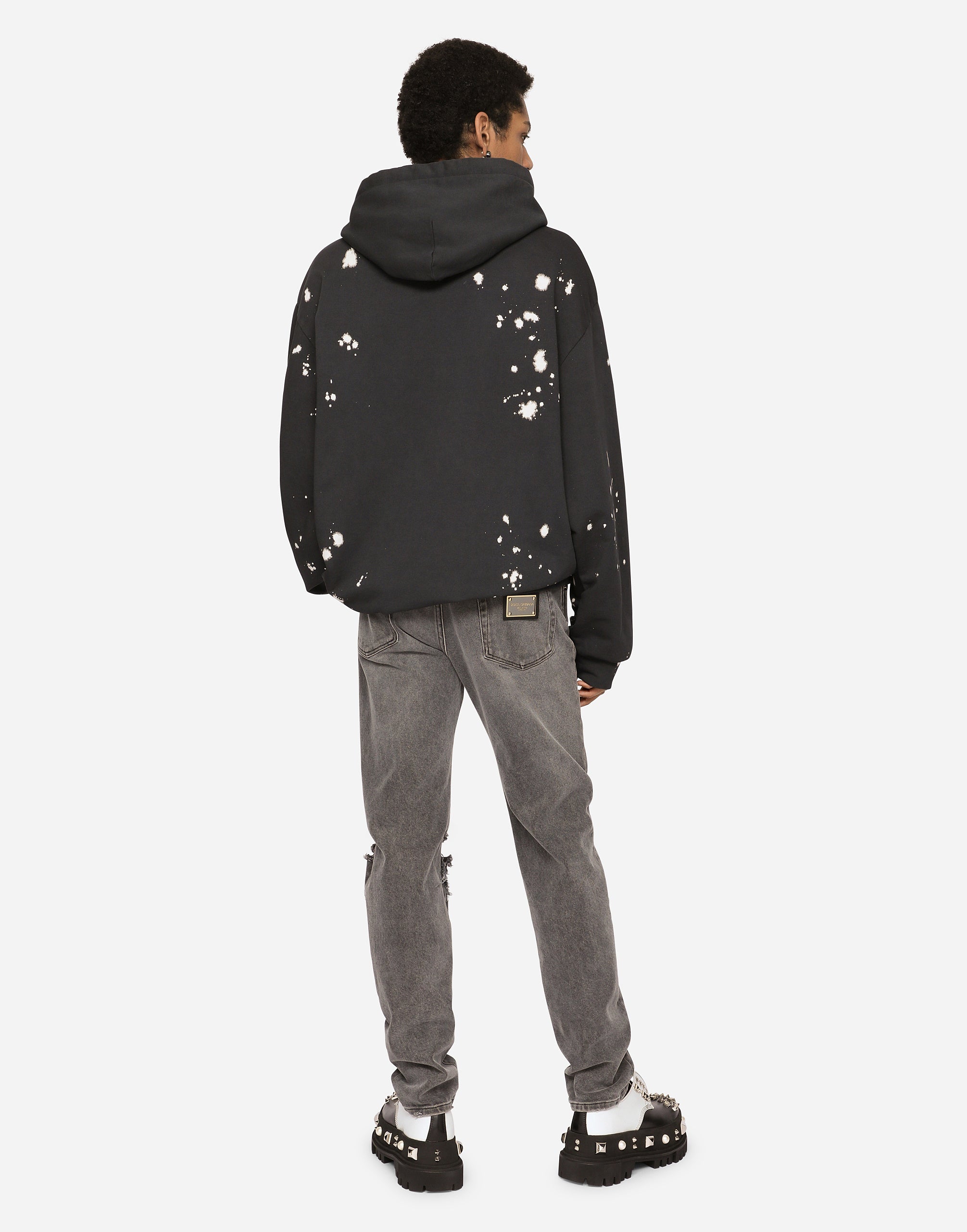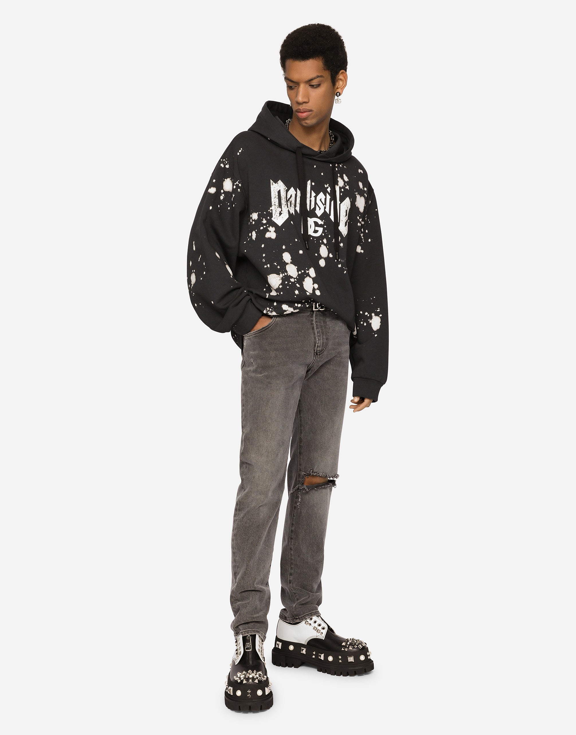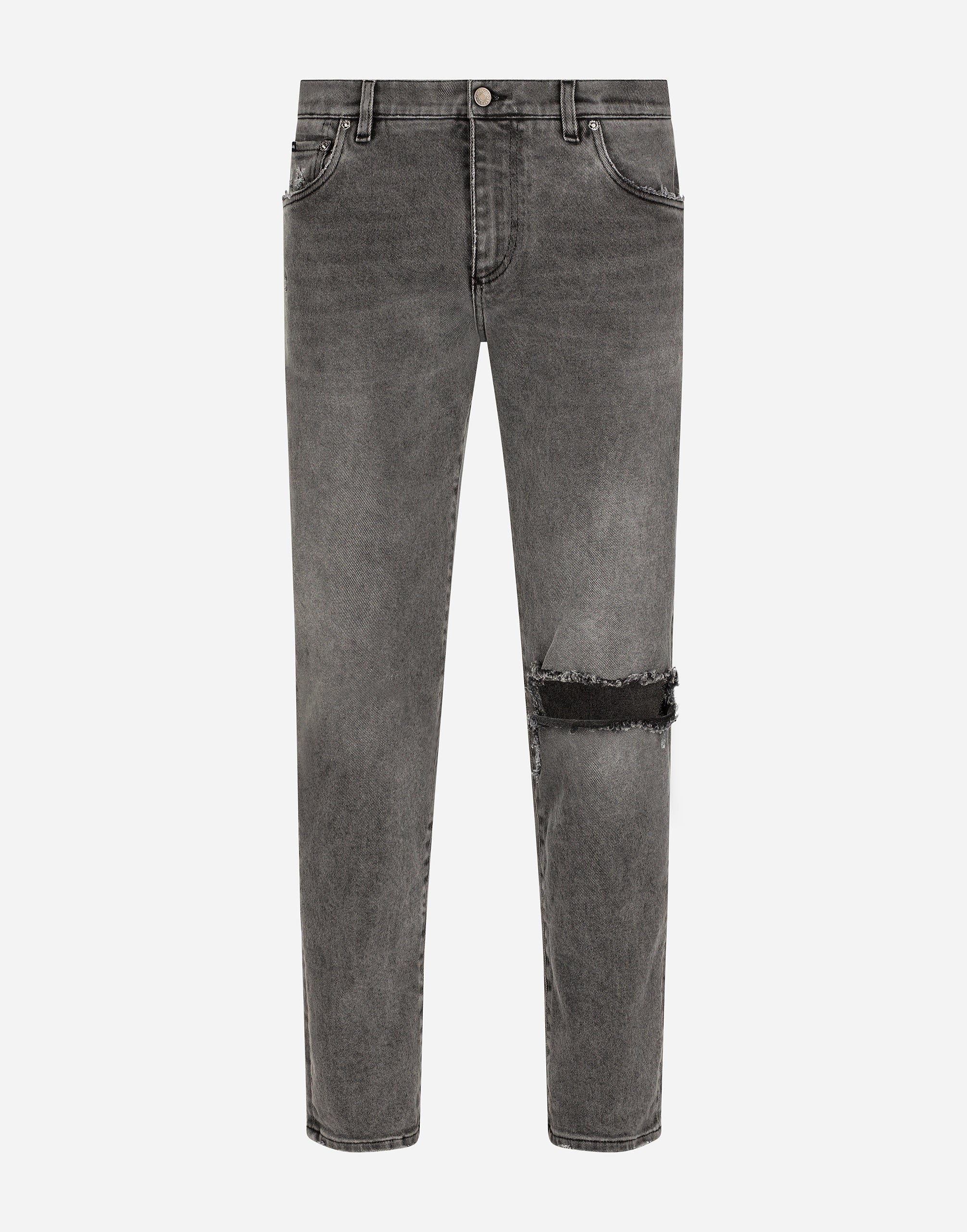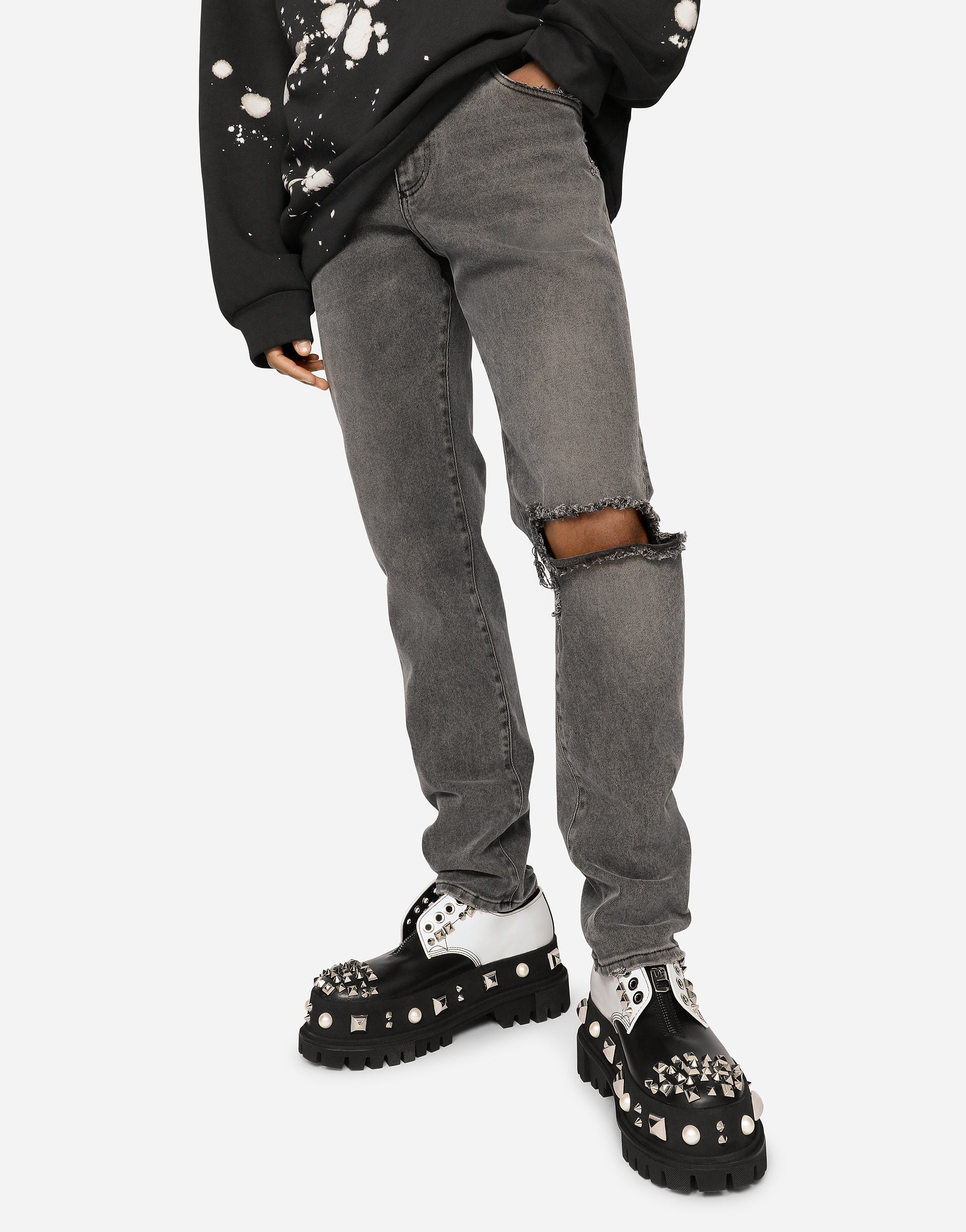 The “Dark Side” Collection is inspired by the Punk Rock movement that was on the rise in England and the United States in the mid-70s. Looking at Punk, Dolce&Gabbana is paying tribute to the legends of entire generations, celebrating uniqueness, individuality and provocation by making men free to express themselves with the language of today. Five-pocket slim-fit jeans in washed gray stretch denim with ripped knees. • Regular fit • Fly-covered zipper and button fastening • Metal Dolce&Gabbana logo tag on the back • The item measures 105 cm on the outer leg and the hem is 17 cm wide on a size IT 48 • The model is 185 cm tall and wears a size IT 48 • Made in Italy