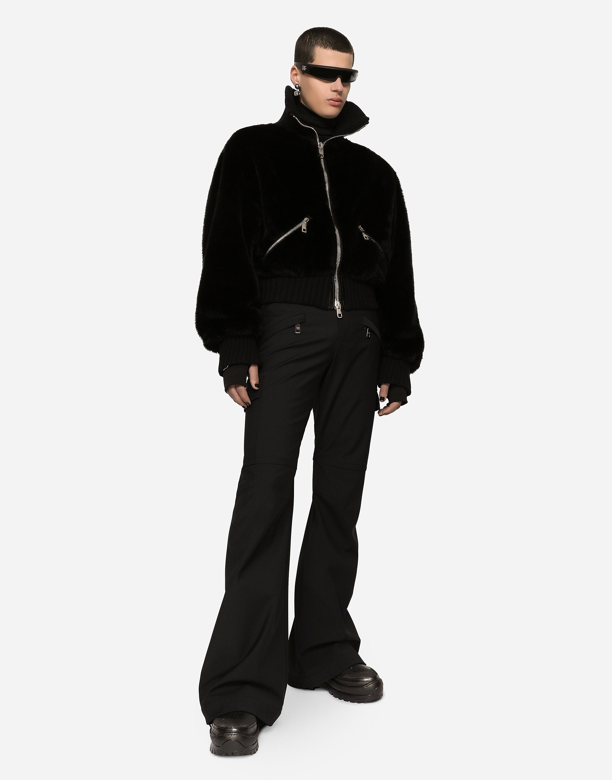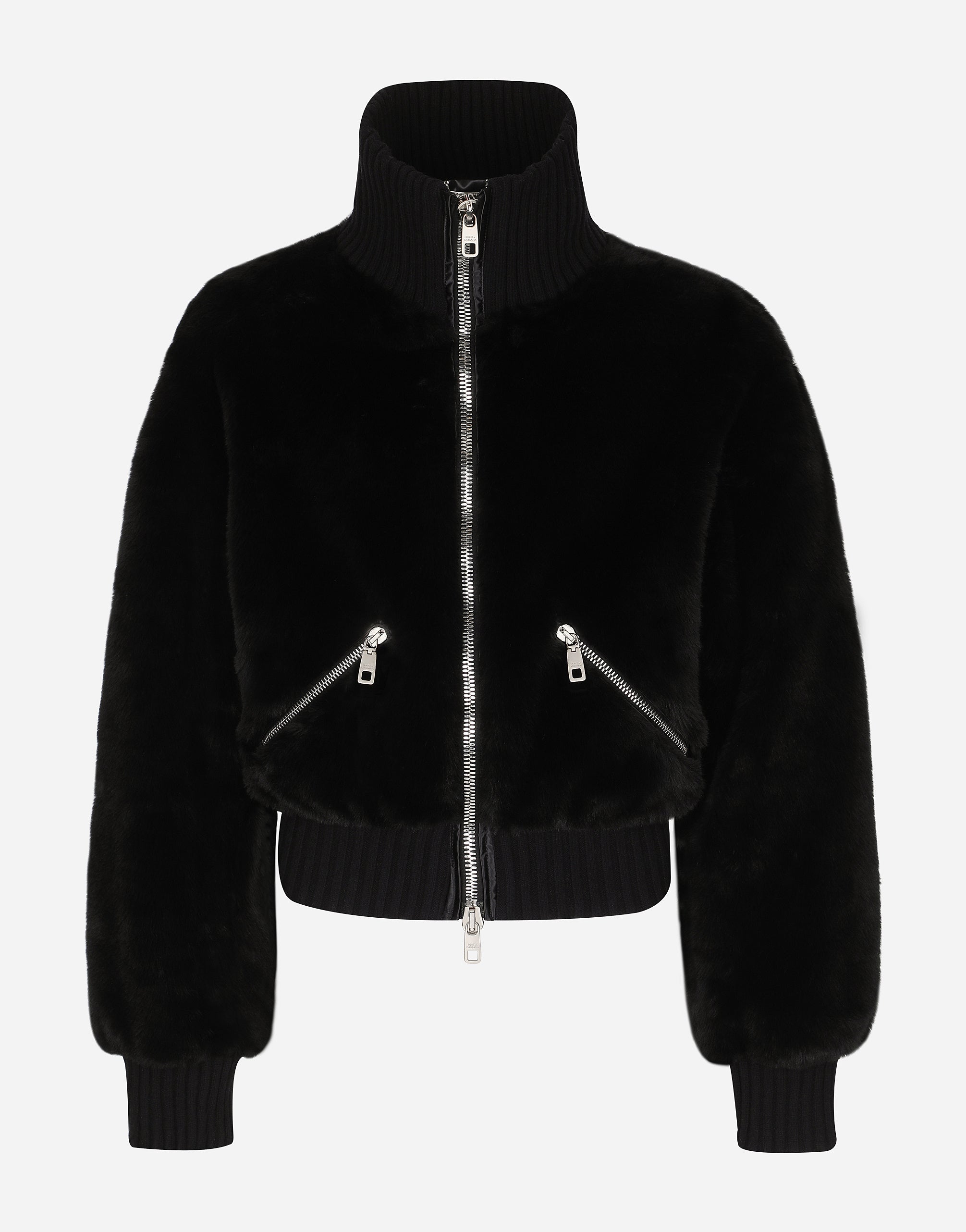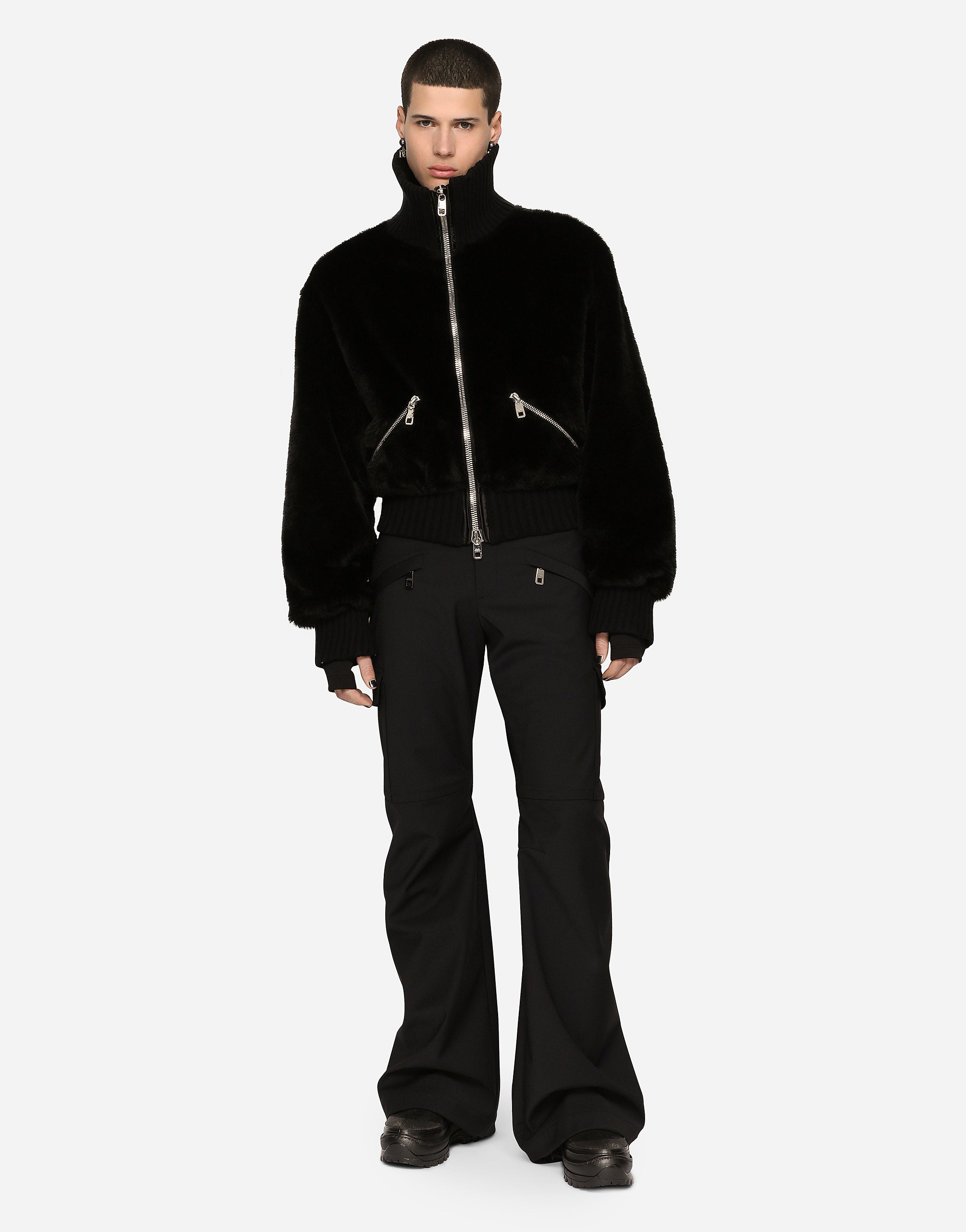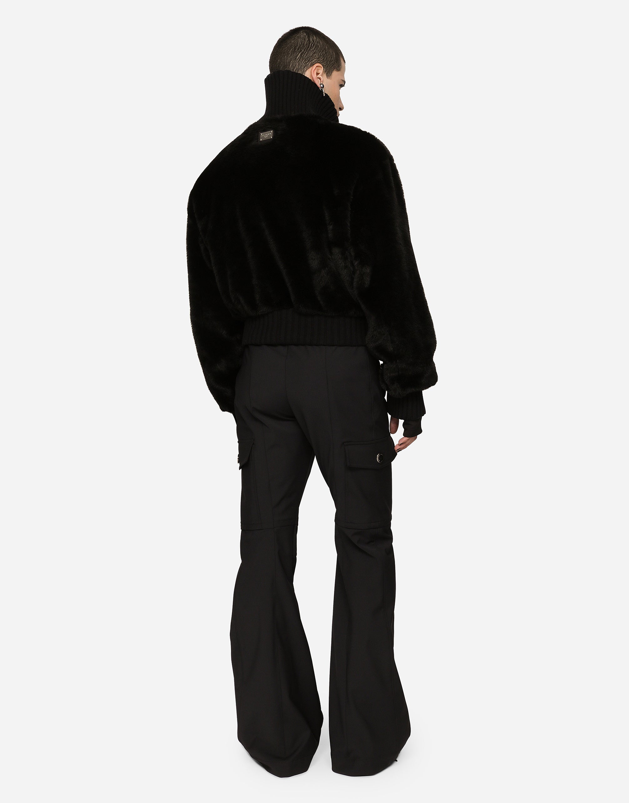 The FW22 Fashion Show was built around new proportions and geometries and features silhouettes that have been created with technical fabrics, graffiti prints and all-over logo detailing. A collection that looks to the future, conveying the current world through technology, the metaverse, the virtual world and the younger generations. High-necked faux fur jacket. • Light insulated padding on the interior • Regular fit • Front zipper fastening • Outer welt pockets with zipper • Stretch knit neck, hem and cuffs • Lined • The piece measures 63 cm from the rear collar seam on a size IT 48 • The model is 185 cm tall and wears a size IT 48 • Made in Italy
