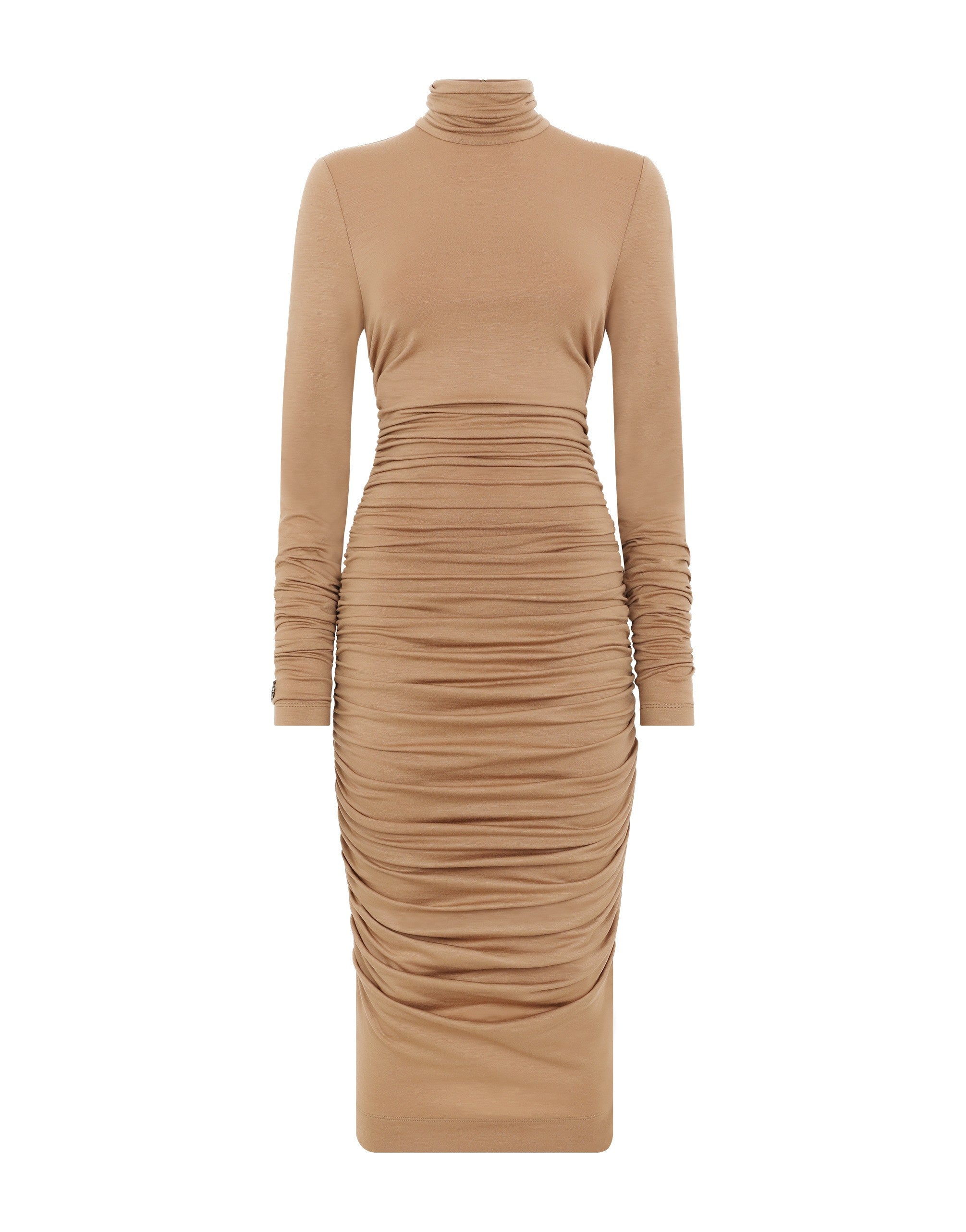 The Cammello collection represents emotion, sensuality, but also balance. Neutral, warm and timeless camel overlays the iconic leopard print, creating a new take on relaxed, enveloping femininity. This world is inhabited by various nuances, ranging from camel to warm orange hues and even various spice colors. A collection that is the veritable expression of casual, urban style, perfect for different occasions - unmistakable, unique and sophisticated. Stretch jersey wool calf-length dress with metal DG logo: • Beige • High neck • Long sleeves • Unlined • Rear zipper and hook-and-eye fastening • The piece measures 75 cm from the waist down on a size IT 40 • The model is 175 cm tall and wears a size IT 40 • Made in Italy
