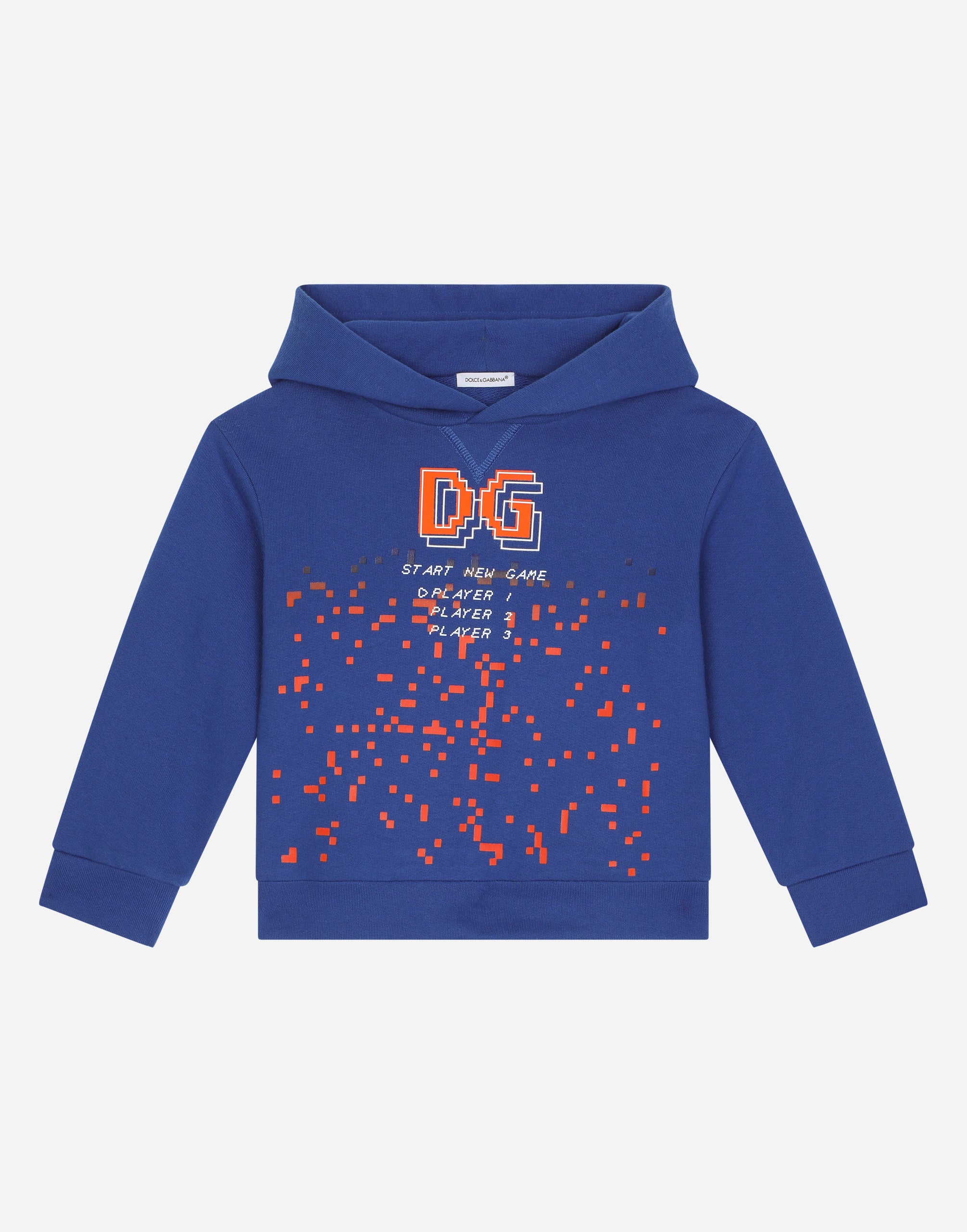 With the Gamers Collection, Dolce&Gabbana is exploring a new world and creating a collection that meets a desire for comfort and creativity while gaming. Soft volumes, bright colors and graphic details become the perfect complements outdoors too, inventing a super-colorful capsule collection that conveys a new lifestyle concept for young people. Jersey hoodie with DG Gamers print: • Oversize fit • Neck with lined hood • Long sleeves • Rubberized DG logo print on front • Unlined • The item in the size 3 years measures 32 cm from the shoulder seam • Made in Italy The difference in the print placement that you may find on this product is a feature of Dolce&Gabbana’s “Handmade” pieces. A detail that makes every garment or accessory unique and exclusive.