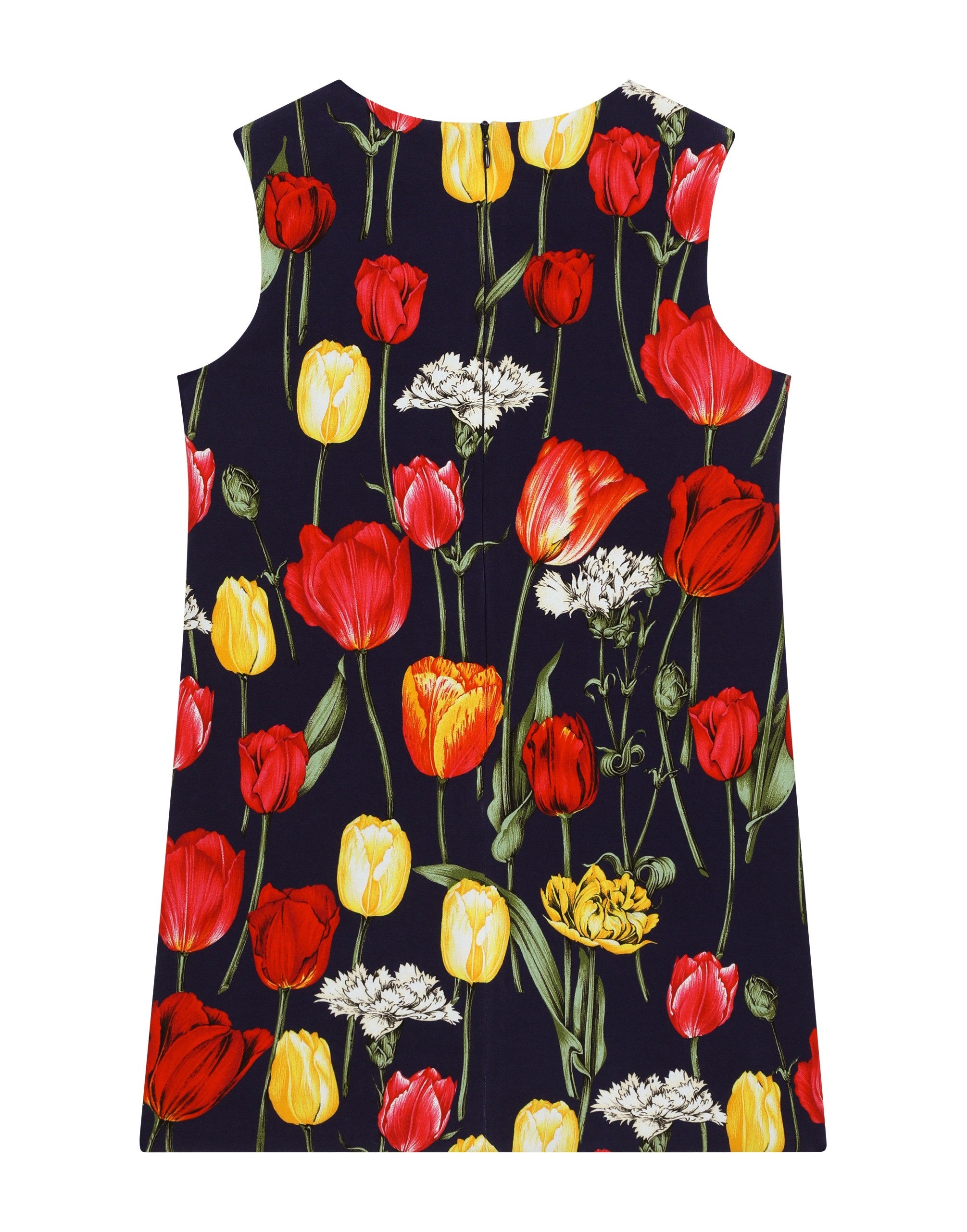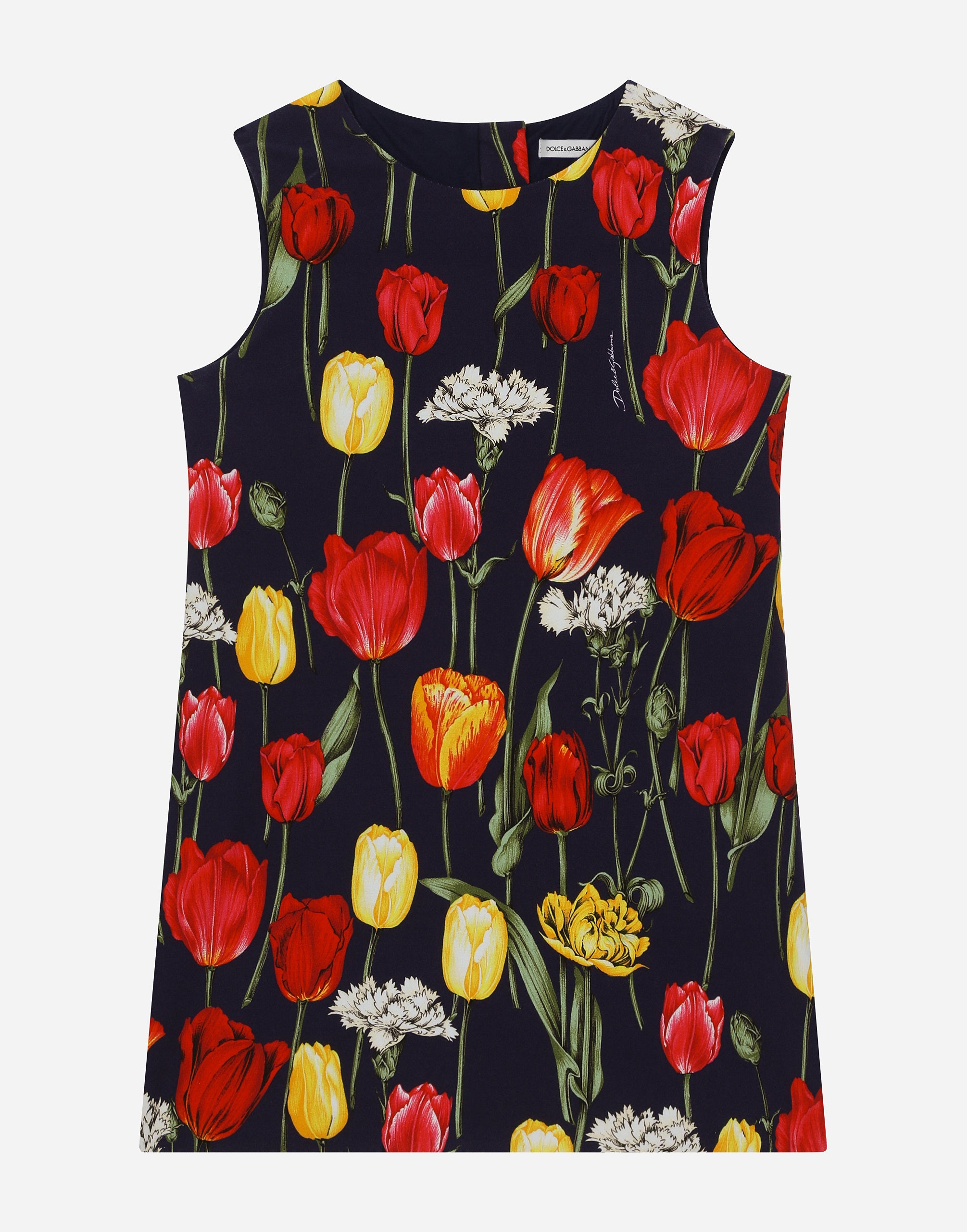 The 2024 Boy’s and Girl’s Back to School collection is reworking the Anglo-Saxon imagery of British boarding schools in full Dolce&Gabbana style. From floral prints to bright hues, like ruby red, as well as more subdued tones of navy blue, white and stone gray, the collection delivers a mix of pairings, embroidered details and pop prints that will add some verve to closets that merge functionality with fun. A tribute to freedom of movement that invites children to be bold and carefree when mixing and matching the pieces. Cotton interlock dress with all-over tulip print: • Multi-colored • Regular fit • A-line • Round neck • Sleeveless • Concealed zipper fastening on the back • Placed print • The item in the size 6 years measures 61.3 cm from the shoulder seam • Made in Italy The difference in the print placement that you may find on this product is a feature of Dolce&Gabbana’s “Handmade” pieces. A detail that makes every garment or accessory unique and exclusive.