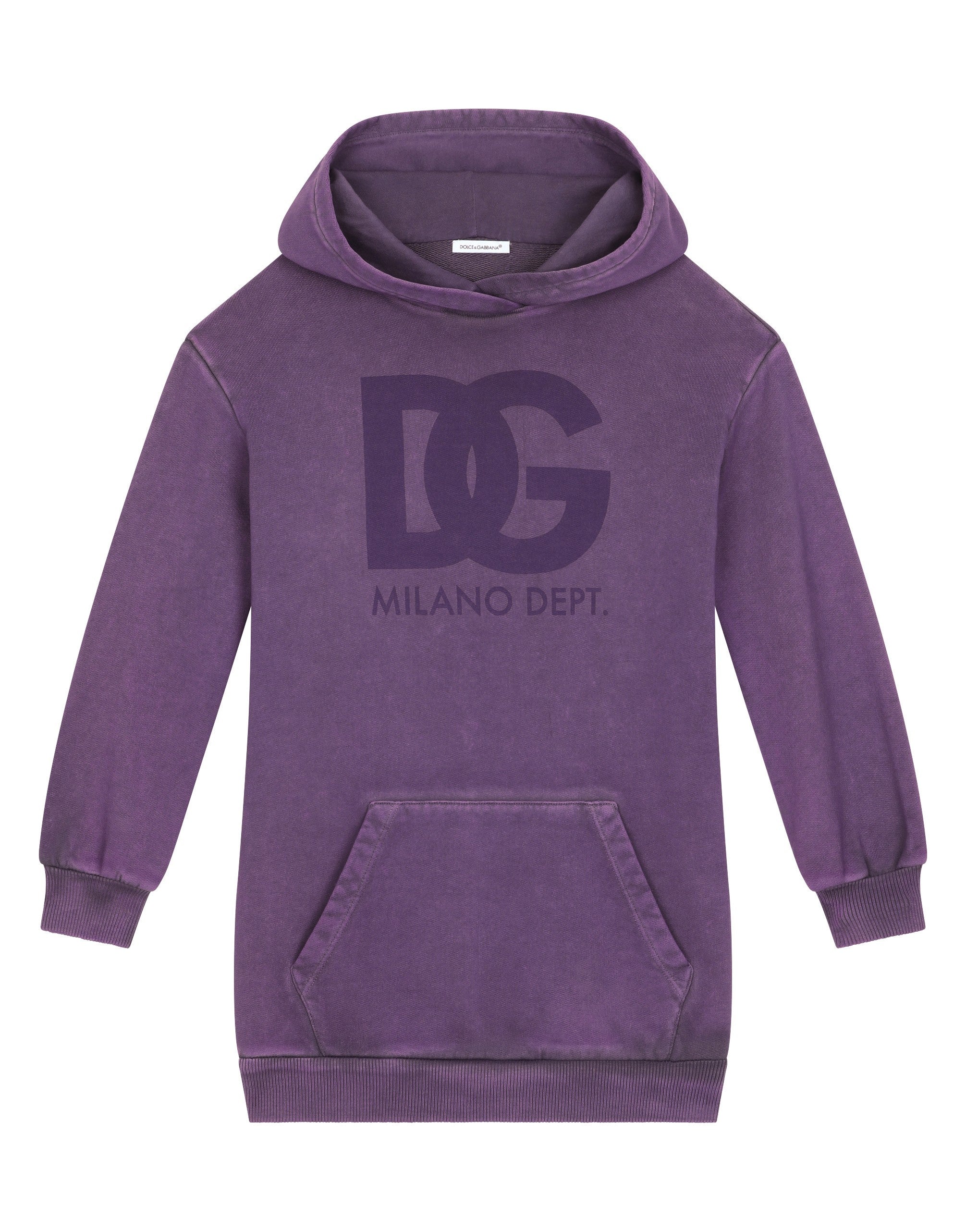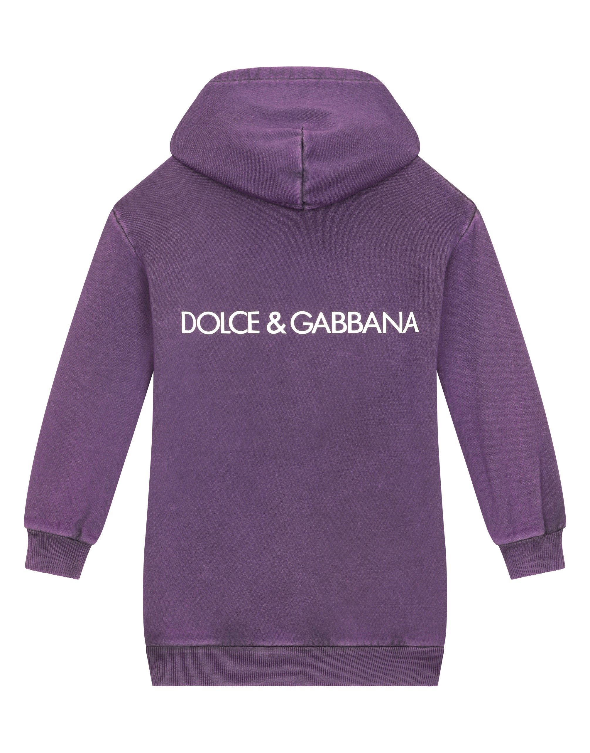 The inspiration is LA, one of the most beautiful, diverse and varied cities in the world. The collection presents a closet distinguished by an attitude that enhances the mix and match present in this incredible multifaceted city. Black, gray, brown, lilac, purple and red merge with oversize shapes packed with special treatments, recreating looks that are perfect for an immersive experience in the city’s lifestyle a place where fashion and innovation come together to create a new expressive language. Washed-look cotton jersey hoodie dress with DG logo print: • Purple • Oversize fit • Neck with hood • Long sleeves • Stretch knit hem and cuffs • Pouch pocket on the front • The item in the size 6 years measures 61.5 cm from the shoulder seam • Made in Italy