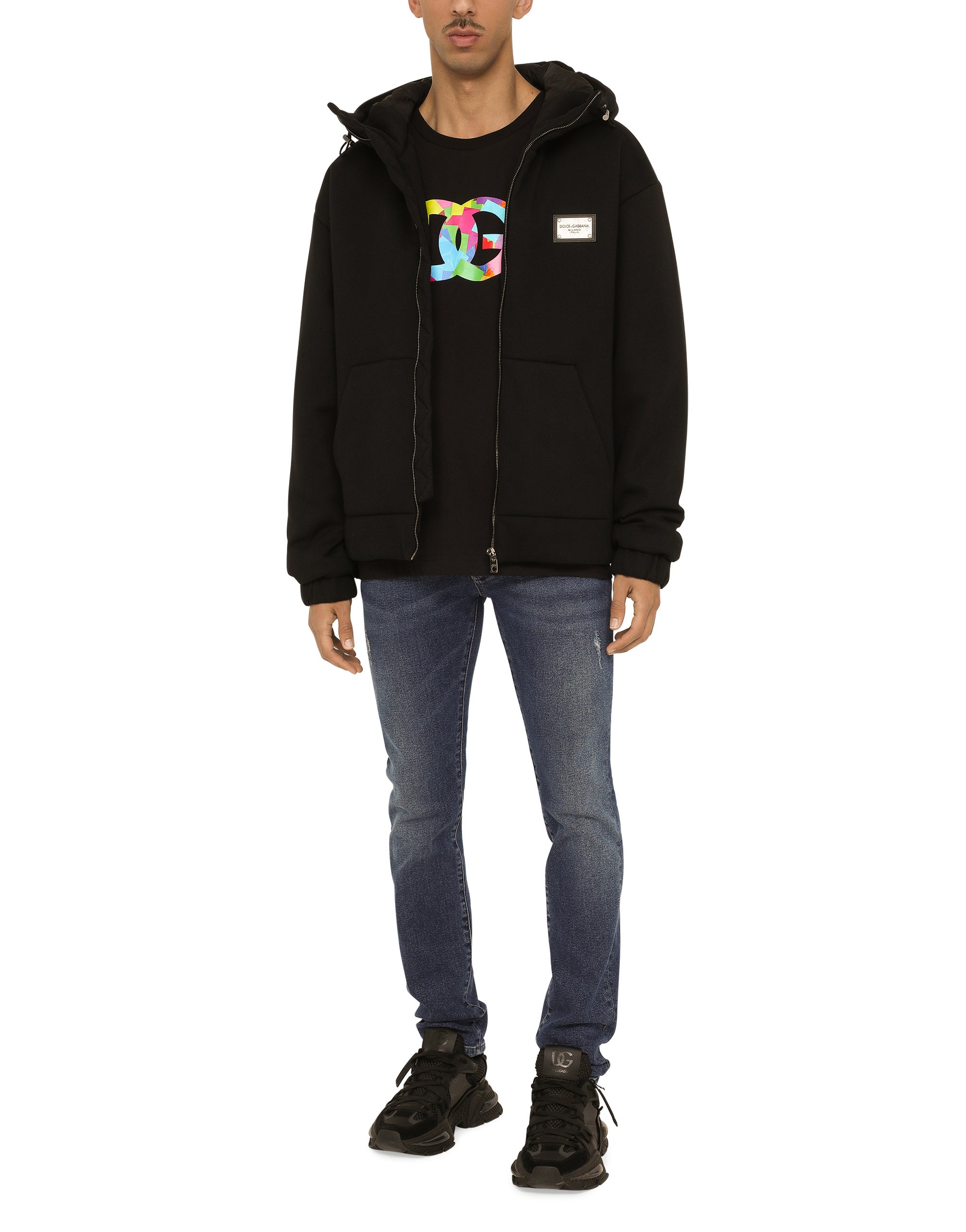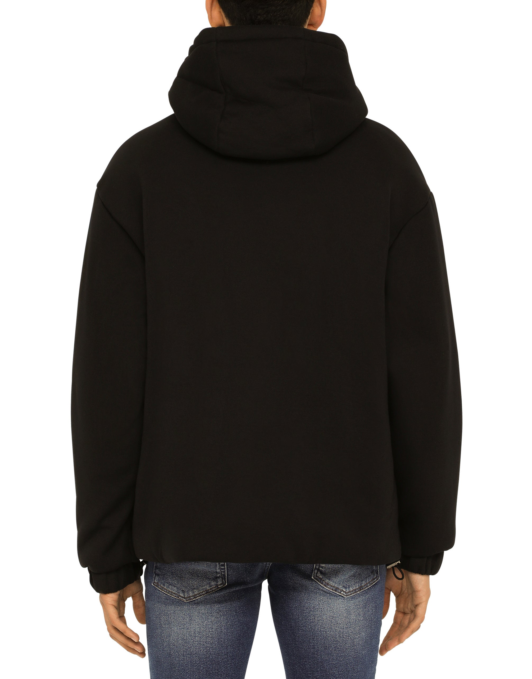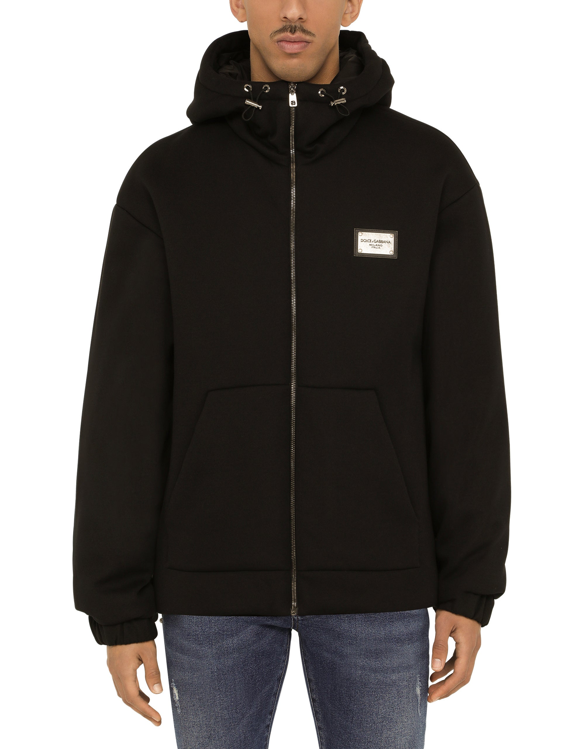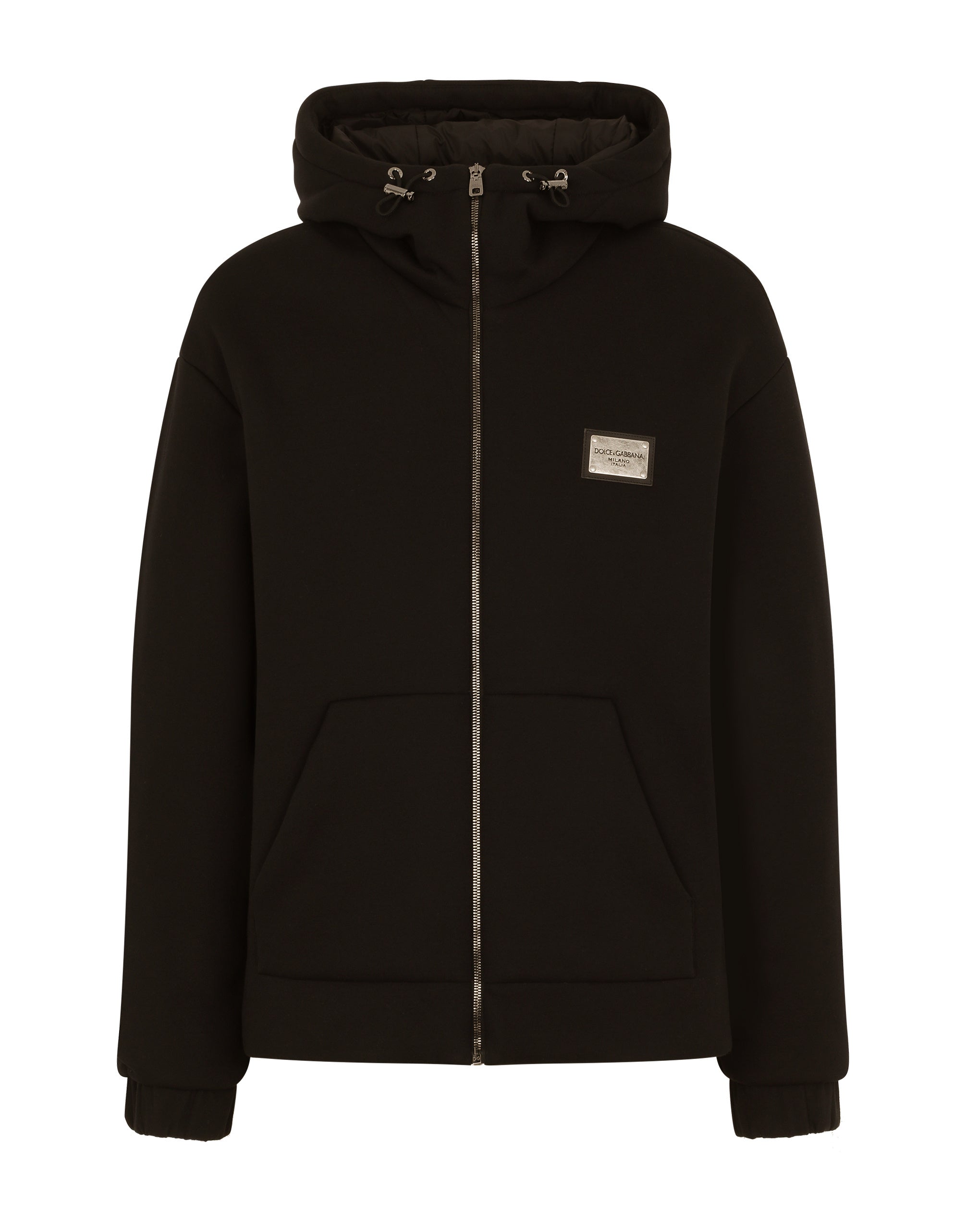 Sweatshirt made of technical cotton jersey with Dolce&Gabbana metallic logo plate: • Regular fit • Hood and hem with drawstring and adjusters • Elastic knit hem and cuffs • Lined • Black • The item measures 69 cm from the back neckline on a IT size 48 • The model is 185 cm tall and is wearing an IT size 48 • Made in Italy External composition: 70% Cotton 30% Polyamide • Internal composition: 100% Polyester